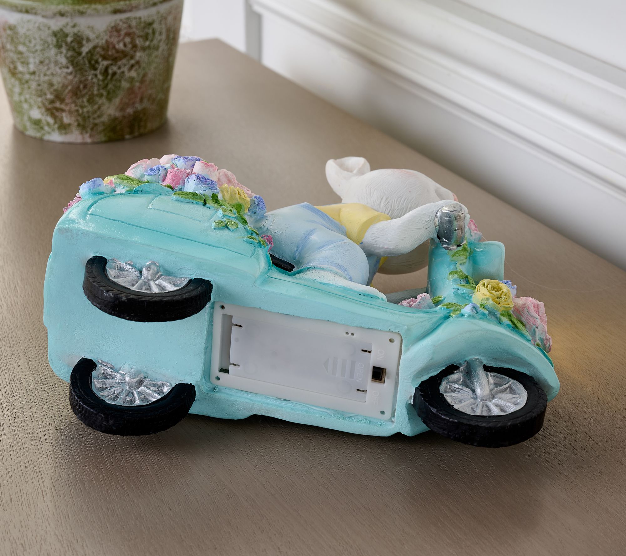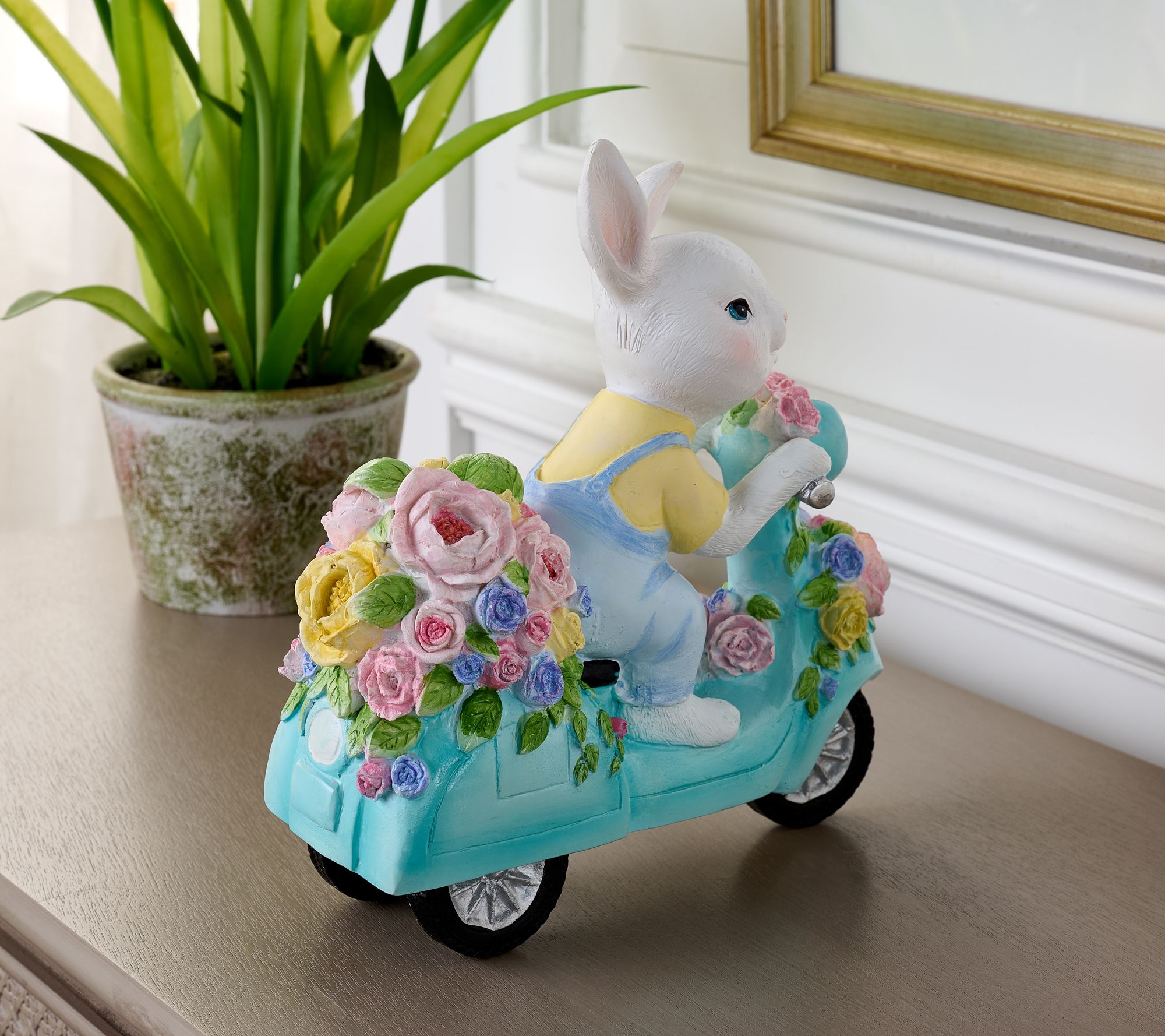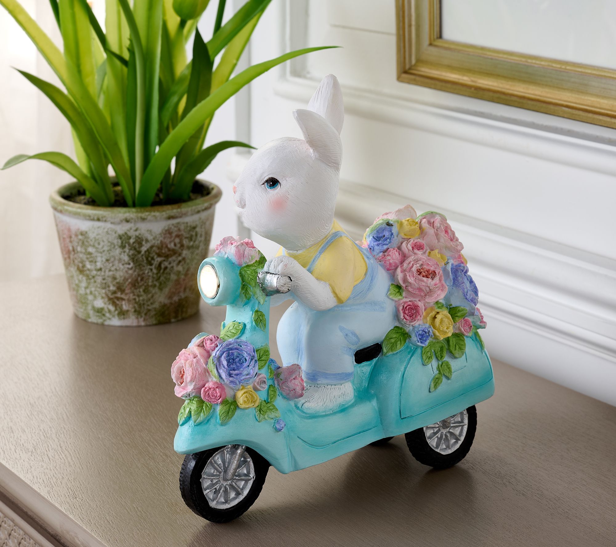 Hop full-speed ahead into spring with this delightful bunny figure, cruising around in style on a scooter adorned with charming flowers. The perfect piece to brighten any room, its headlight adds an enchanting glow to the seasonal scene. From the Valerie Parr Hill Collection.