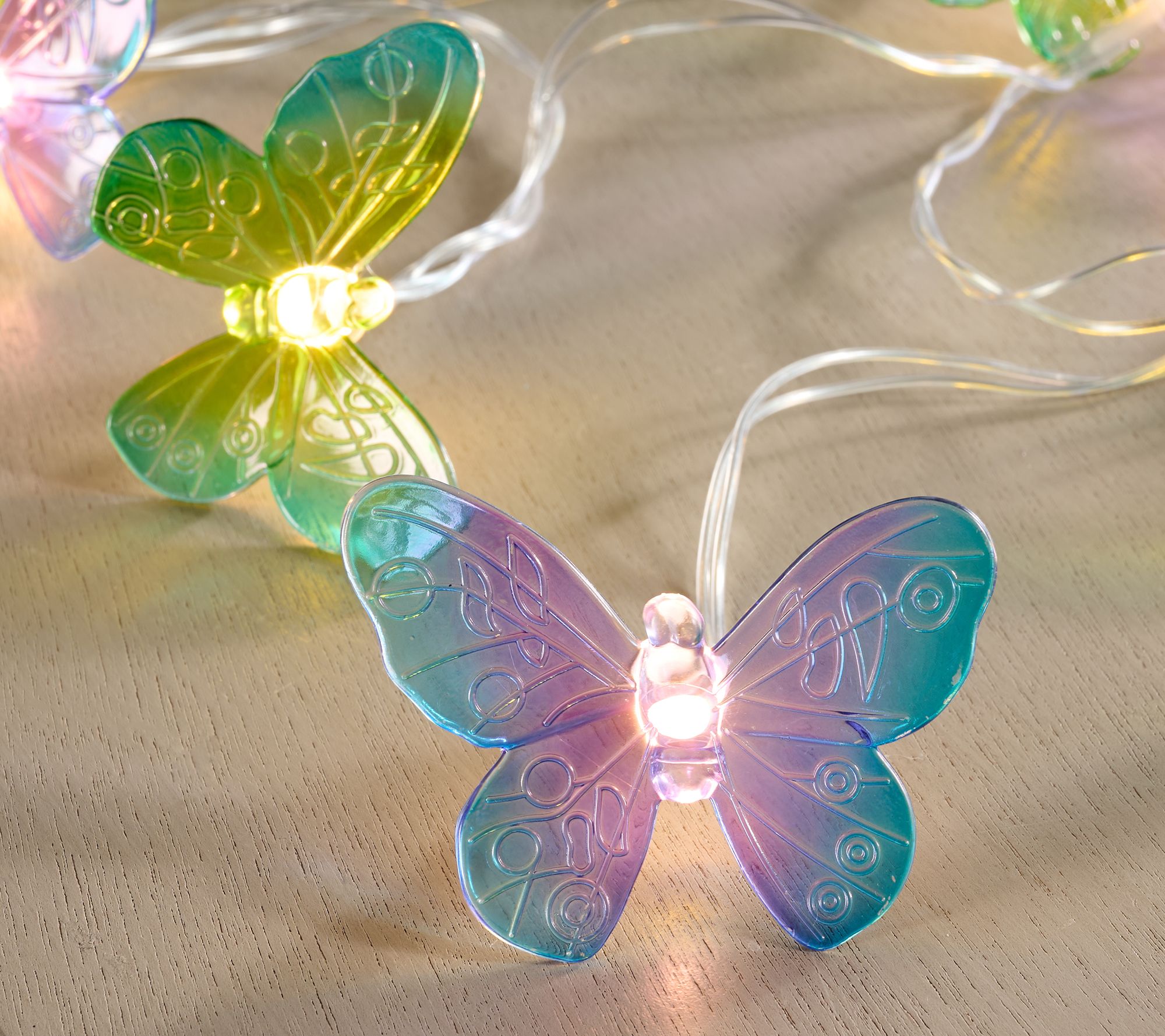 Create a cheerful accent in your home with this butterfly light string, featuring green and lavender butterflies dancing across ten softly glowing lights. Perfect on a mantel or wrapped around a mirror, its timer function keeps spaces gently lit for evening gatherings or cozy nights in. From The Valerie Parr Hill Collection.