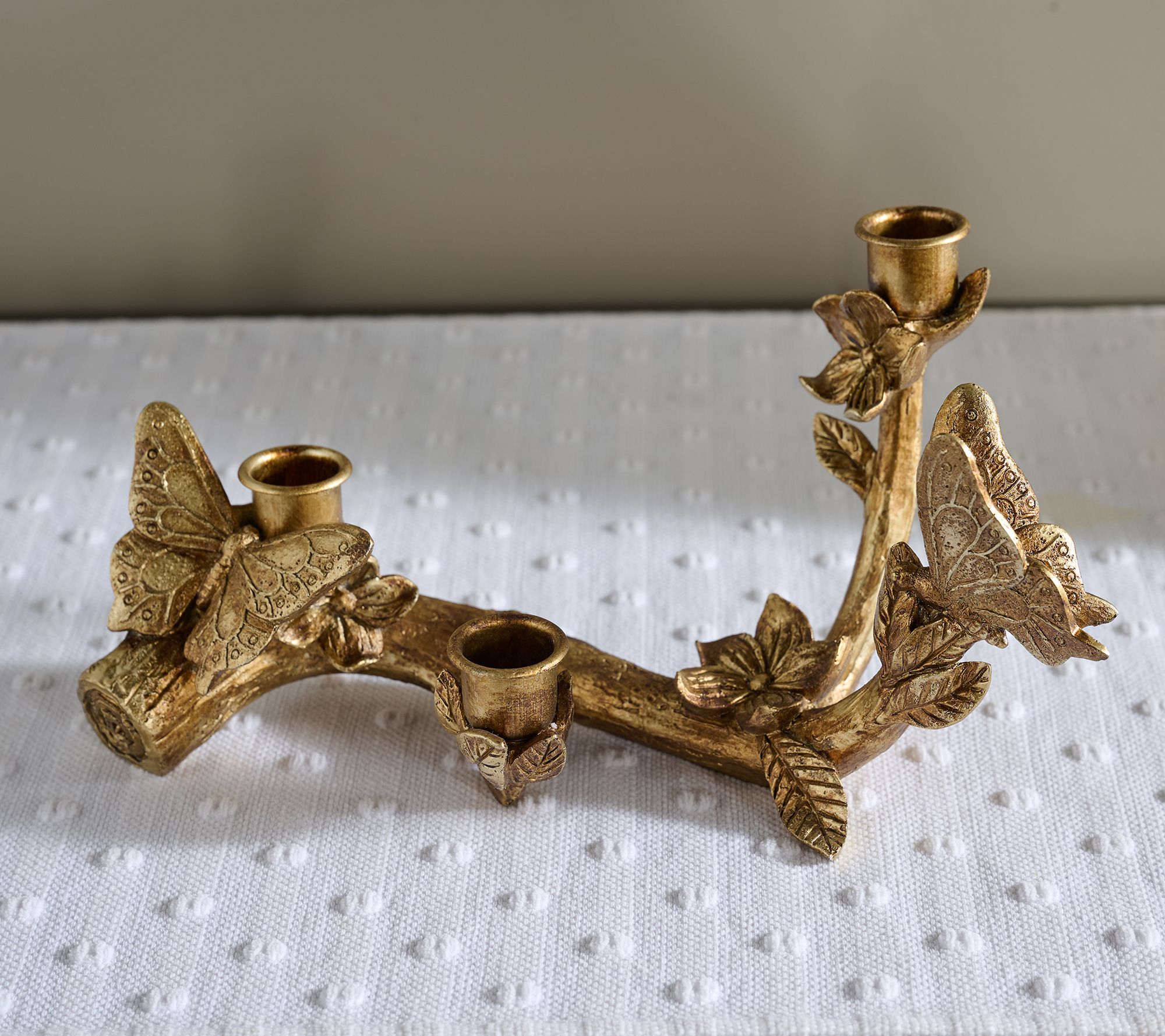 Branching out with graceful butterflies and blossoming flowers, this taper candle holder brings nature-inspired charm to your home. Its sculptural metal and resin design with an antiqued finish serves as a stunning centerpiece for dinner parties, celebrations, or quiet evenings alike. From the Valerie Parr Hill Collection.