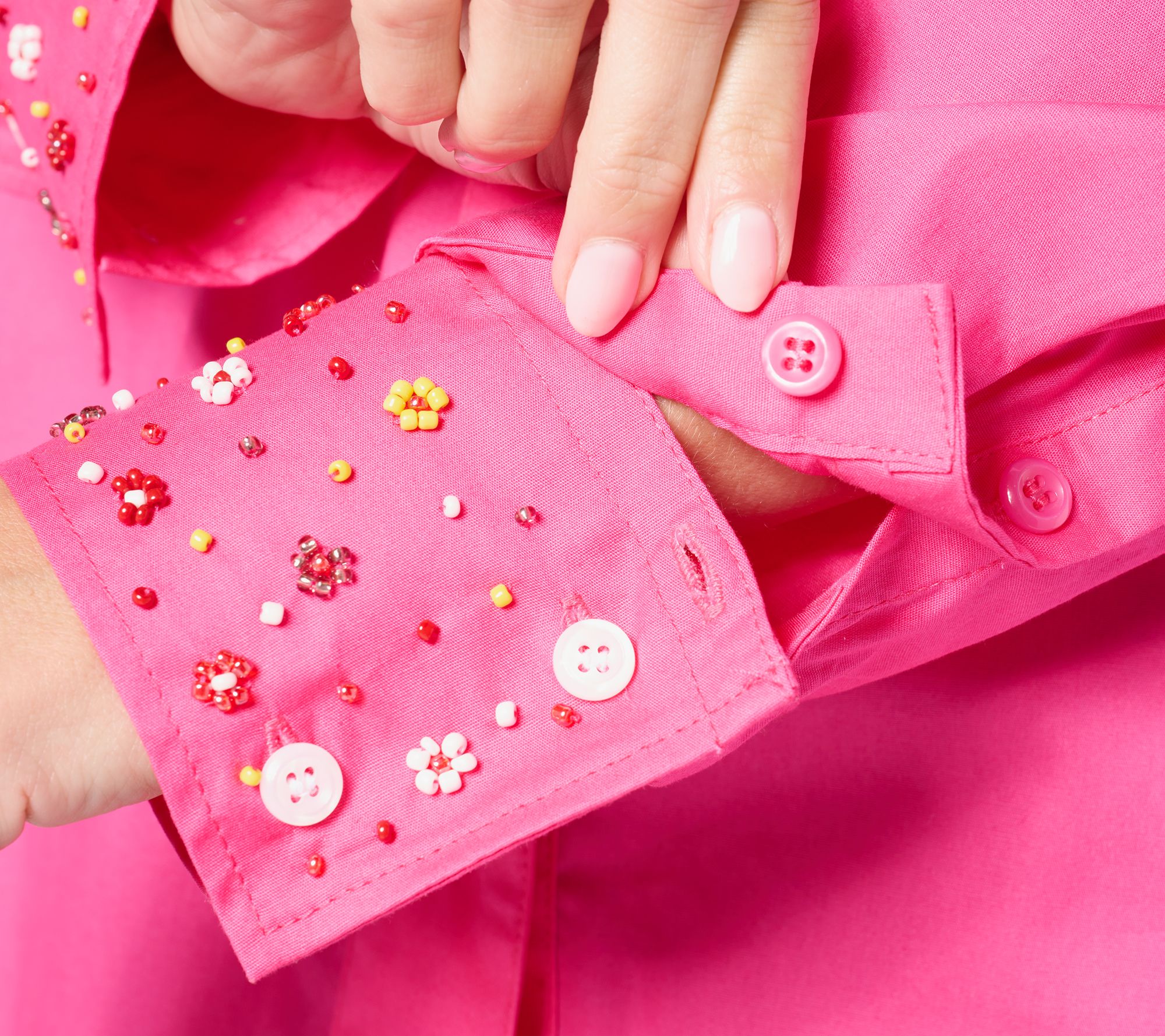 • Features: button holes along back neck; button closure on cuffs; beaded design