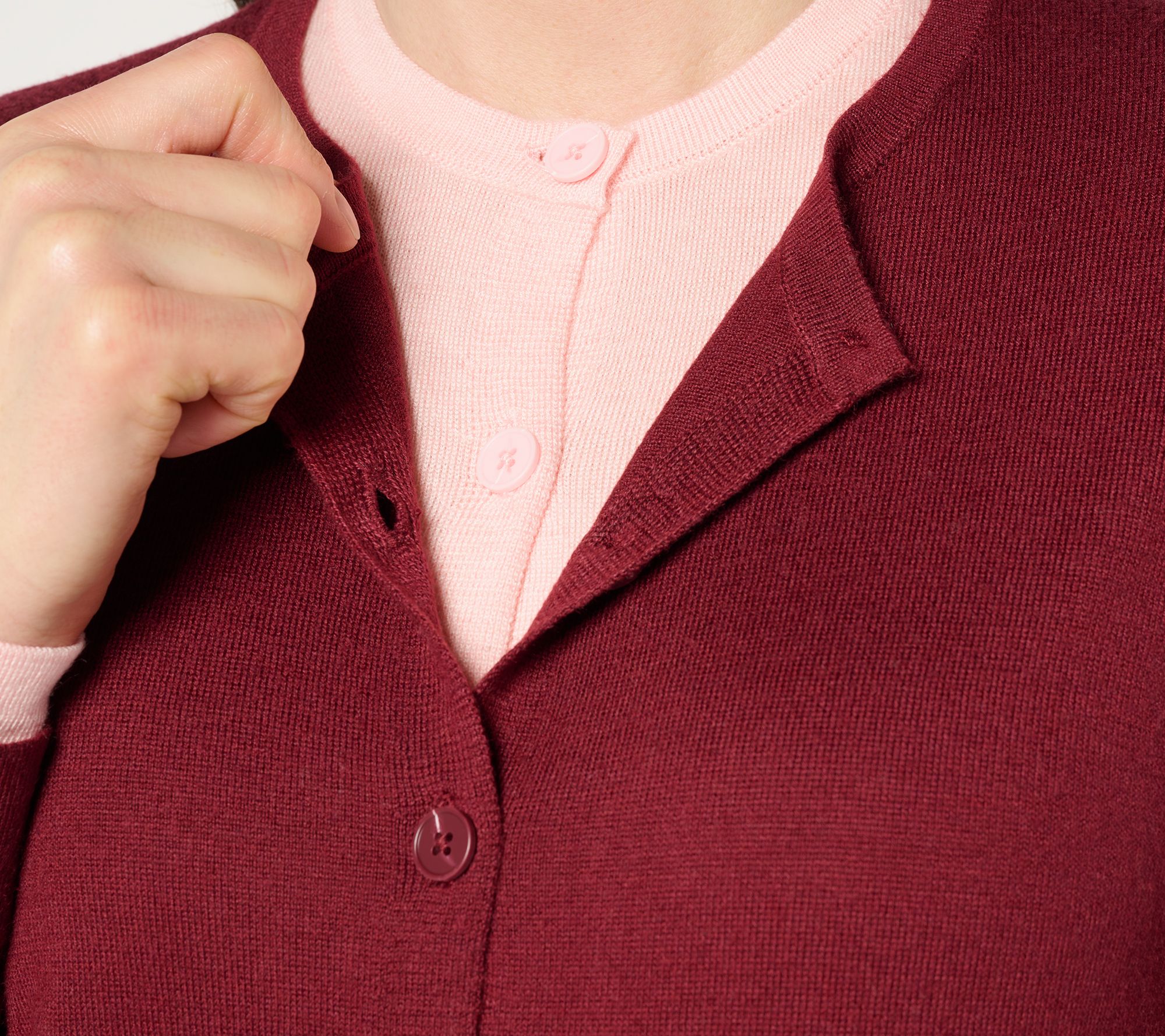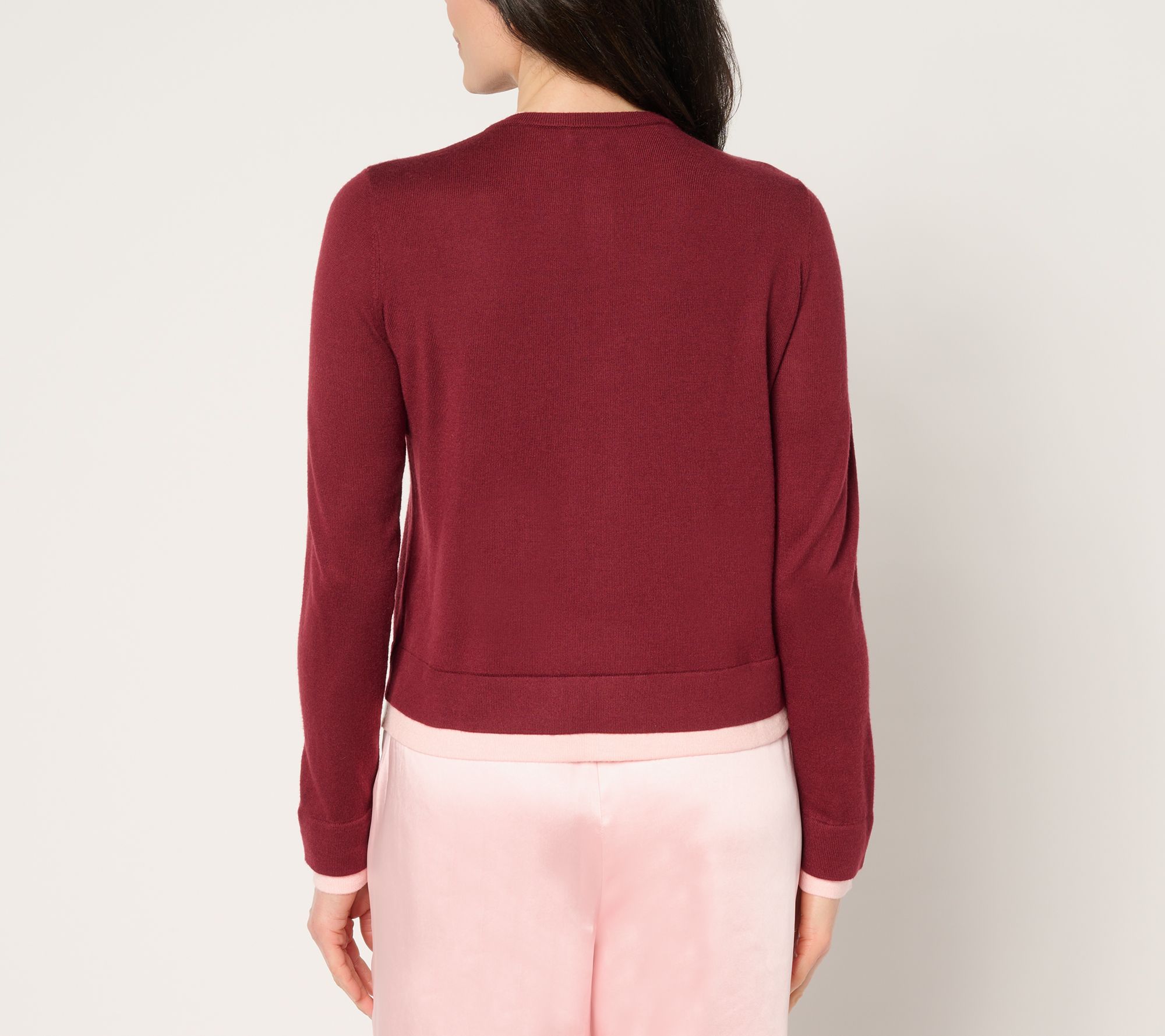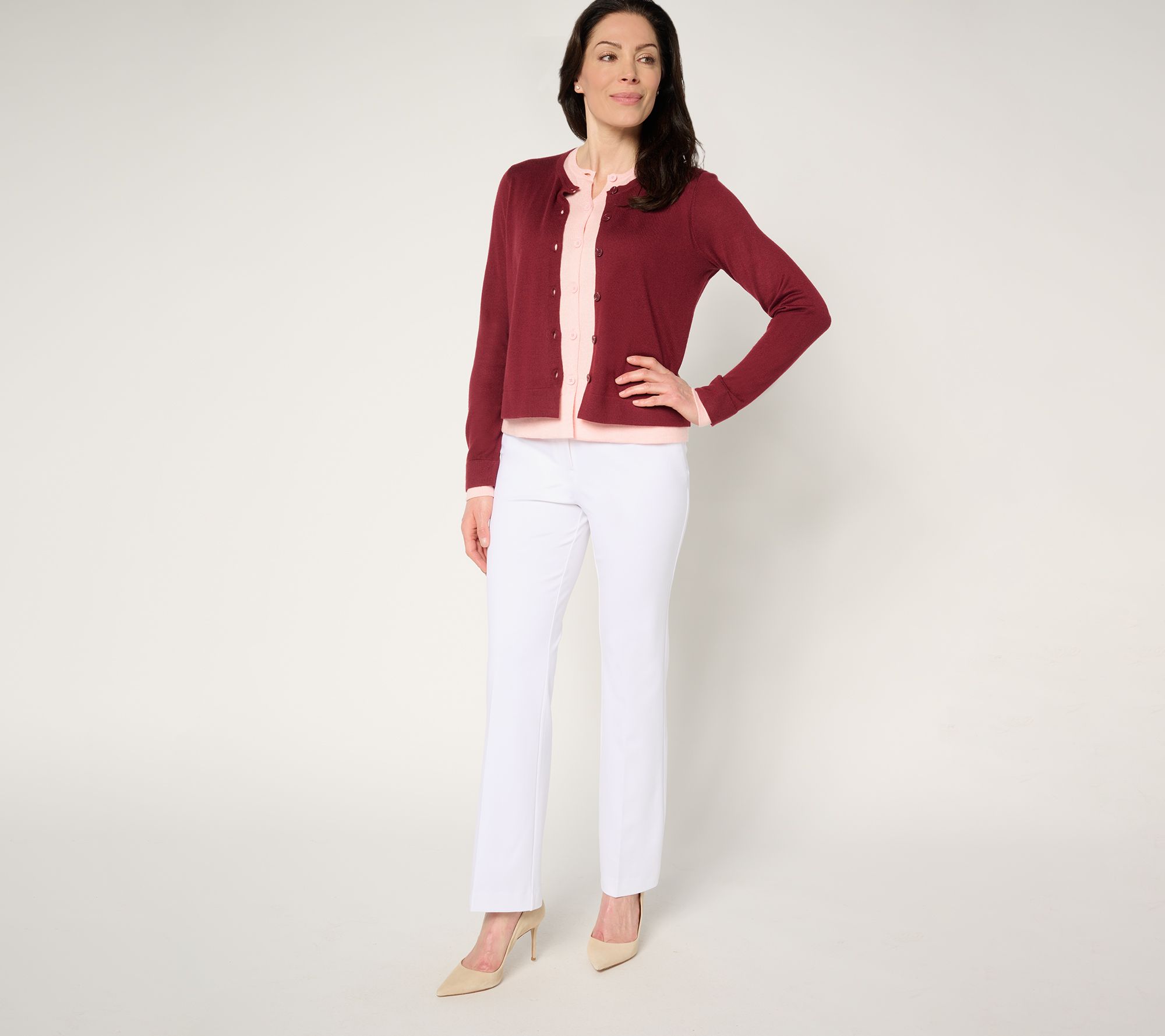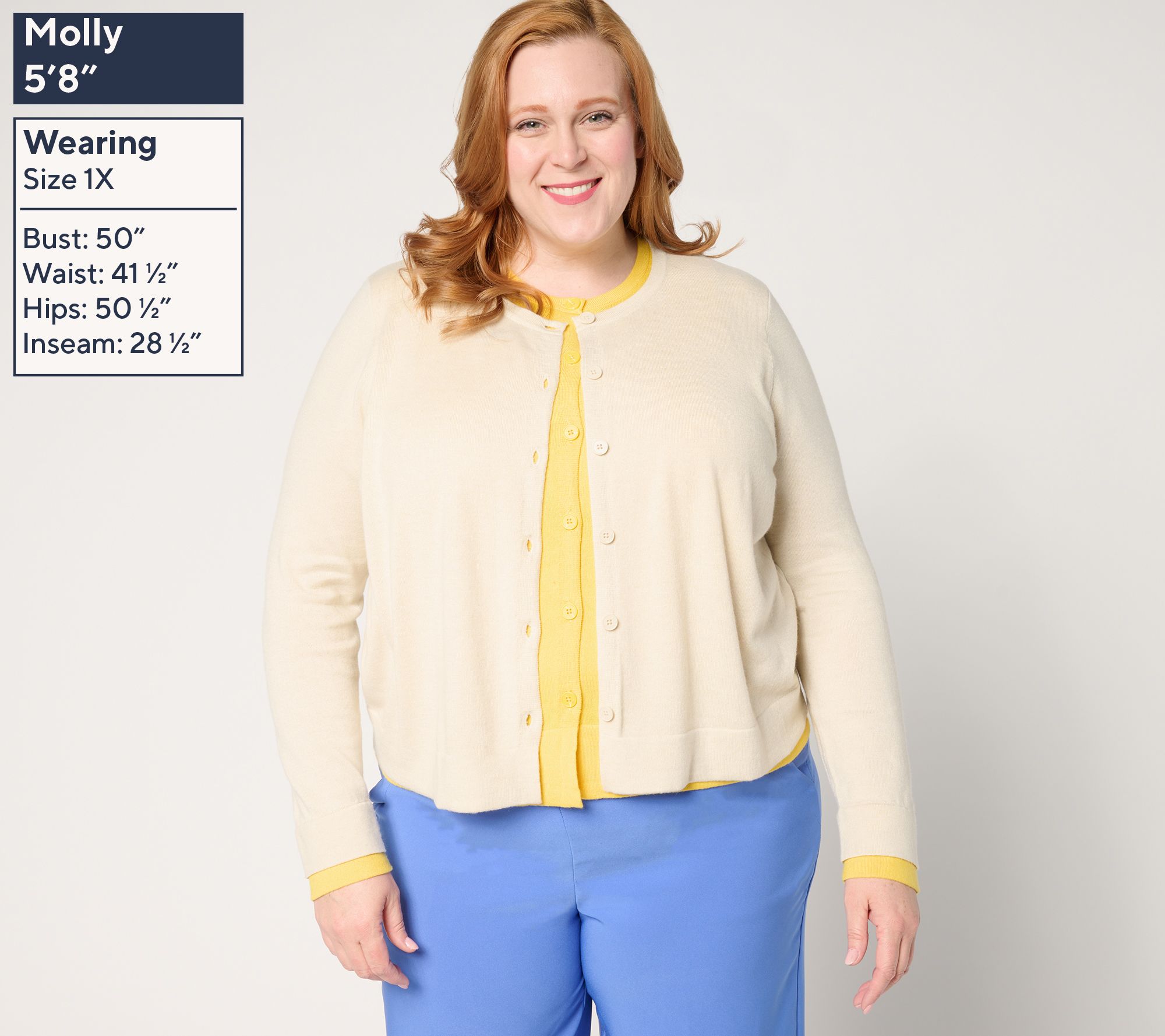 Add a chic touch to your casual outfit with this double layer illusion cardigan and sweater. The semi-fitted design offers a flattering look, while the tubular jersey neck trim and full needle rib placket add stylish details. Perfect for layering over your favorite tops. From Stacy London.