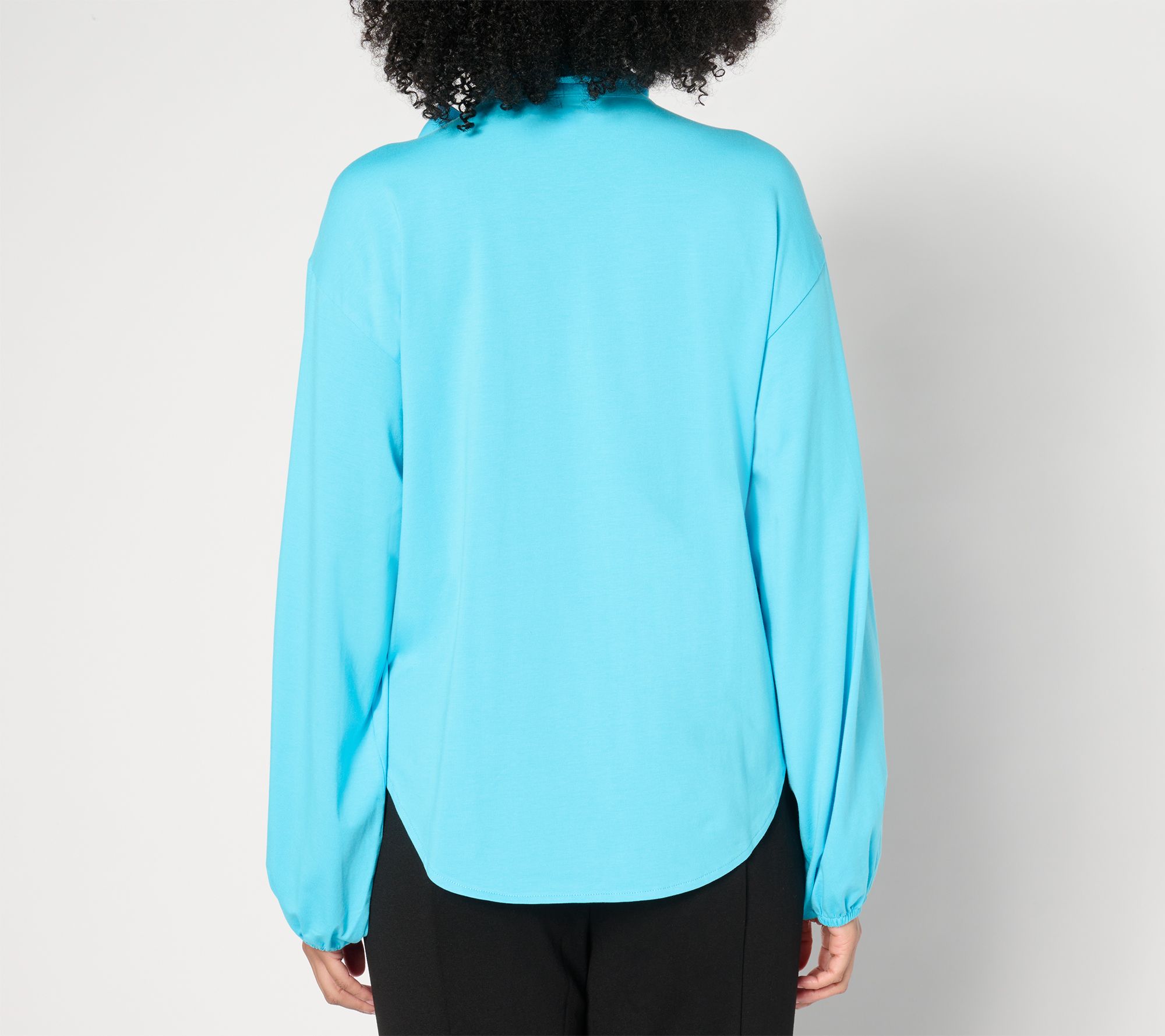 • Features: bow at collar, long sleeves with elasticated opening, hidden front button placket, circle bend-back hem