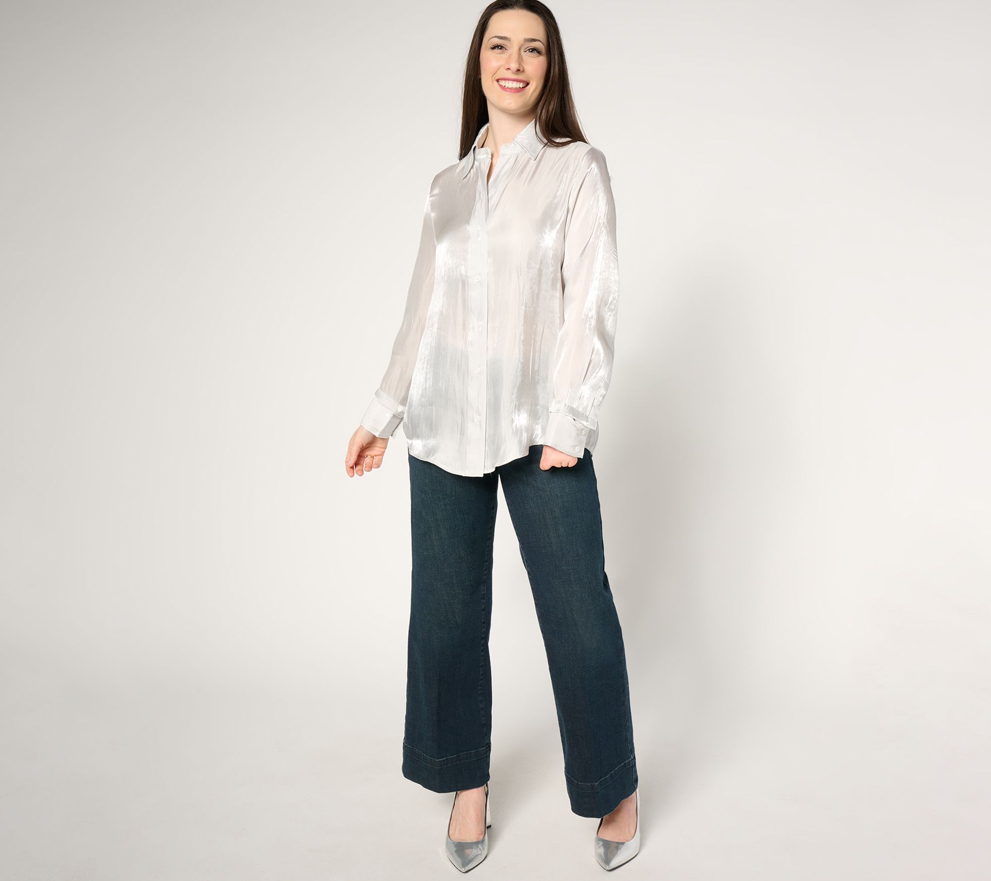 Just what your wardrobe needs -- a shiny metallic blouse that goes with anything. The removable collar and cuffs offer versatile compatibility, making it a truly adaptable piece you'll wear season after season. From by Stacy London.