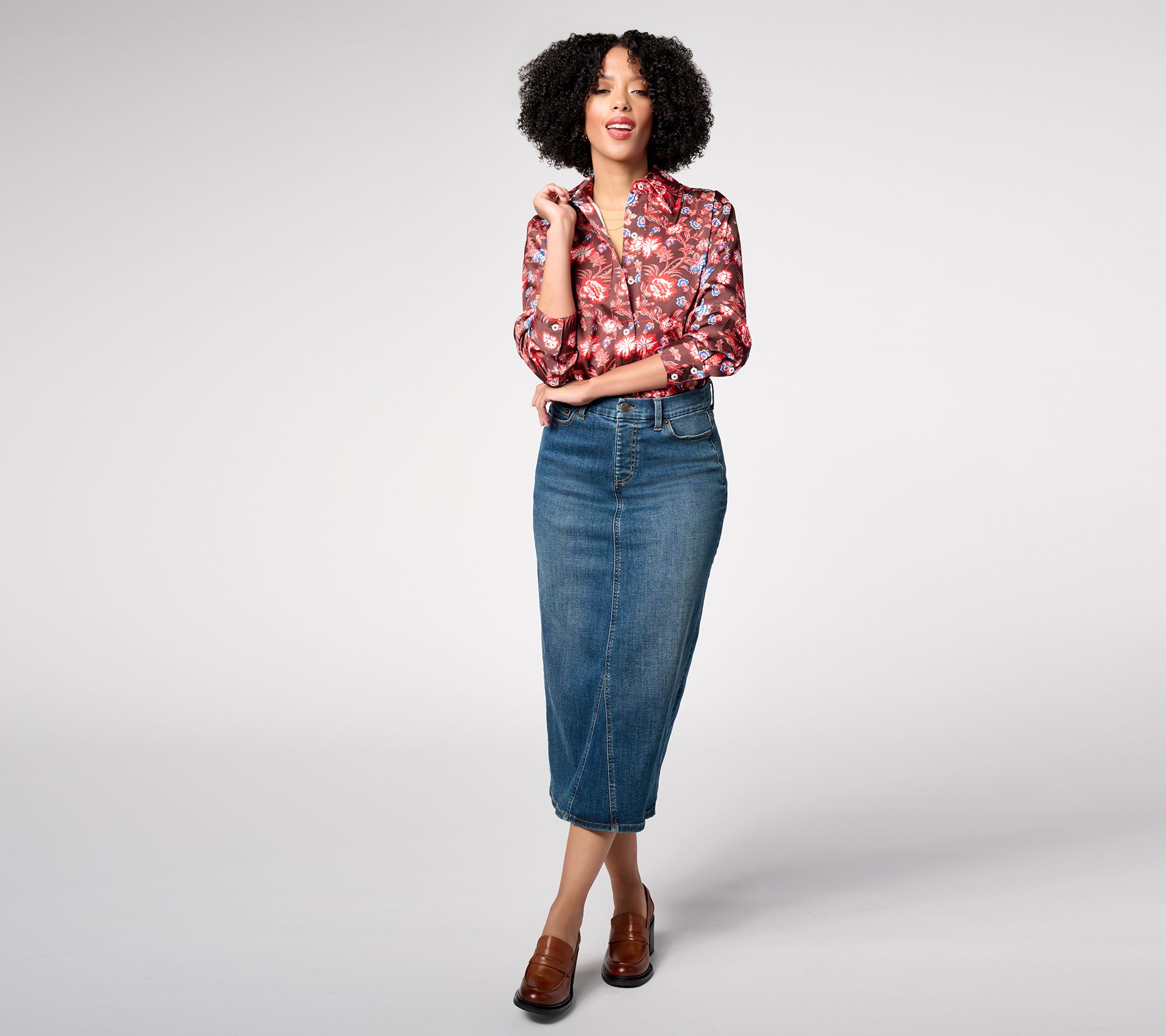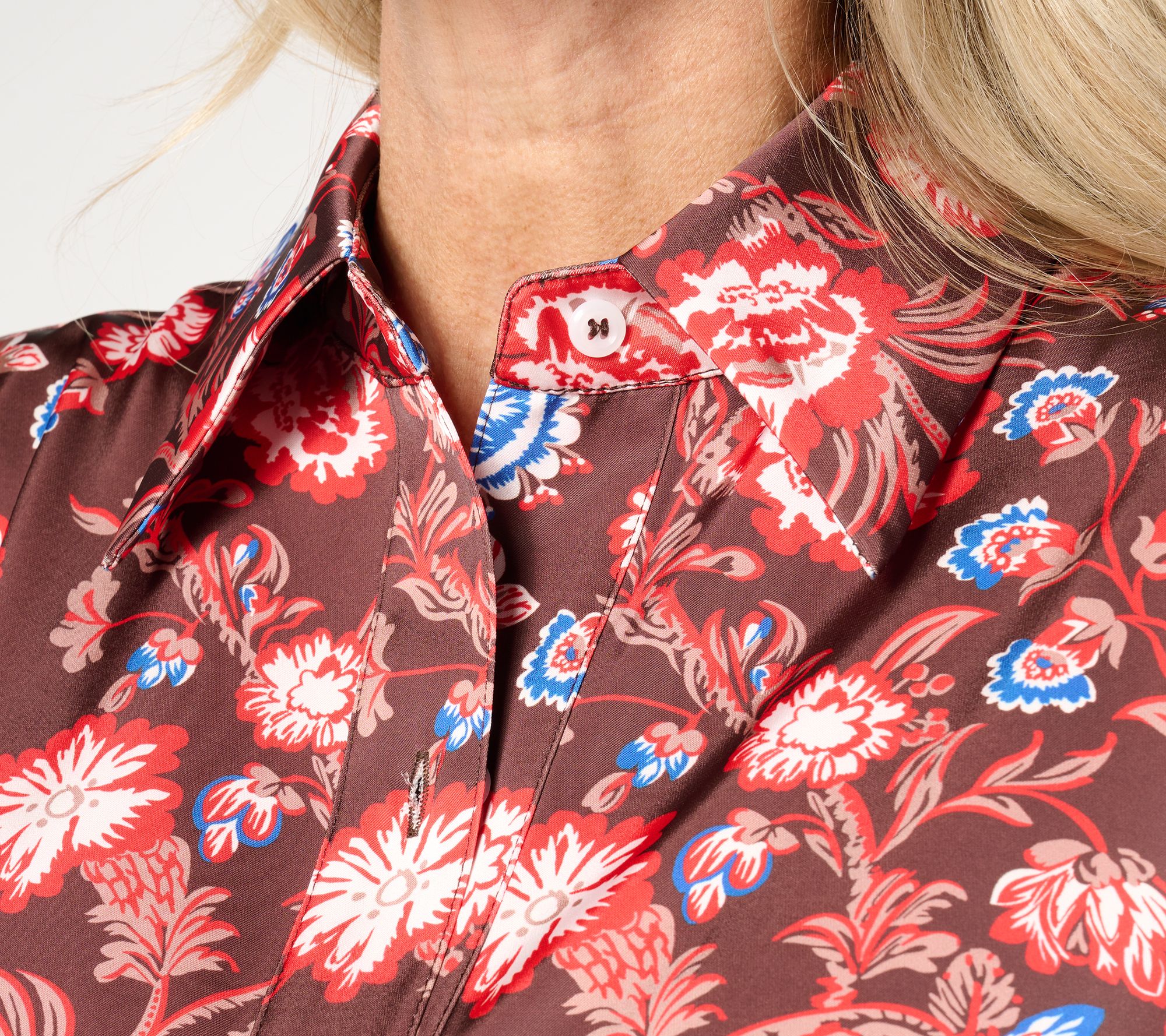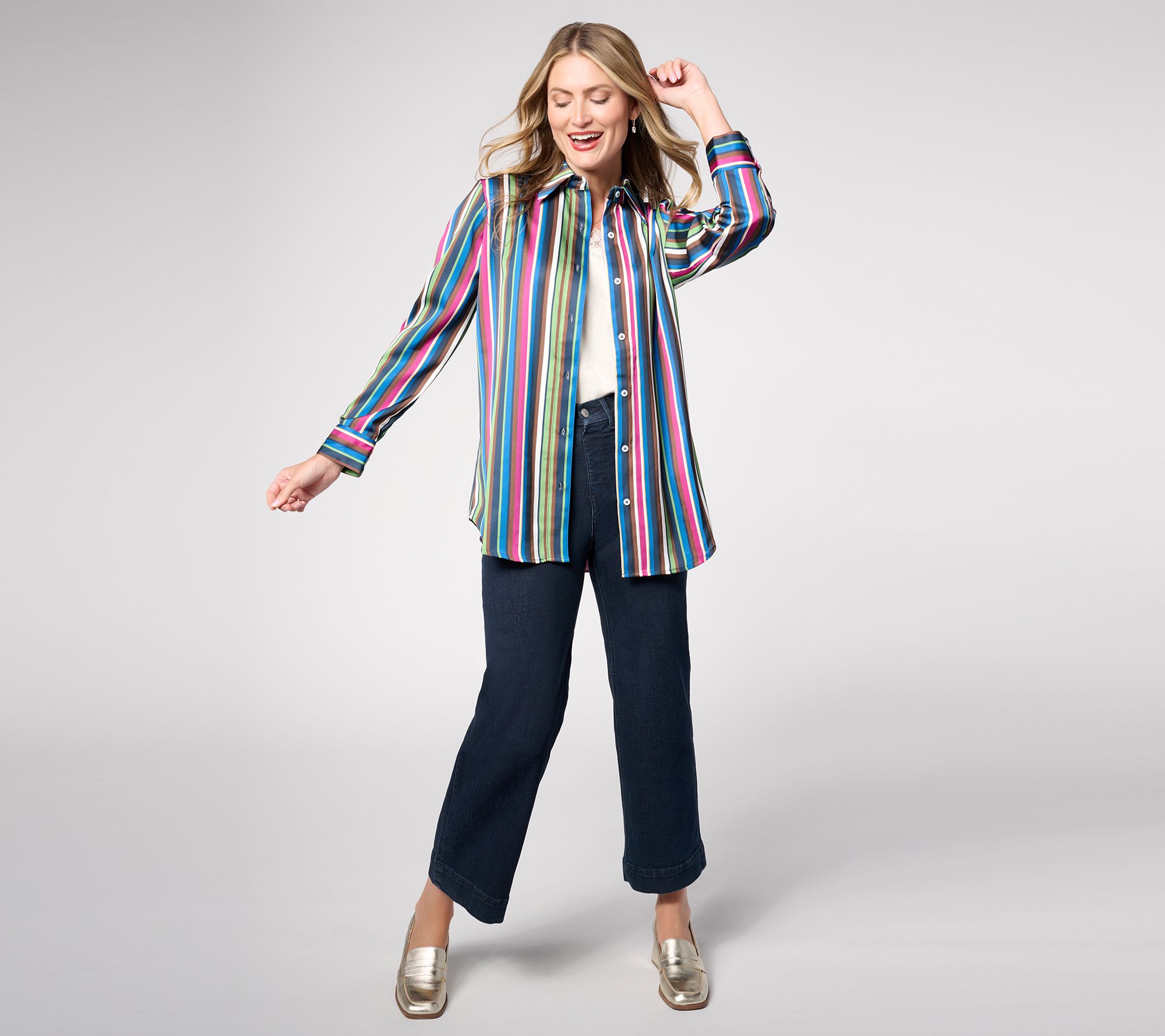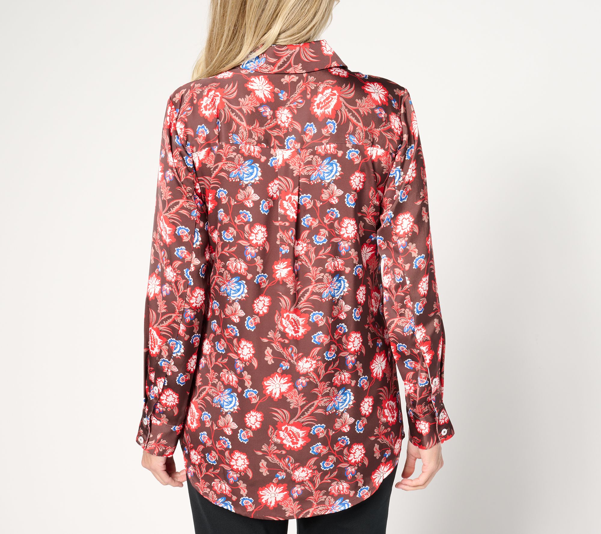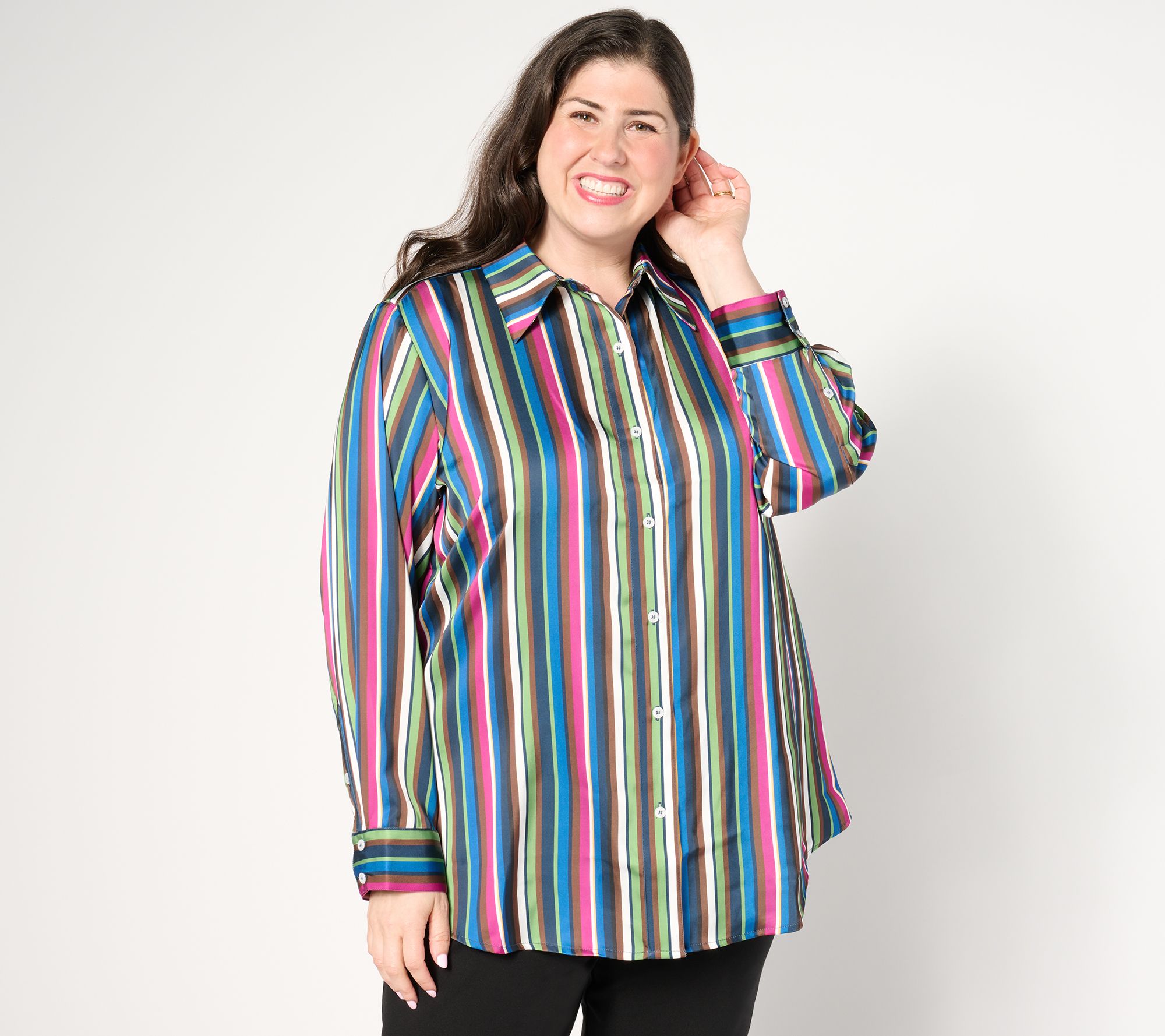 Playful patterns are just the thing to brighten up your wardrobe (and your mood!). This satin button-front shirt gives the classic silhouette a wonderfully whimsical makeover, while keeping you looking smartly styled. From by Stacy London.