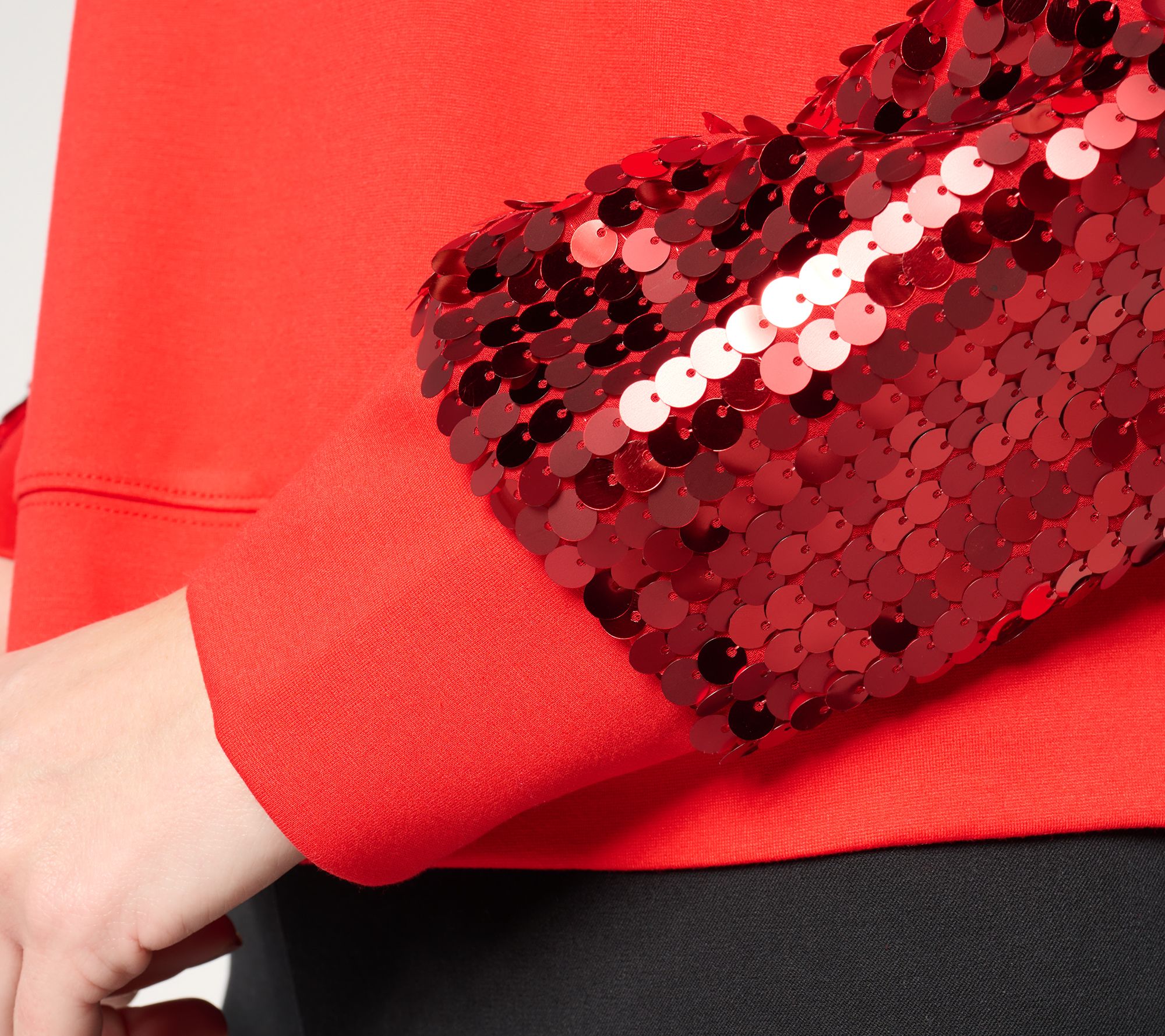• Features: sequined embellished sleeves, neckband with topstitch, two-ply cuff and hem