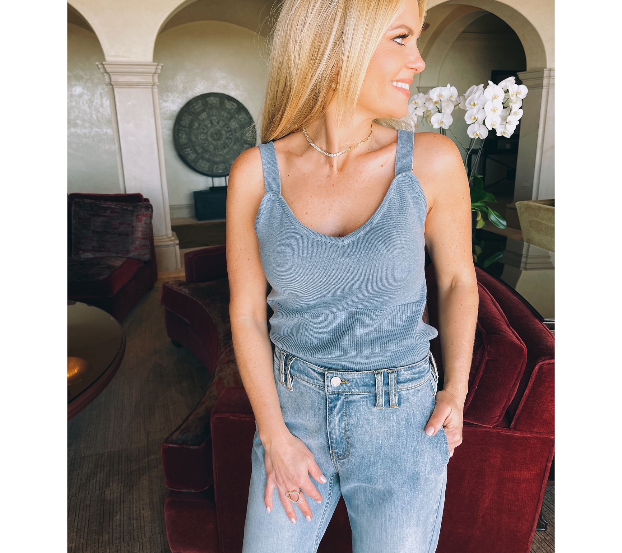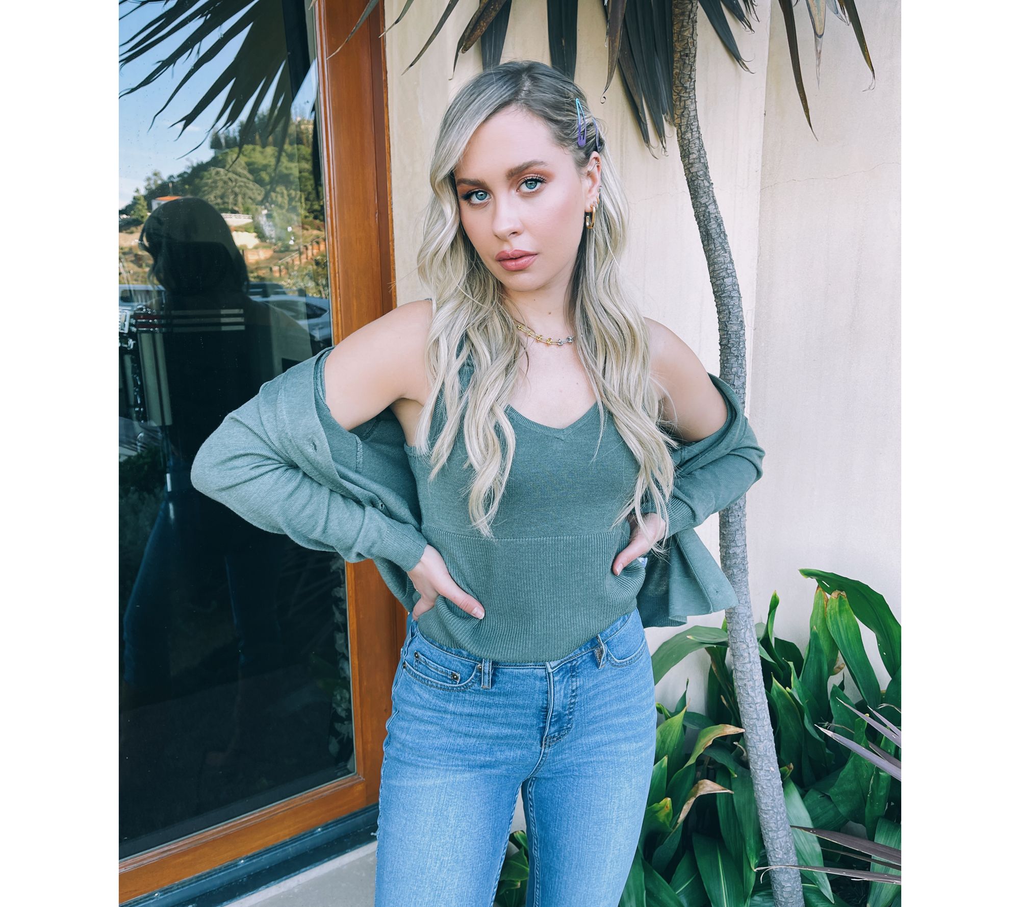 This sweater set provides a lovely layered look that works well with everything from cropped jeans and sneakers to mini skirts and knee-high boots. From Candace Cameron Bure.