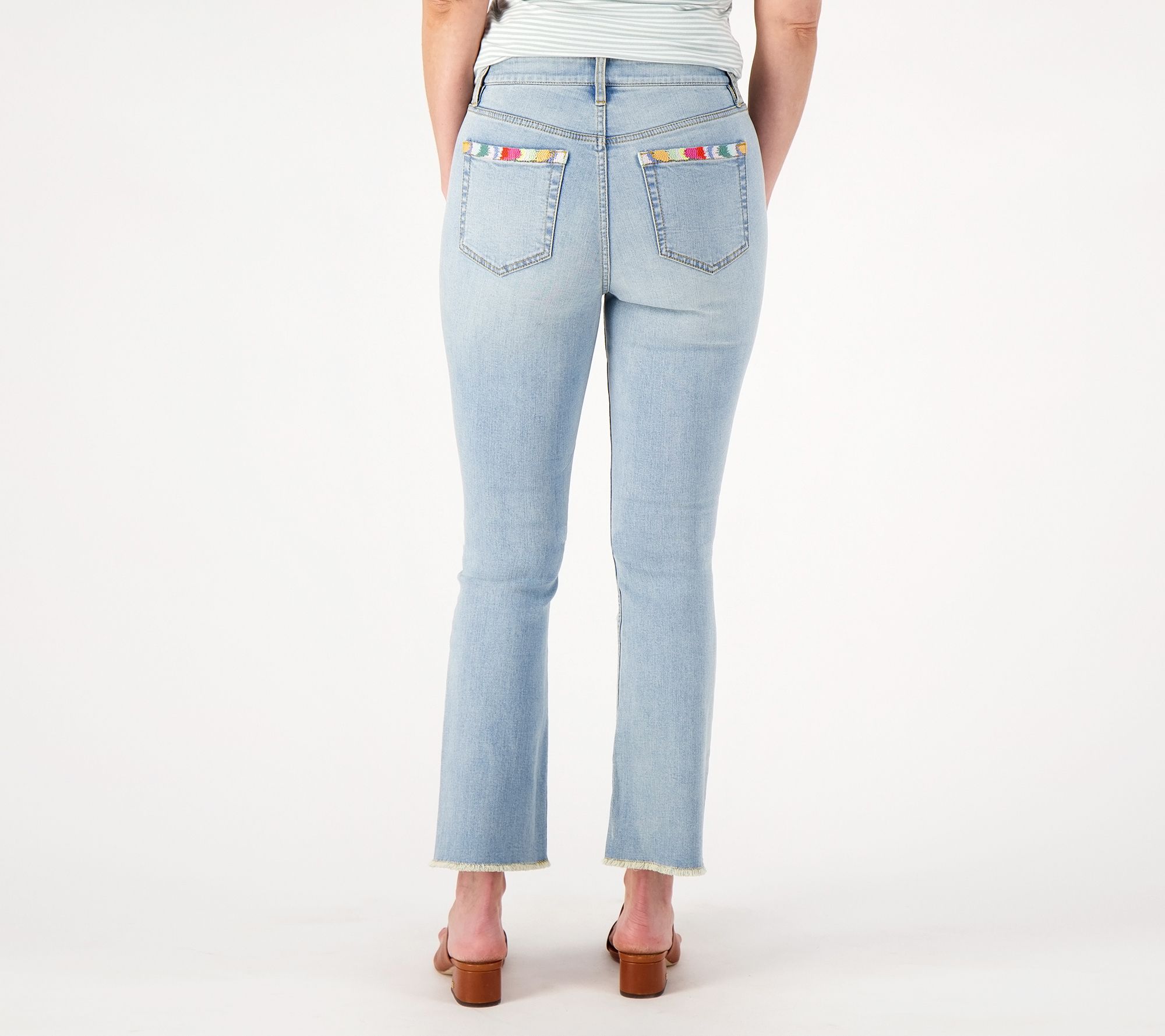 A must-have for any fashion-forward wardrobe, these denim jeans fit like a glove, hugging your curves in all the right places. The flared hem adds a touch of retro chic to your outfit, while the embroidery on the pocket adds a trendy and playful element to the overall design. From Candace Cameron Bure.