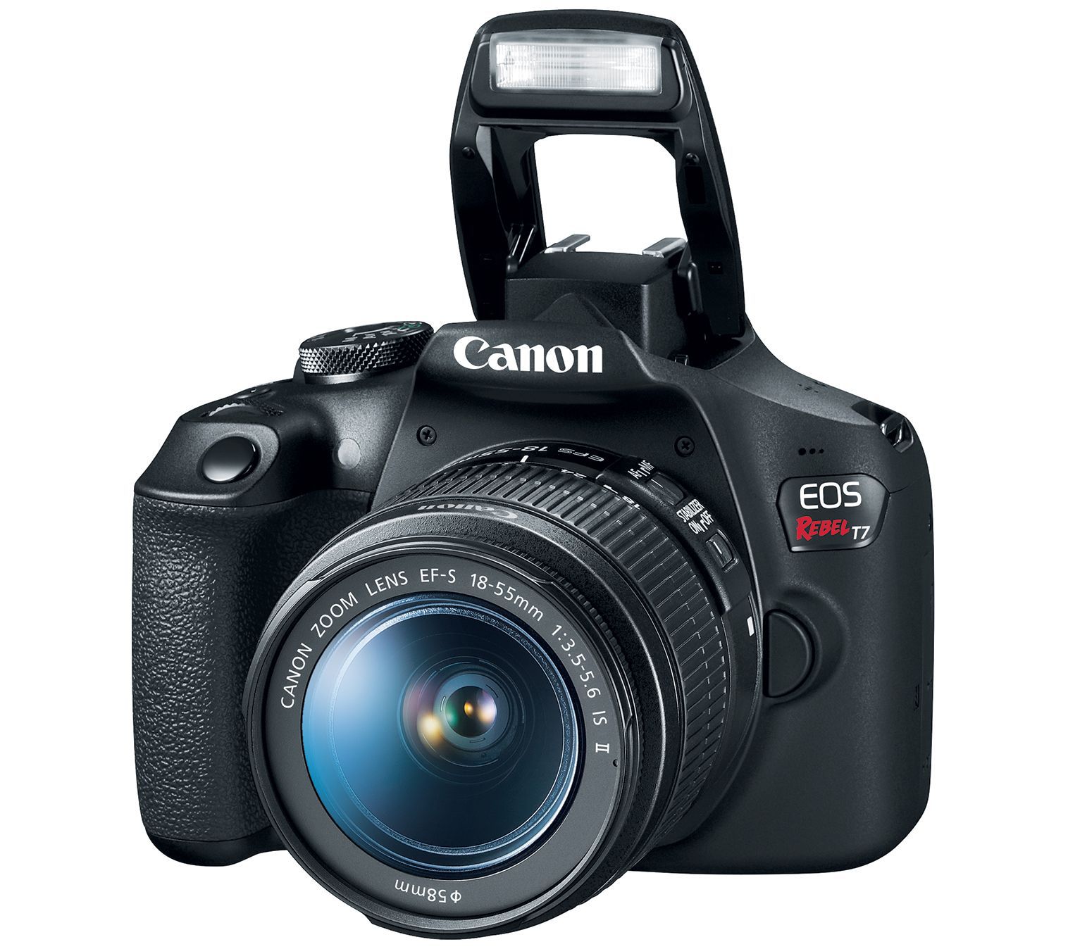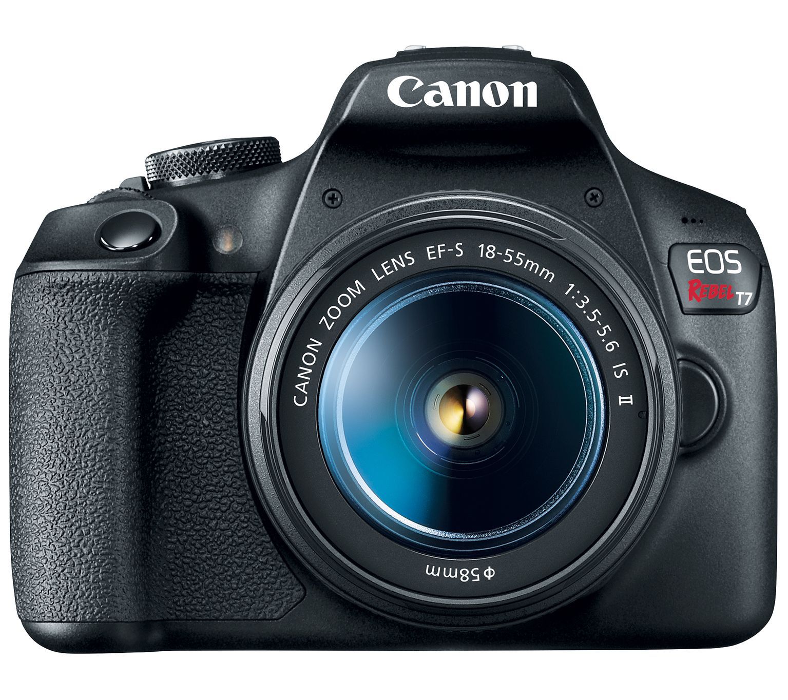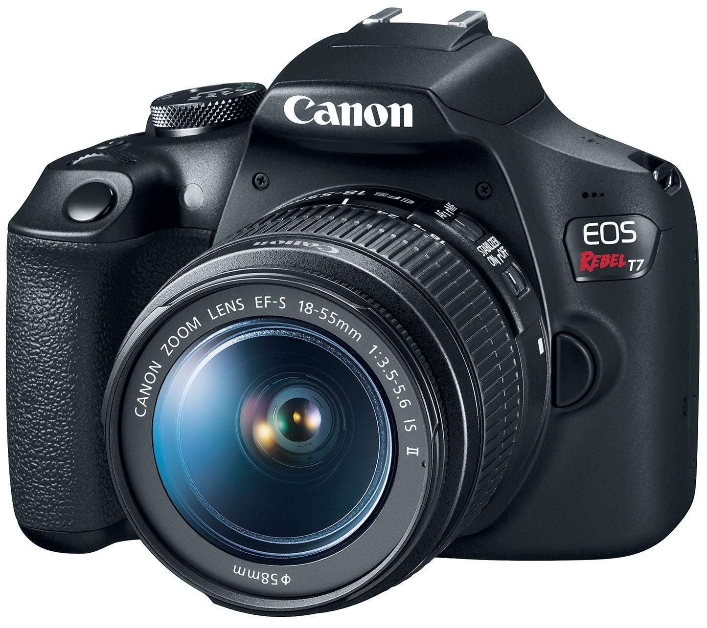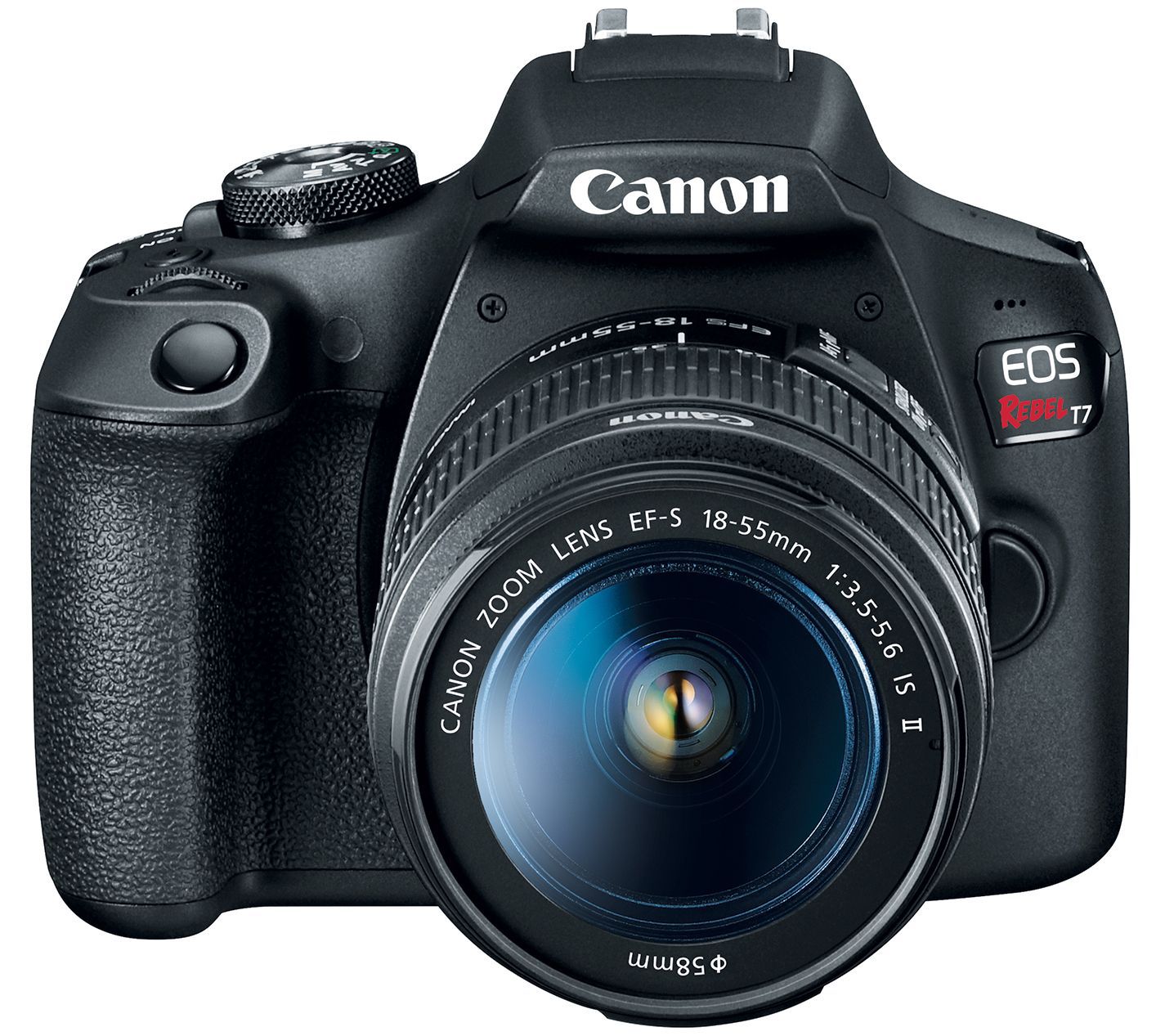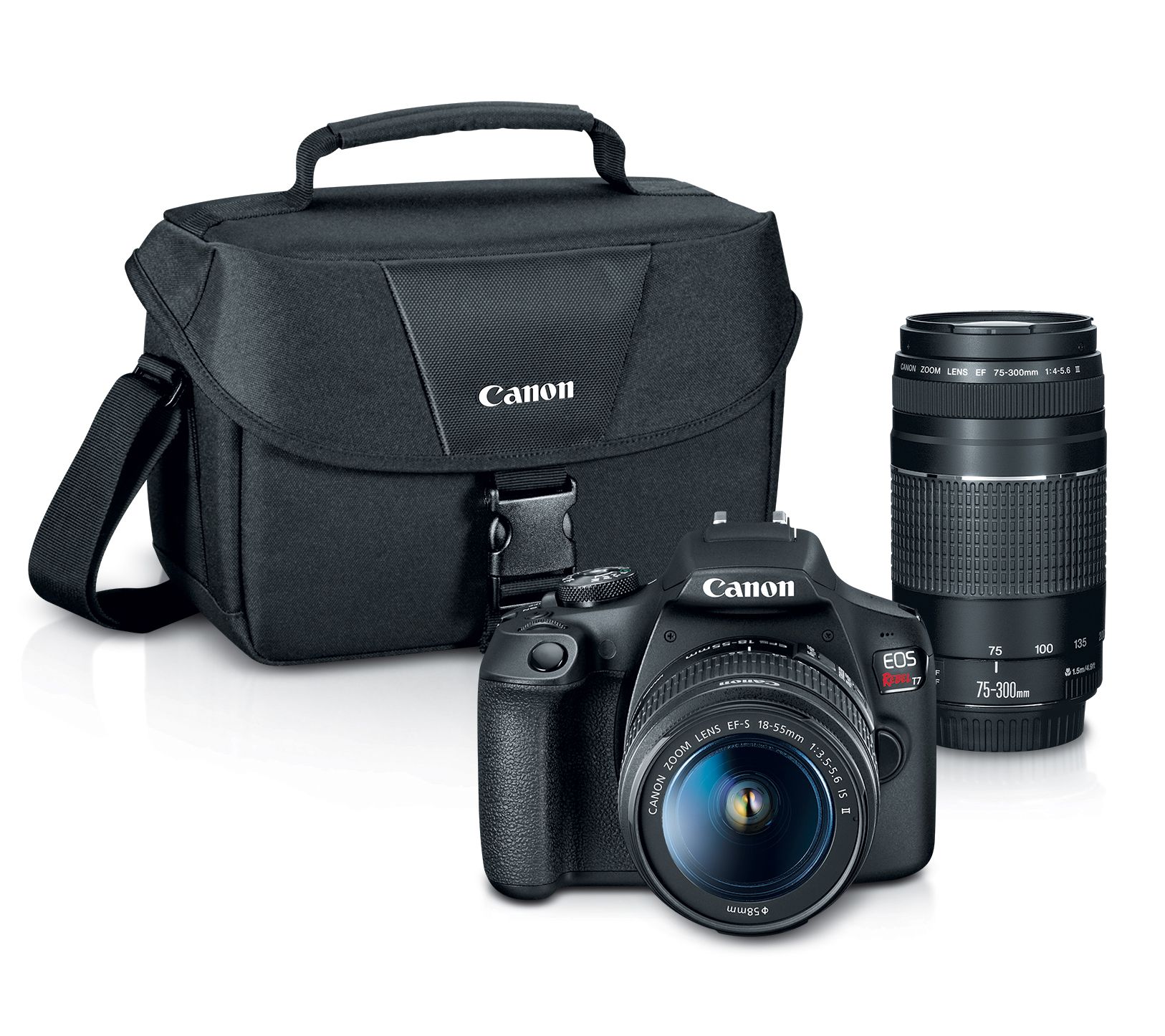 • Includes EOS Rebel T7 DSLR camera body with charger; EF S18mm-55mm/f/3.5-5.6 IS II lens, EF 75-300mm/f4-5.6 III lens, shoulder bag, wide strap, eyecup, and RF 3 body cap