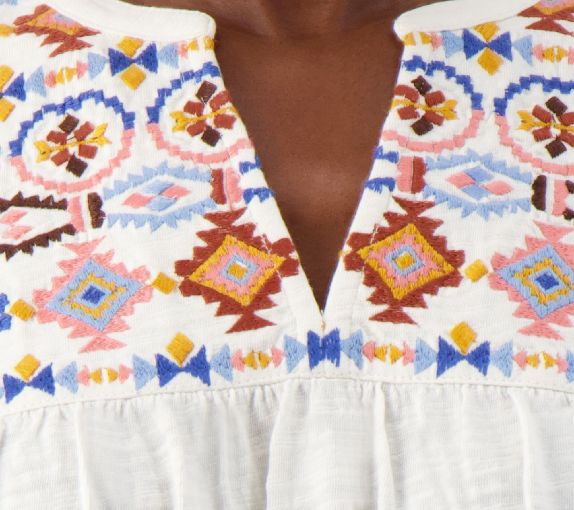 An intricate Southwest-inspired pattern gives this embroidered top its standout style. Pair it with capri jeans and flat sandals for a casual daytime look that exudes Bohemian charm. From Canyon RetreatTM.