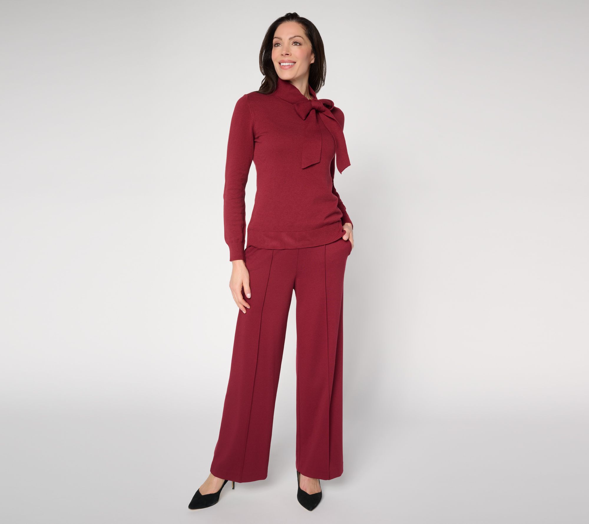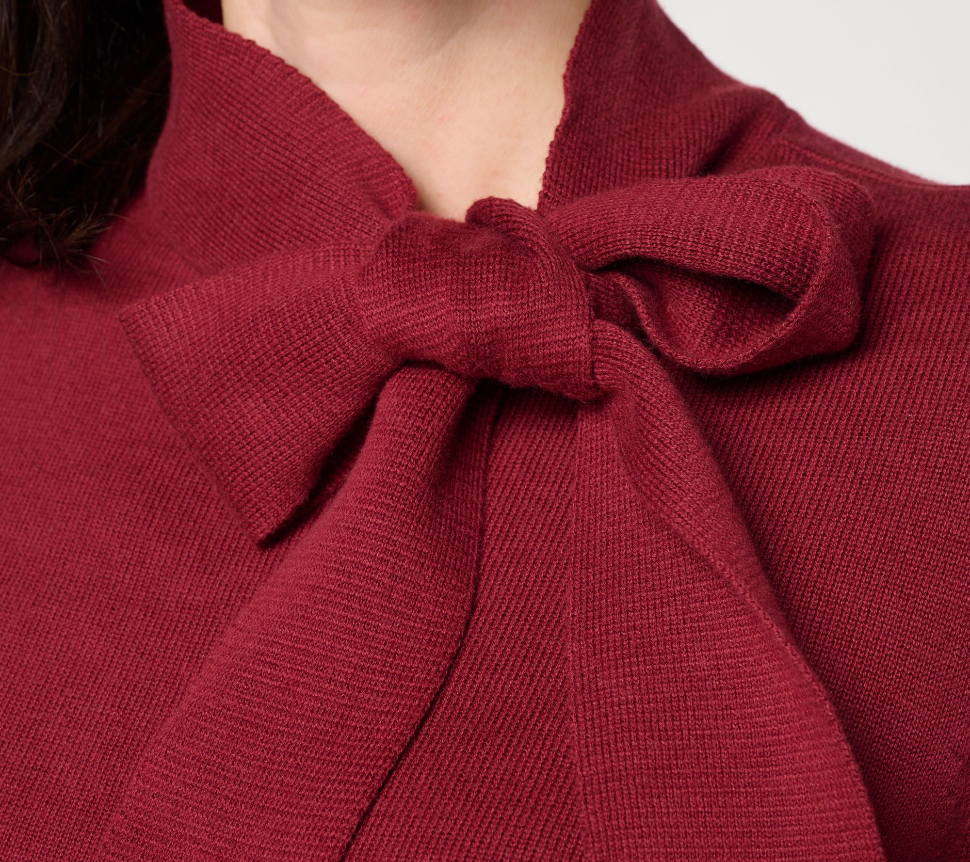 Bring chic flair to any occasion with this bow neck sweater, designed for both weekday meetings and weekend brunches. The soft knit, finished with a striking neckline detail and subtle ribbed trim, delivers polish while providing all-day comfort -- just tie the bow for a look that stands out. From the Carla Rockmore Collection.