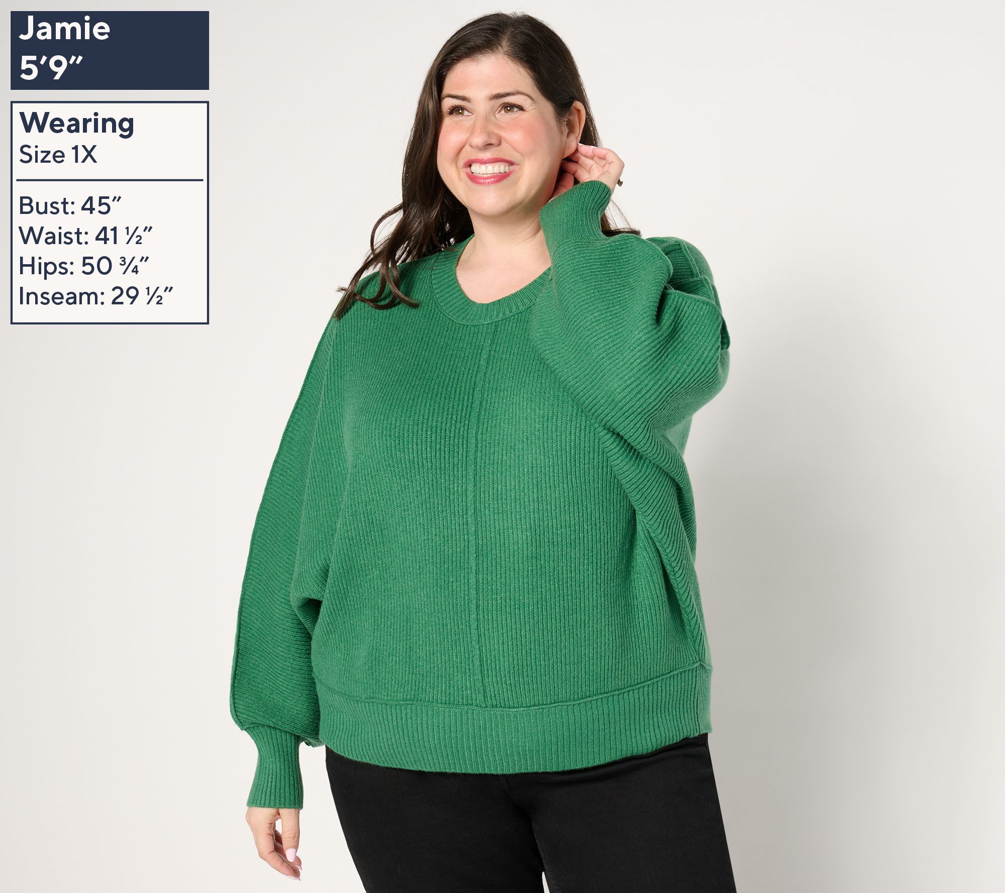 We're so looking forward to sweater weather so we get the chance to step out in this standout style. The batwing sleeves, the ribbed details, and the center seams add subtle structure to create an effortlessly elegant look. Pair with your daily denim or a fabulously flowing skirt to complete this lovely look. From the Carla Rockmore Collection.
