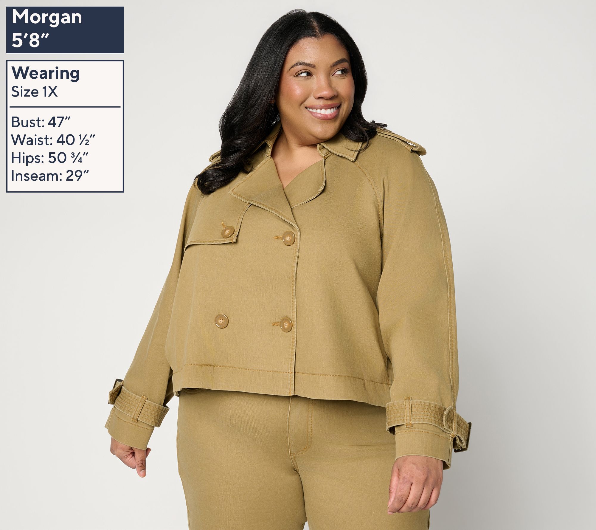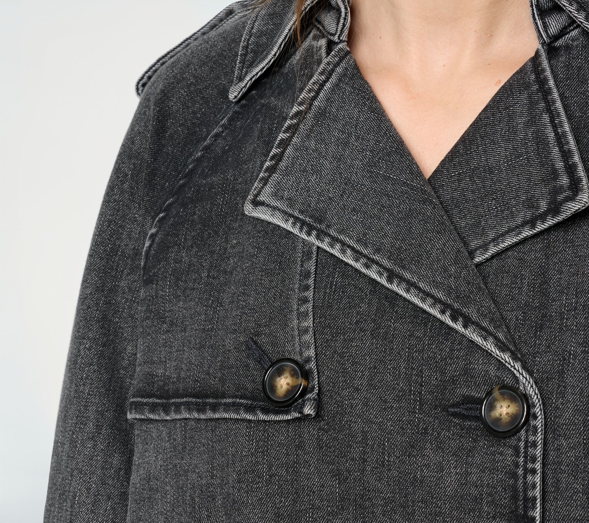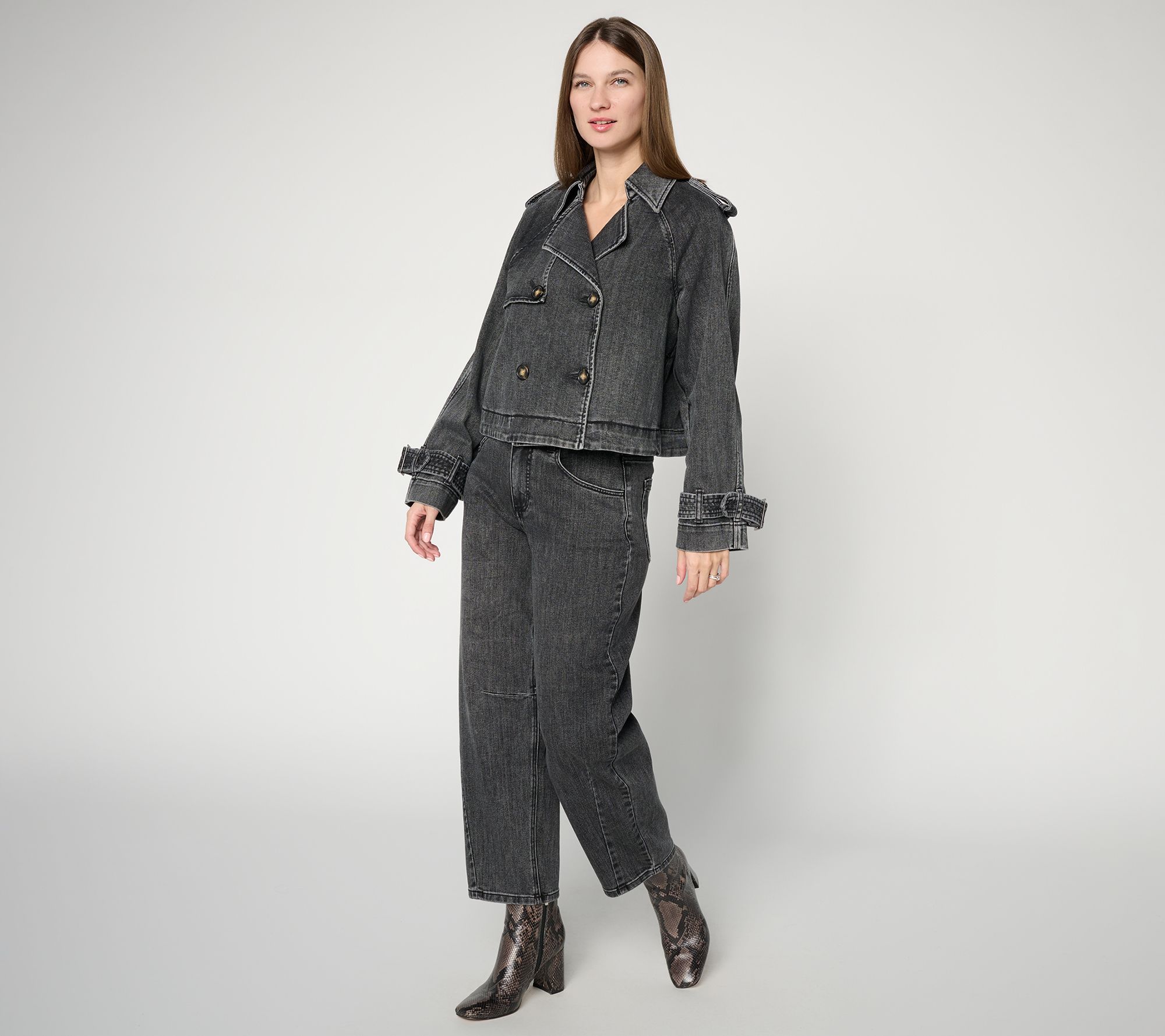 How chic! Carla Rockmore reinvents the denim jacket. A double-breasted design and (removable) epaulettes lend a trench coat vibe to this classic layer. Don it on days when you feel like turning heads. From the Carla Rockmore Collection.