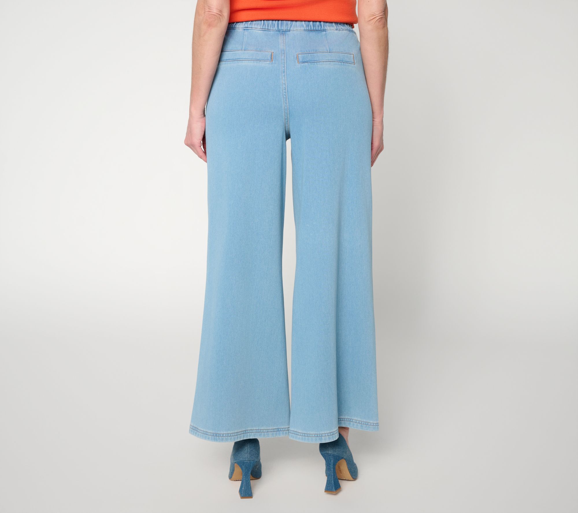 If gallery strolls or girls' getaways are on the agenda, how happy you'll be when you've got Carla Rockmore's pull-on jeans waiting in the wings. Soft stretch fabric, a polished wide-leg cut, and the subtle edge of grommet details make these pants a comfortable choice for relaxed weekends or on-the-go afternoons. (And only you'll know they're actually a comfy knit). From the Carla Rockmore Collection.