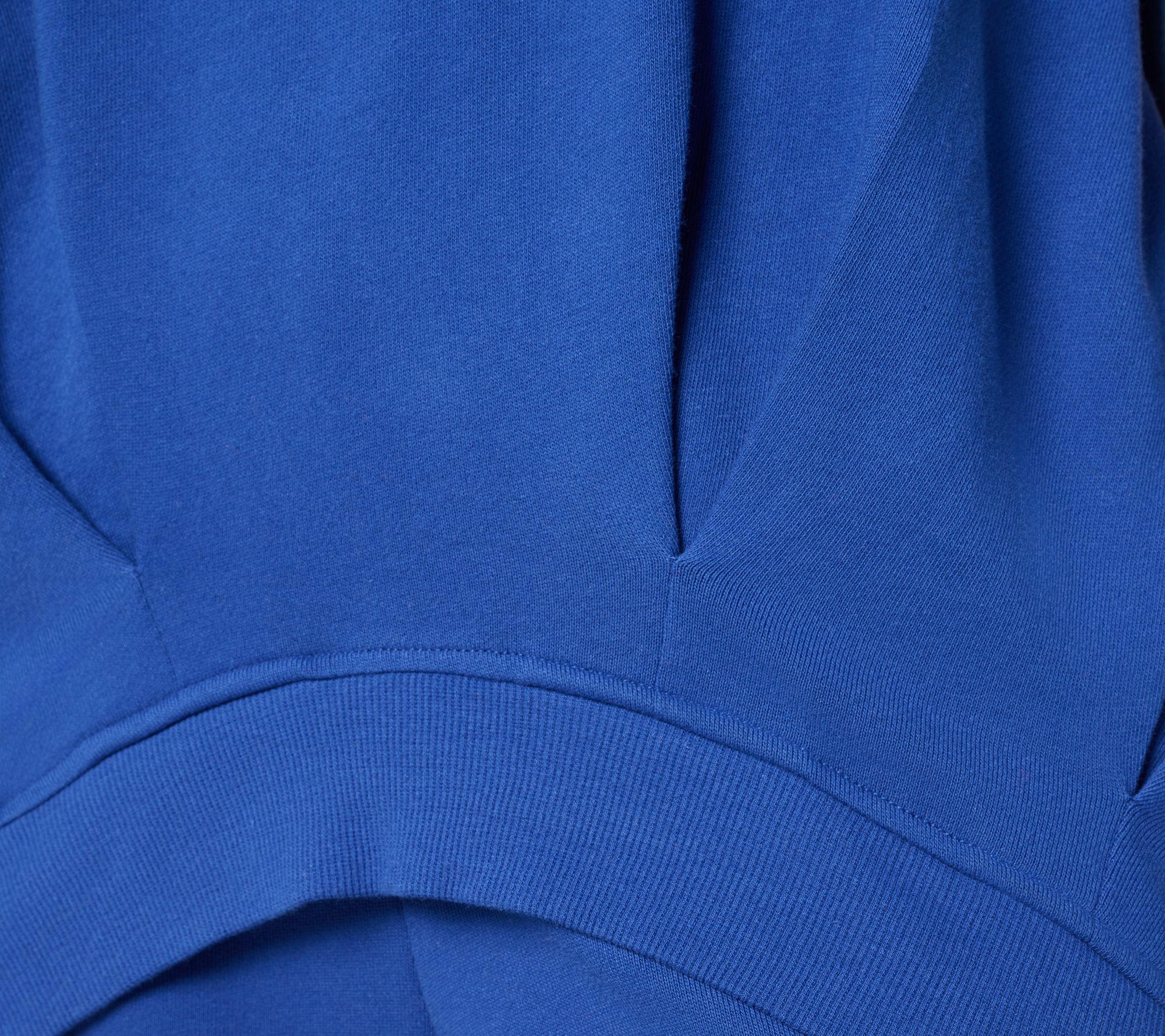 • Features: folded rib crew neckline, clean finished with self binding, dolman short sleeves with folded rib cuff, high-low hem with front and back pleating, folded rib trim at hemline