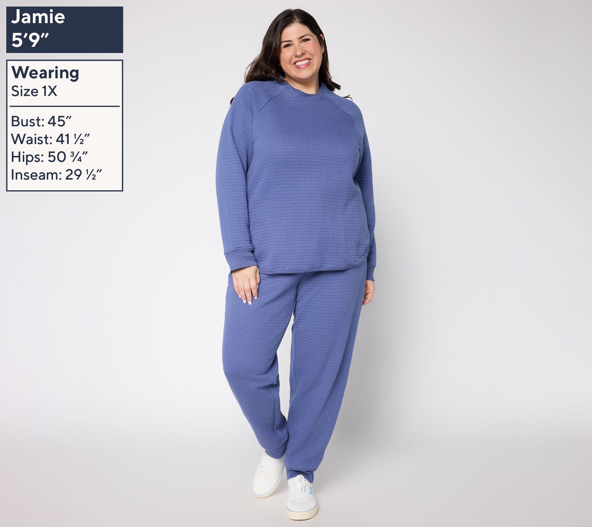 Suit up in cozy! A soft grid knit gives this jogger lounge set a sumptuous feel that's ideal for chilly day shopping, traveling, and relaxing. The adjustable drawstring waist of the joggers helps you get the fit just right -- and create a little extra room after a yummy holiday meal. From Carole Hochman.
