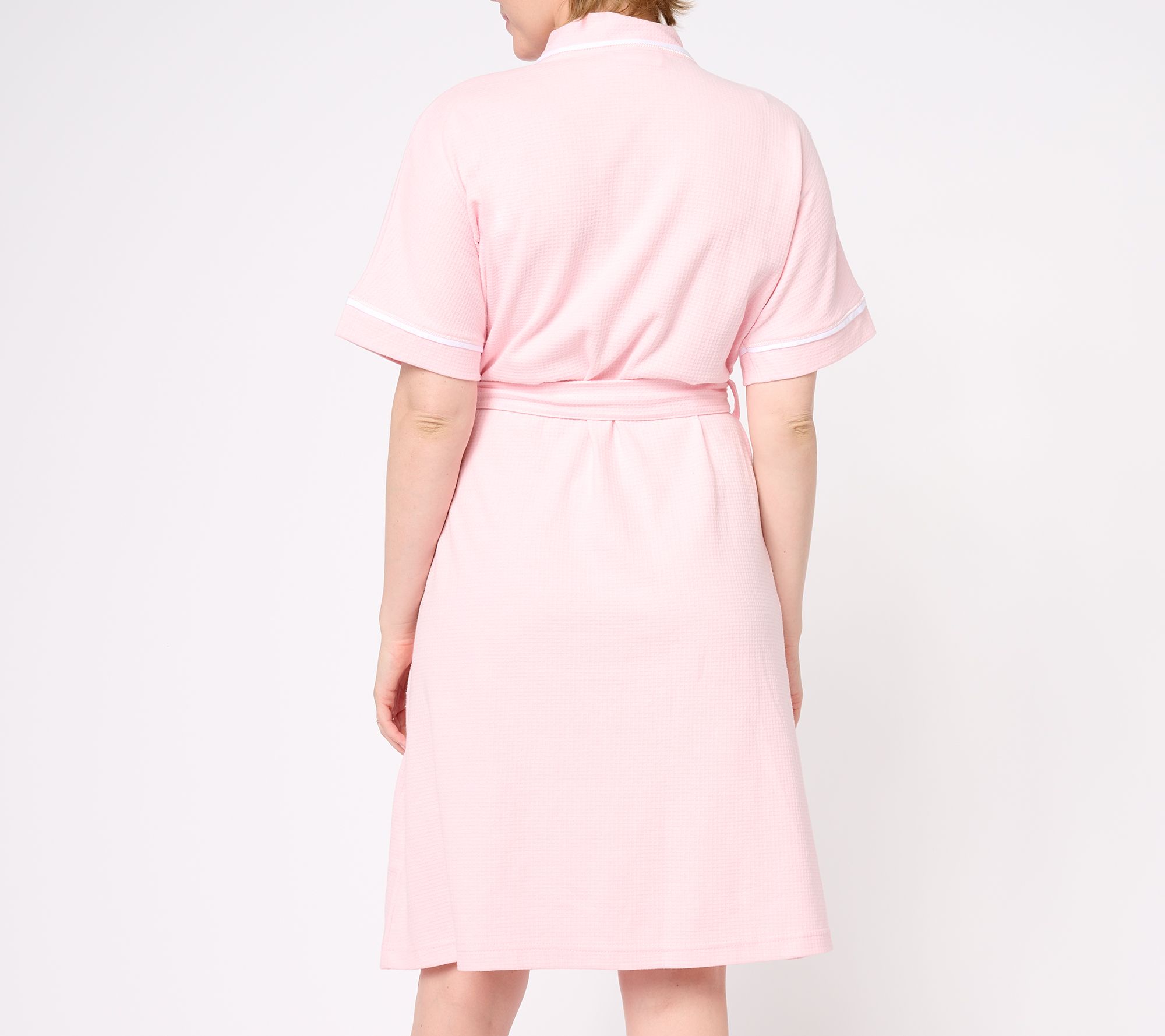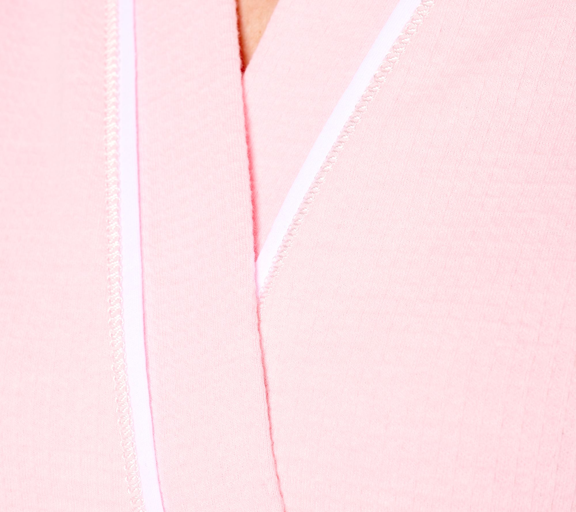• Features: wrap robe, waffle, contrast piping at front placket and sleeve bands, locker loop at back neck, belt with tear drop belt loops, patch pockets, short dolman sleeves