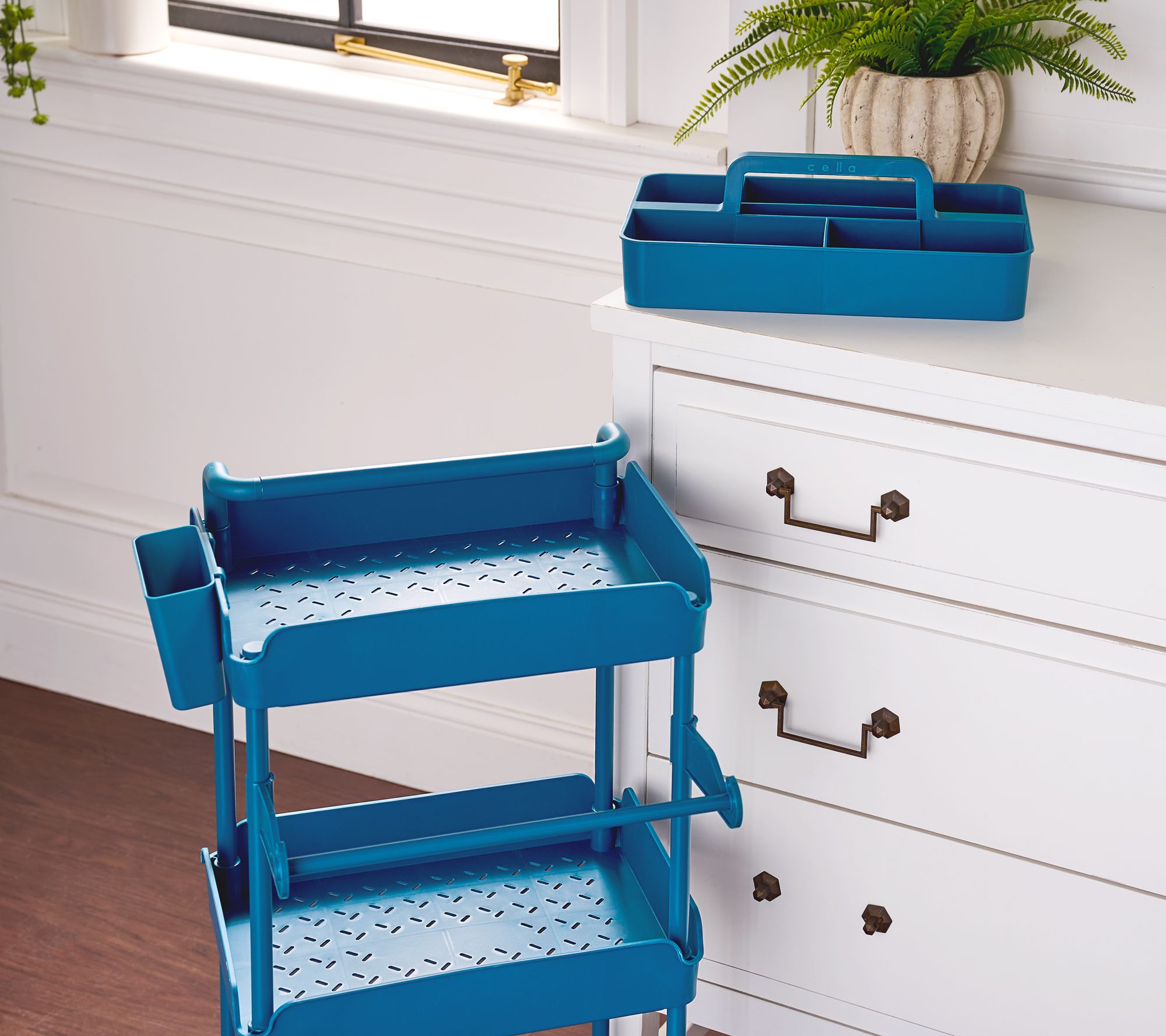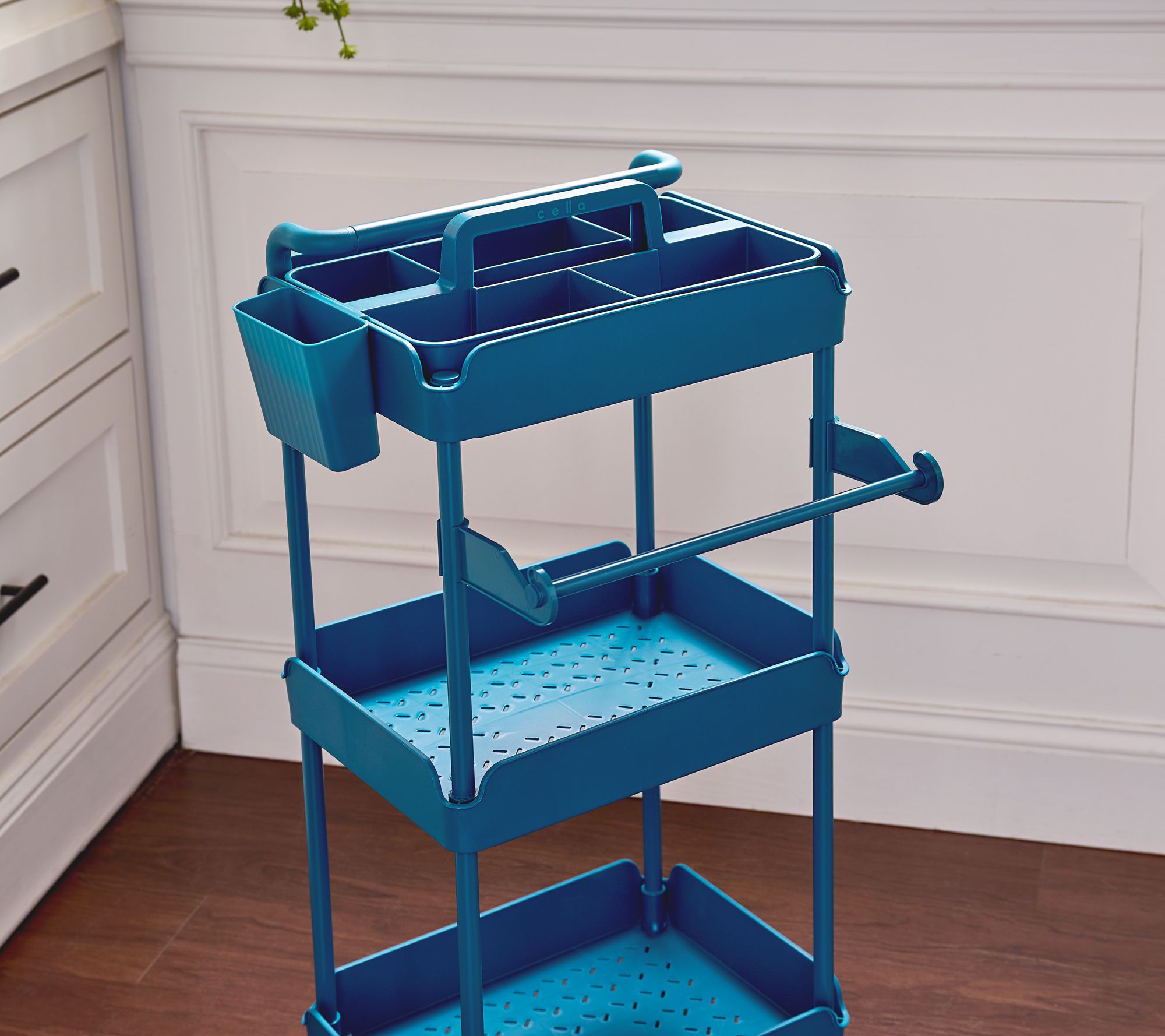 Organize any space with this three-tier universal cart with wheels. Featuring a removable caddy, side basket, and hanging bar, this handy helper can accommodate everything from laundry supplies to kitchen essentials. From Cella.