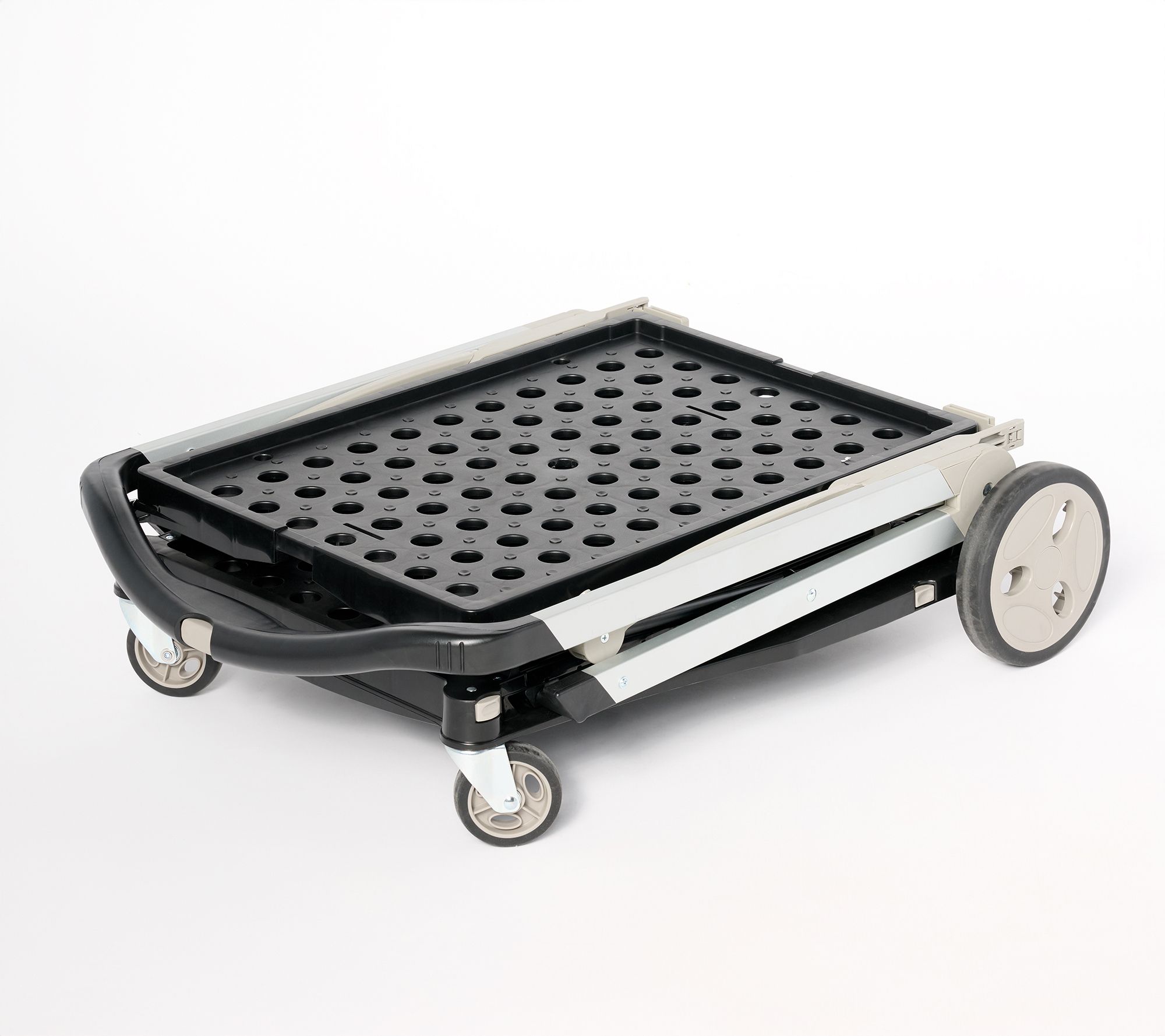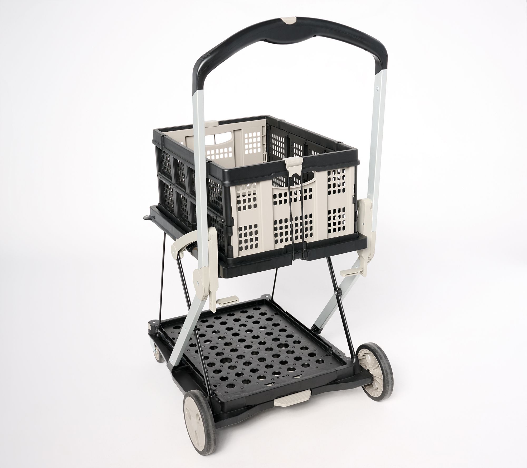Running errands or tackling laundry day gets easier with this collapsible rolling shopping cart. The spacious basket can be removed for quick unloading, while the lightweight frame folds flat for simple garage or closet storage when not in use. Strong plastic and metal construction supports everything from groceries to garden supplies on your next outing. From Cella.