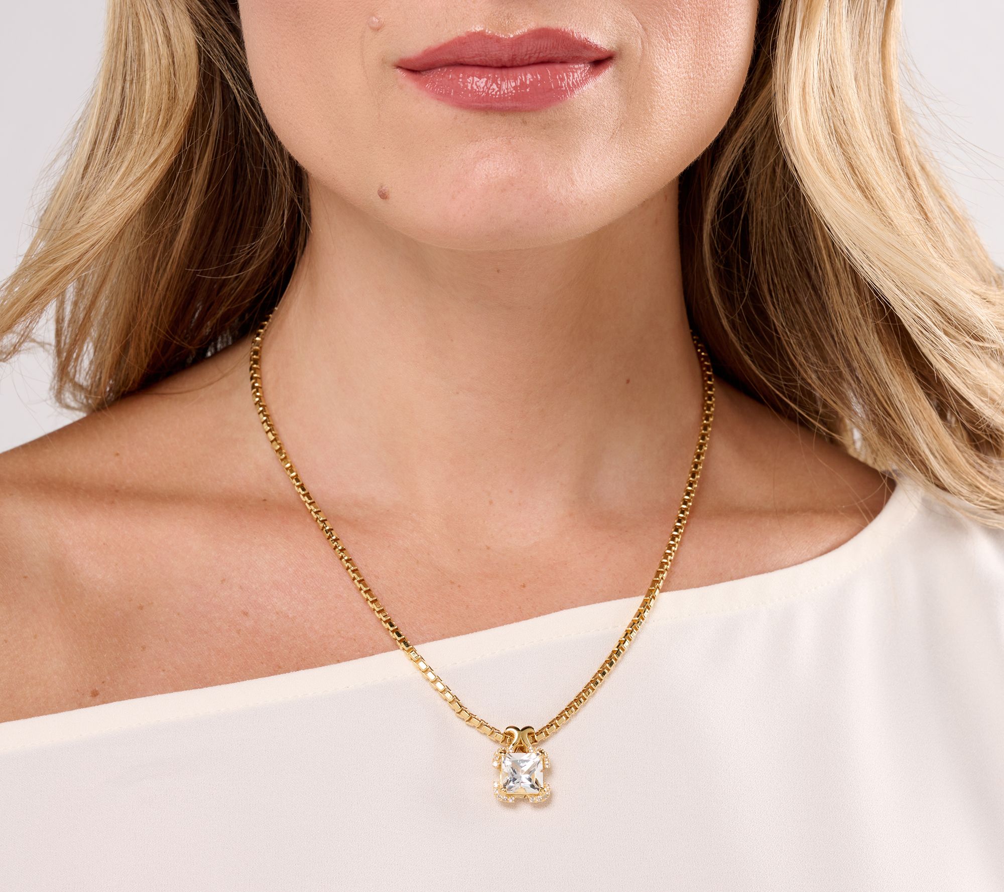 • Princess-cut gemstone in center; prong-set, round white topaz at each corner; polished decorative bail; round box chain