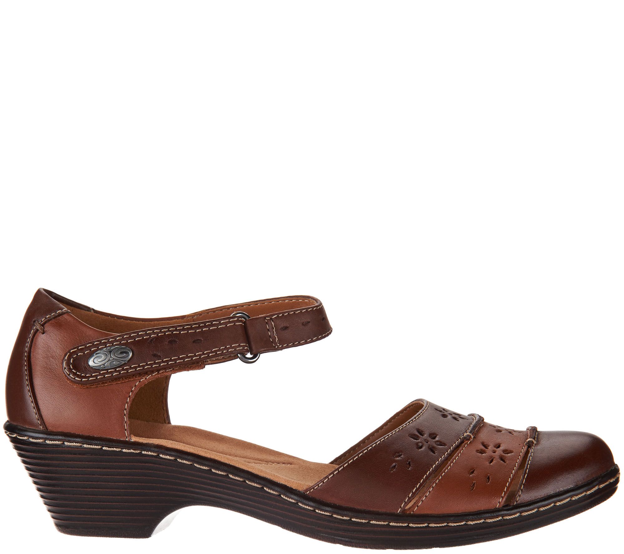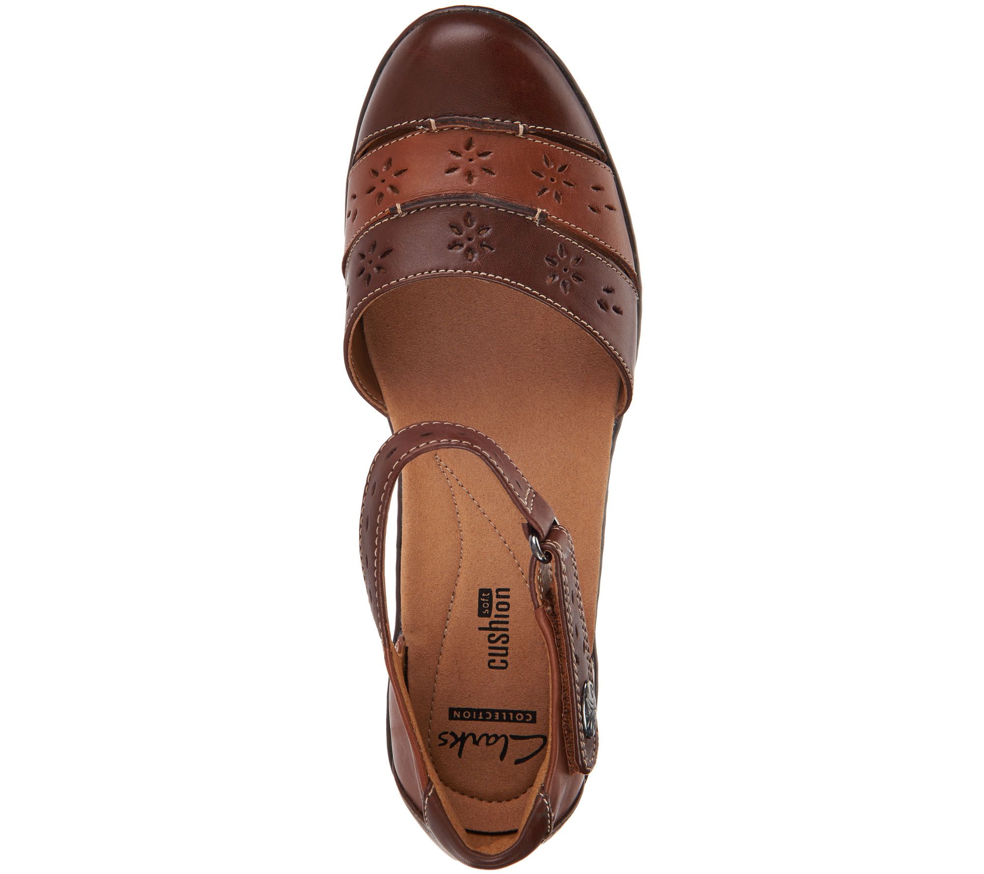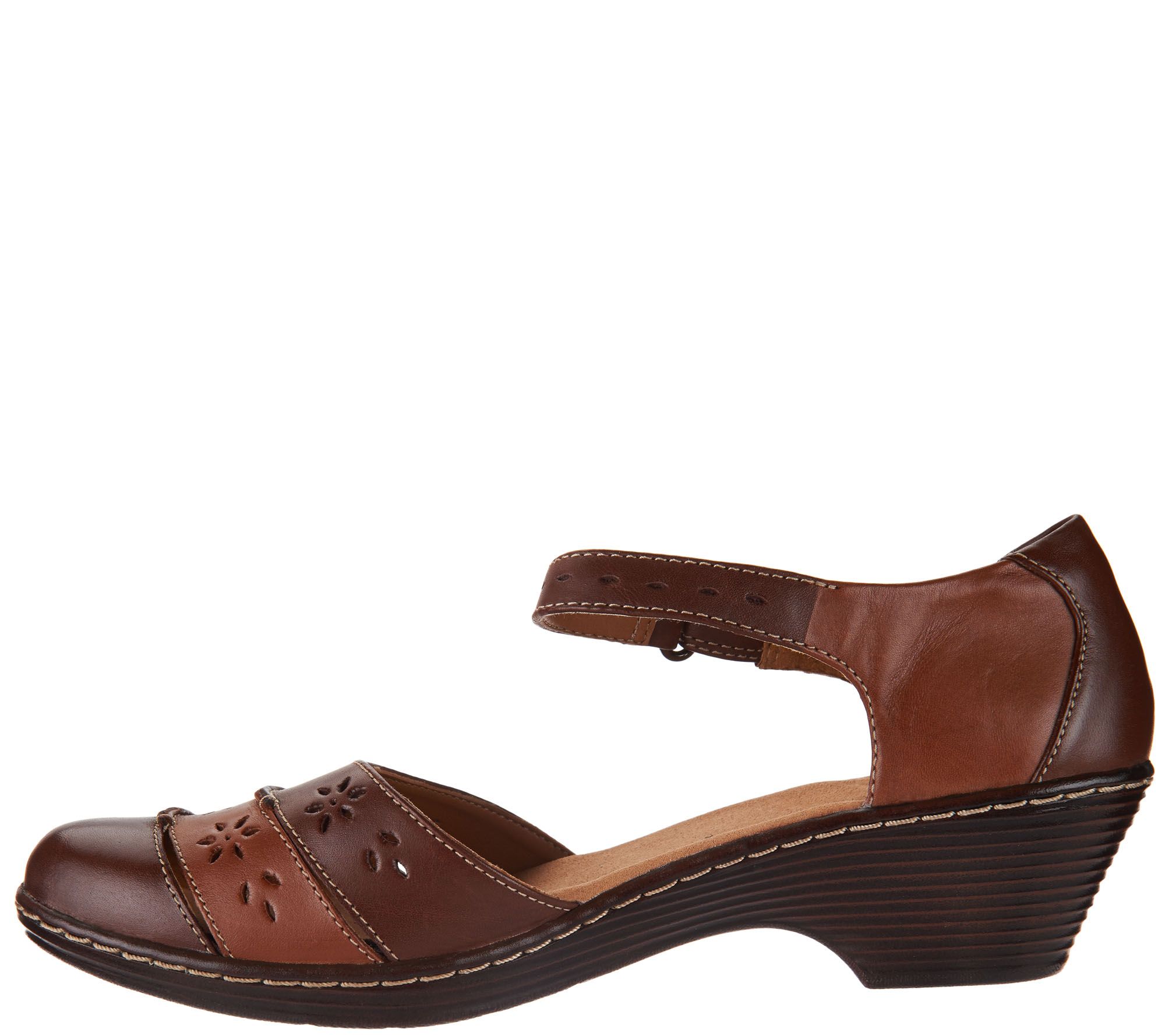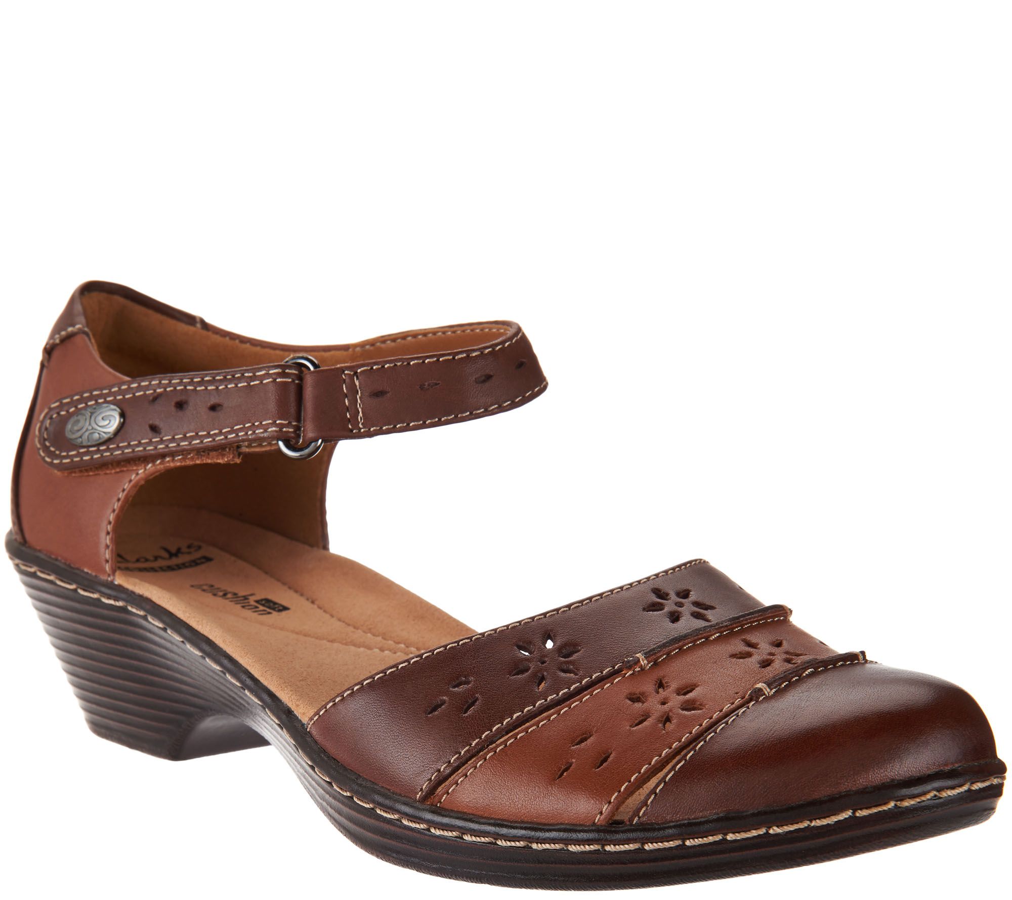 Step up your look with these Clarks Wendy Leehi closed toe sandals. Floral perforations bloom in the leather upper, while the ankle strap easily adjusts with a hook-and-loop closure for a customized fit. From Clarks Footwear.