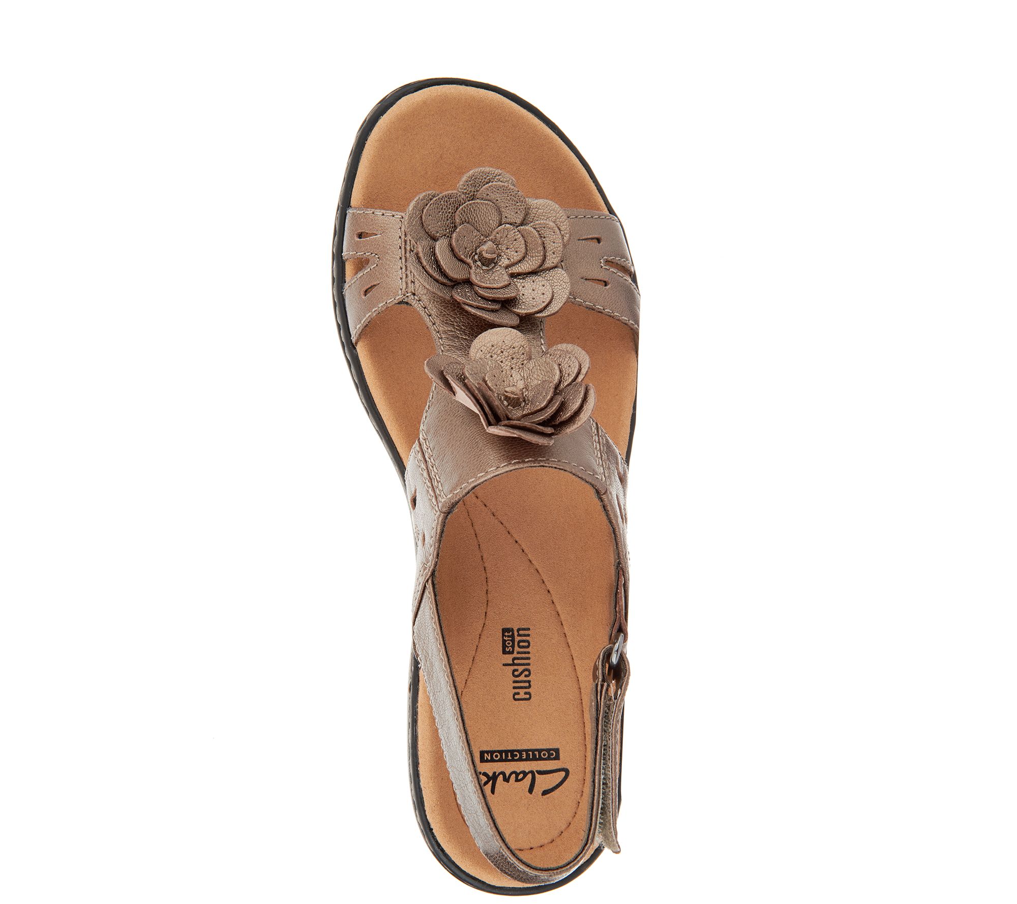 Footwear says a lot about you. Show off your fun, flirty side with flower-detailed leather sandals that are lightweight in feel and personality. From Clarks Footwear.