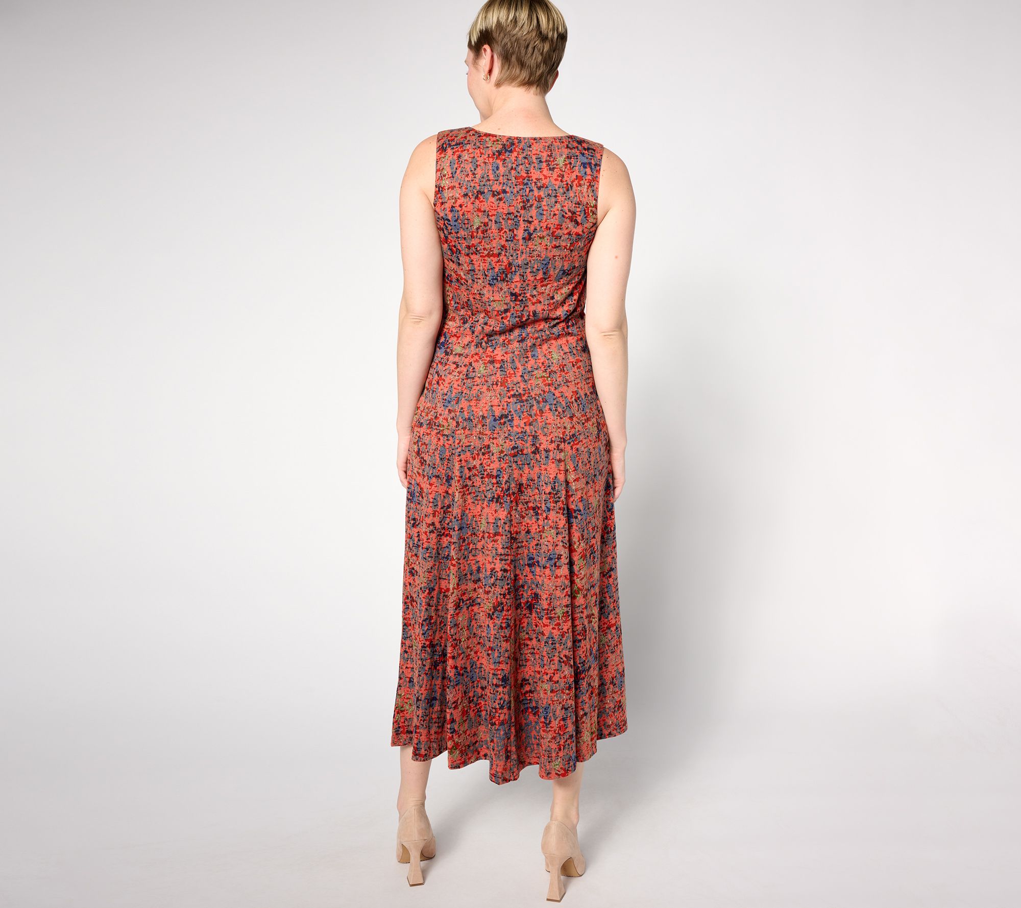 • Features: V-neckline, sleeveless, pockets, burnout design, ankle length, fit-and-flare silhouette