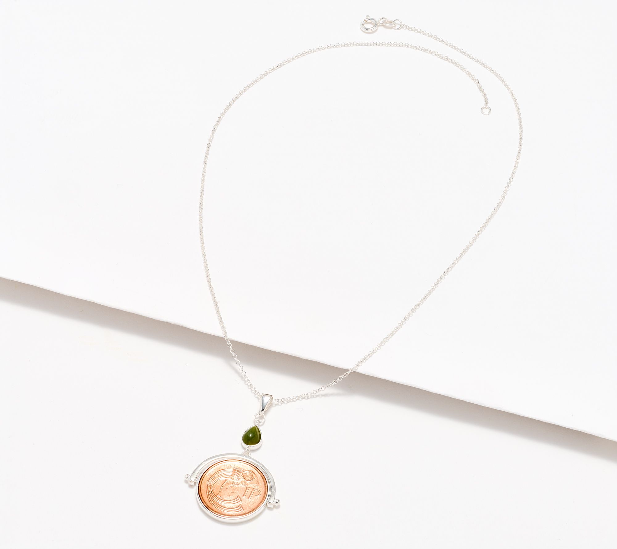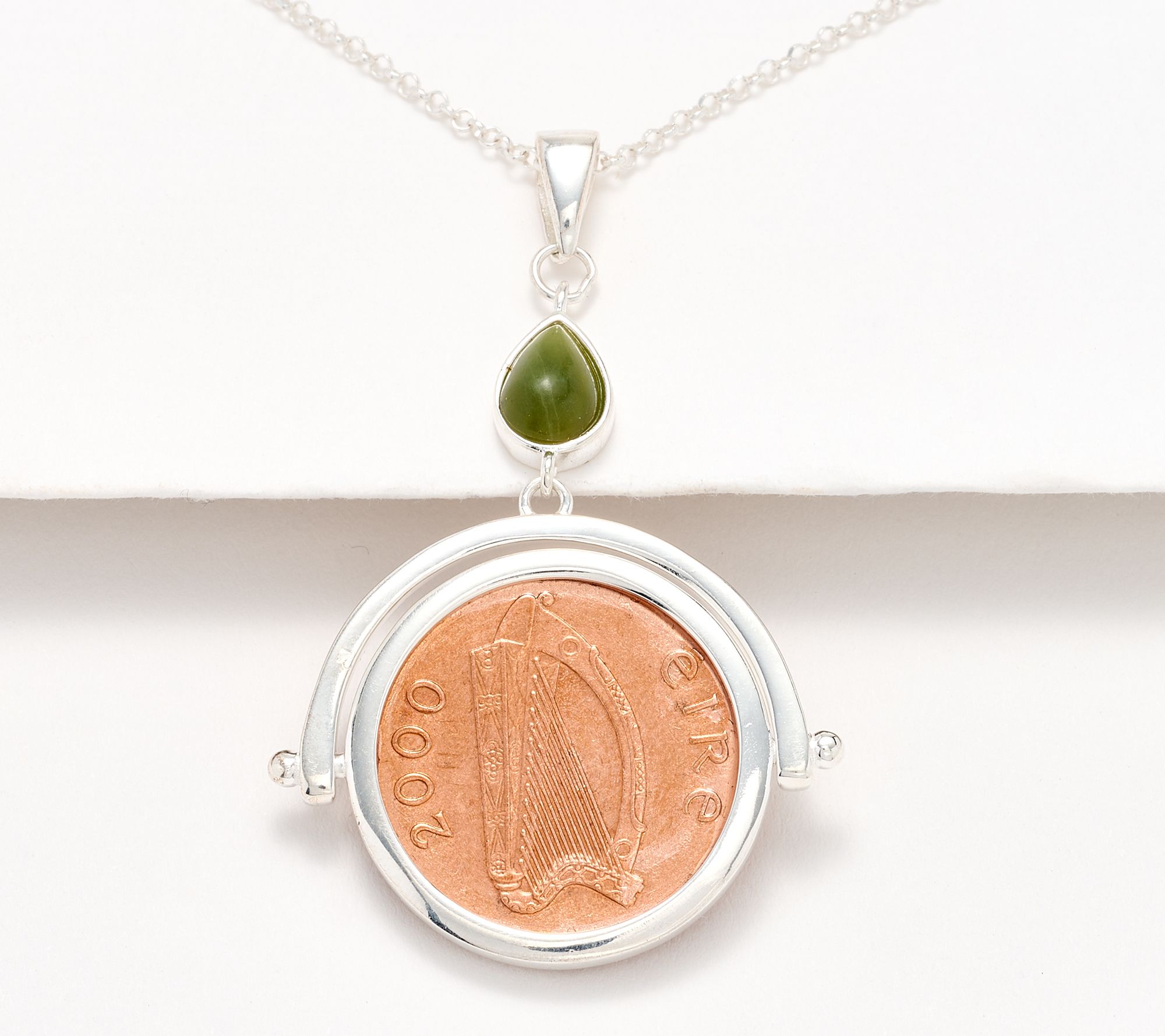 • Old Irish penny no longer in circulation, spins inside pendant; Connemara marble cabochon