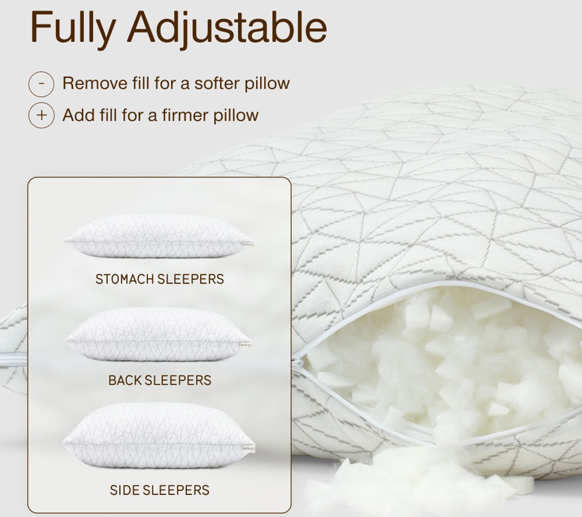• Adjustable pillow fill for customized comfort; add or remove filling to suit your preference