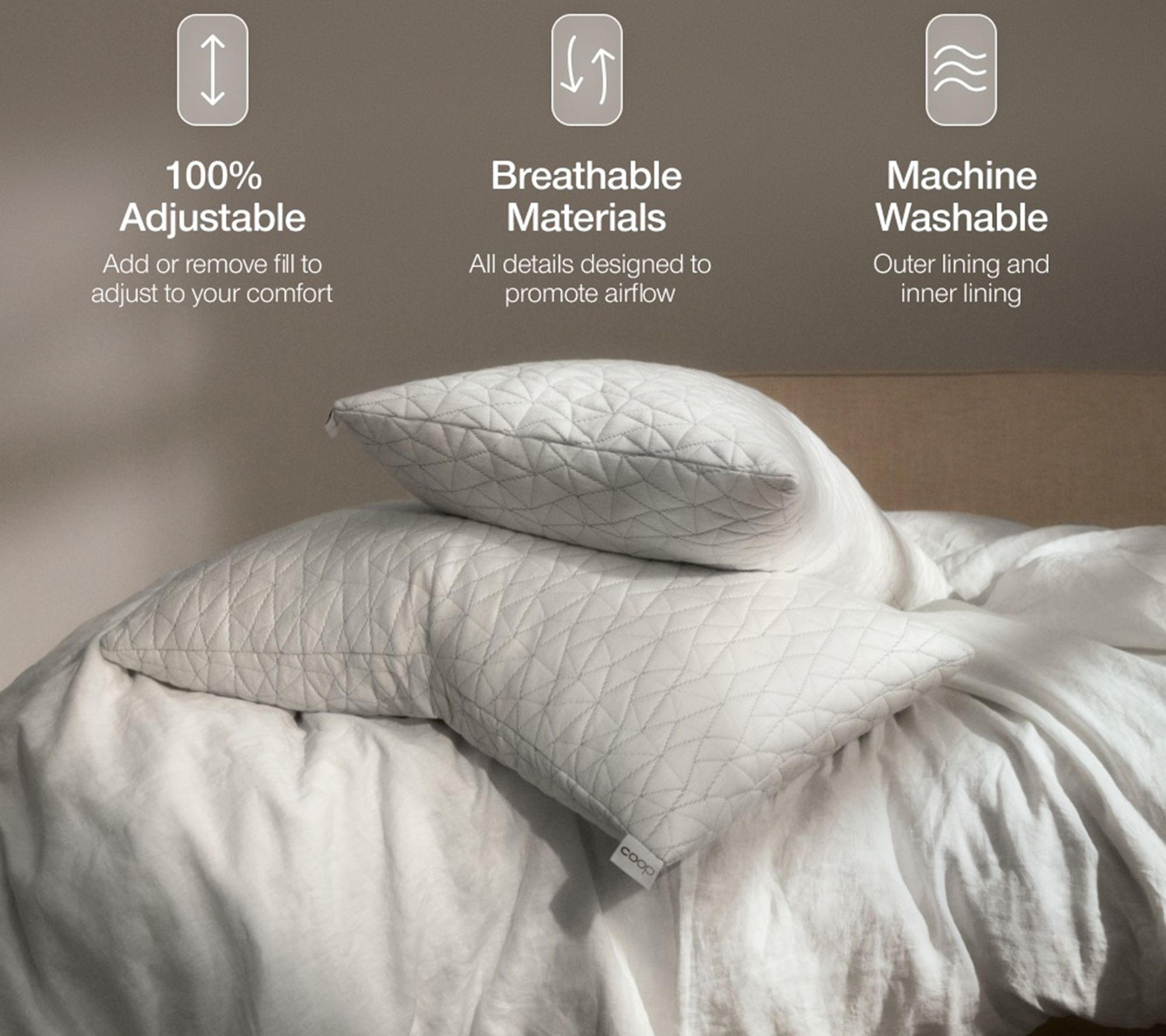 Craft your most comfortable sleep environment with an adjustable pillow that lets you choose just the right amount of support every night. Easily add or remove filling to create the loft that suits your personal preference -- whether you prefer soft and low or lofty and firm, this pillow adapts to you. From Coop.