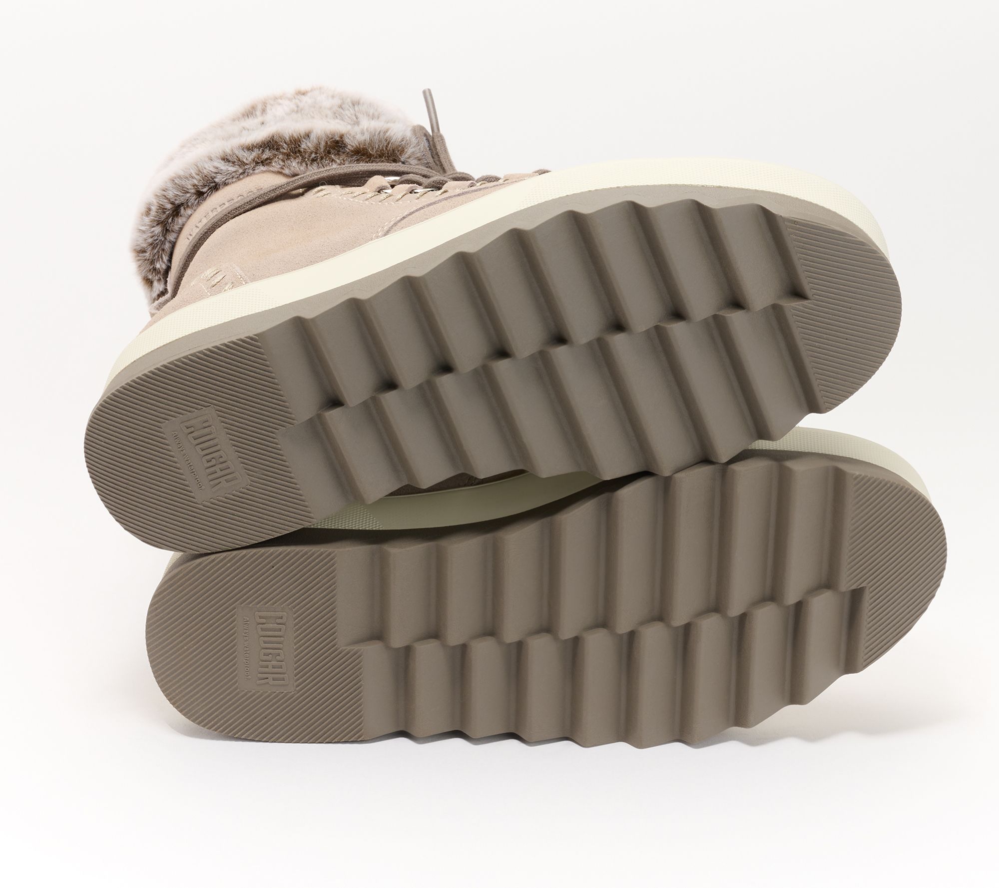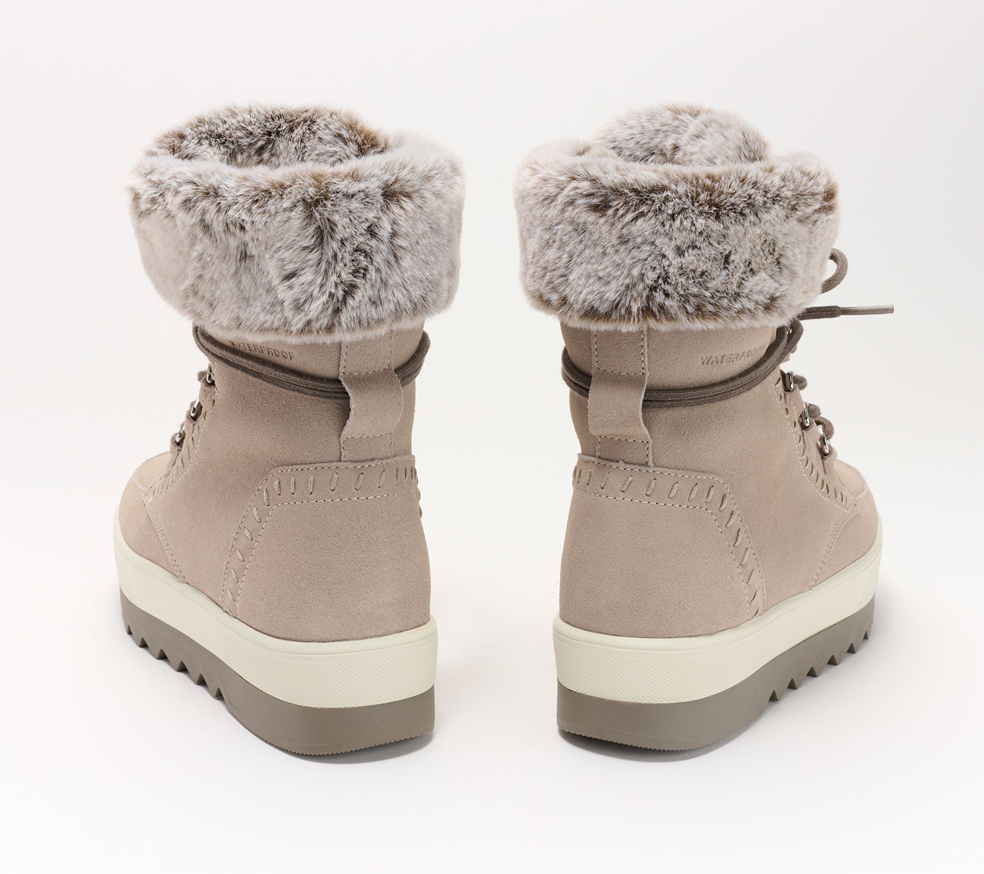 • Waterproof construction, suede upper, contrasting wrap-around lace-up closure, faux-fur collar, round toe