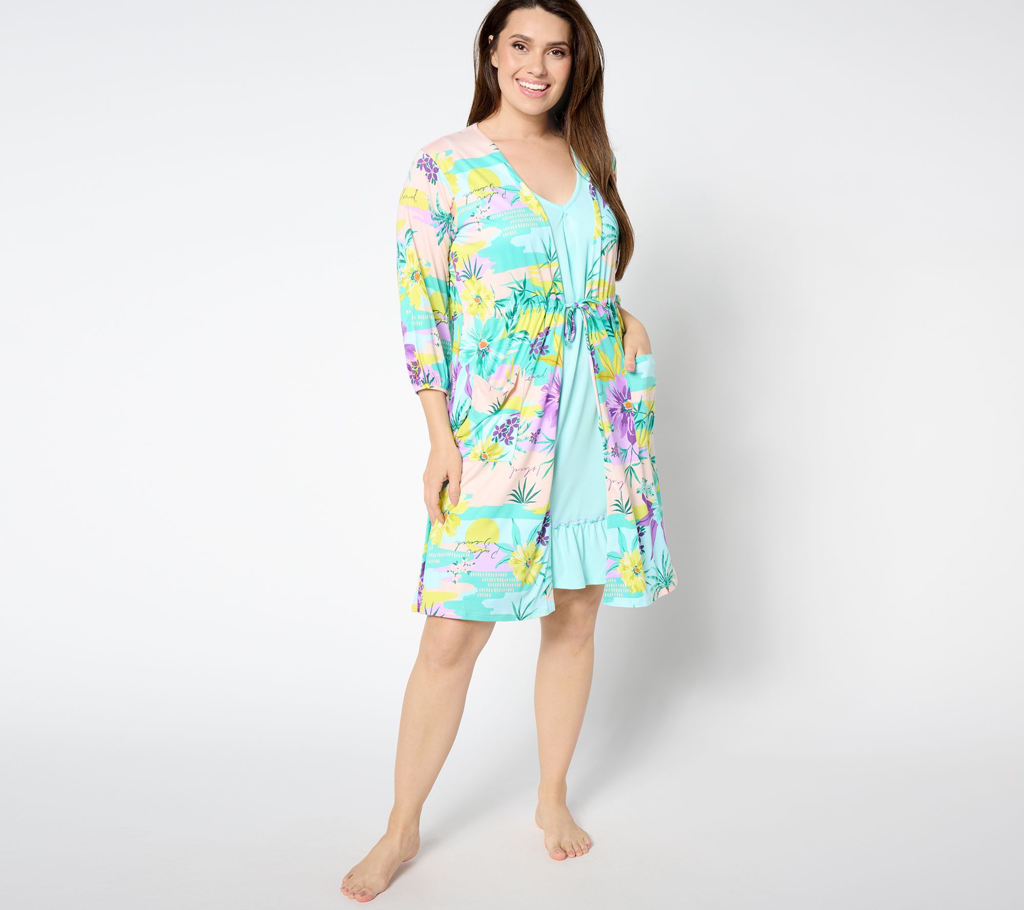 On those do-nothing days spent relaxing in bed or curled up on the couch, this light and airy tank dress and coordinating wrap will keep you cool and comfy. Sweet little details, like ruffles and a spaghetti tie at the front, give this two-piece set character and charm. From Cuddl Duds.