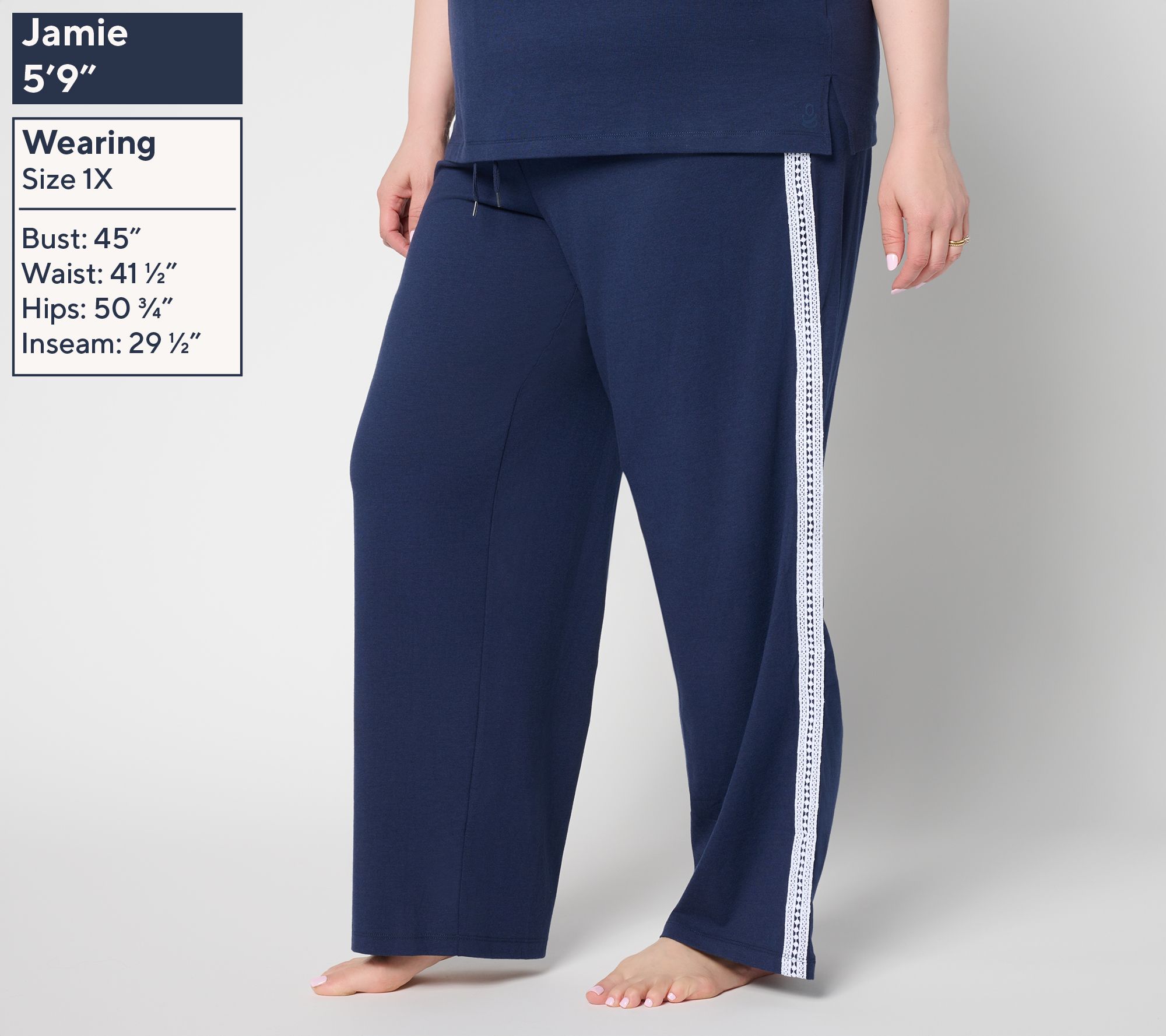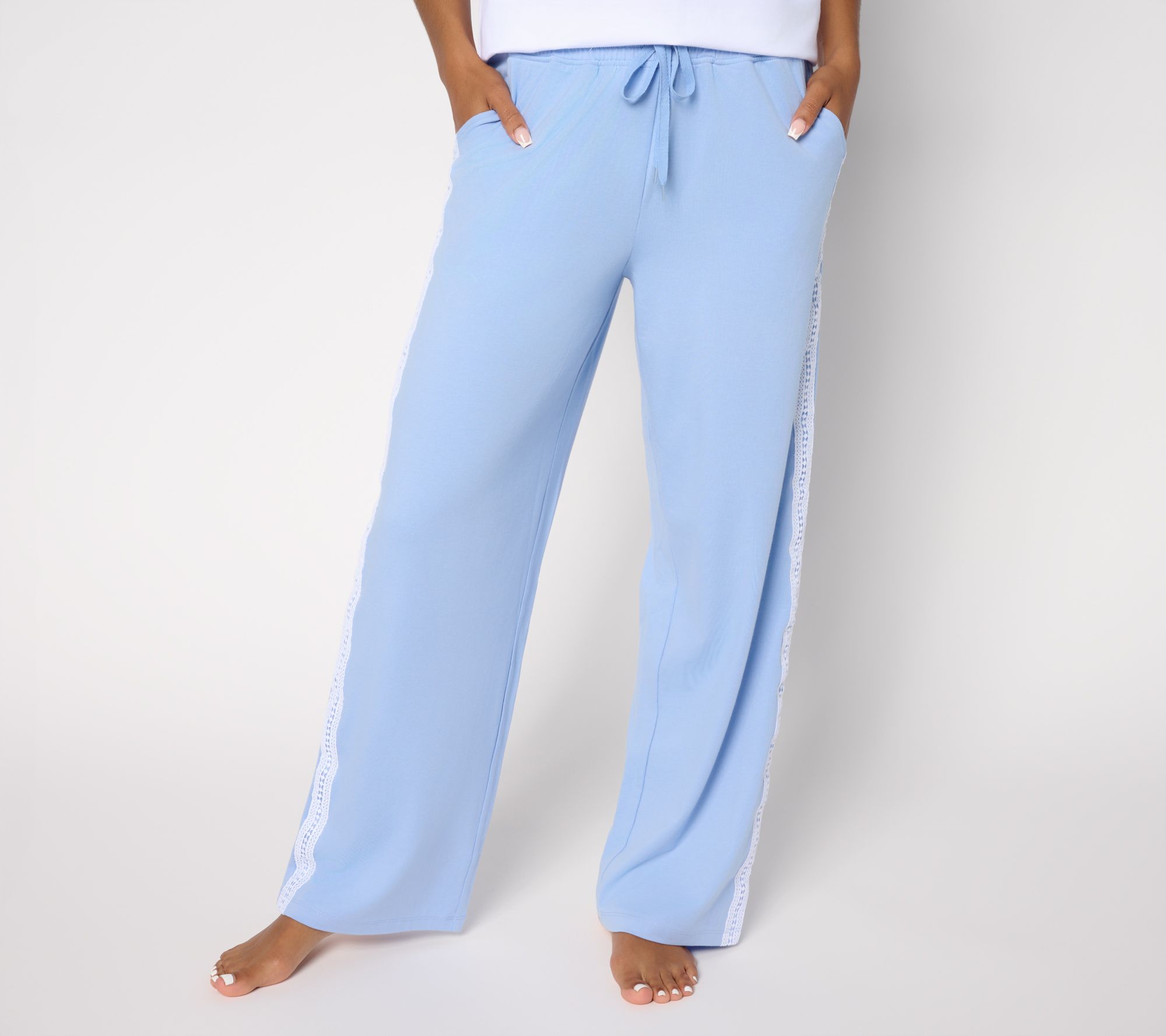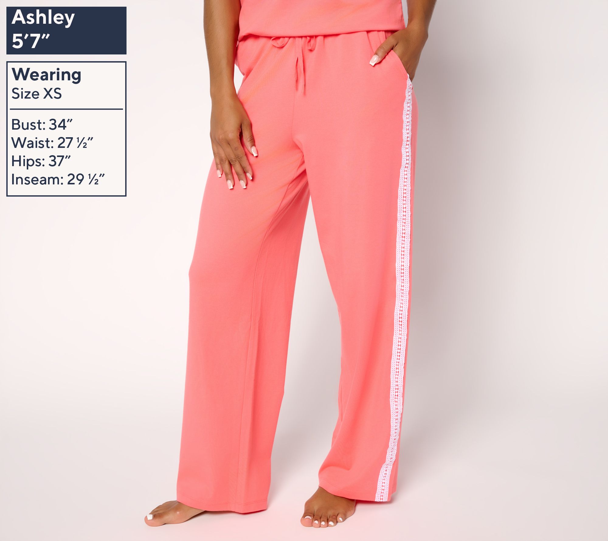 Feel fabulous while flexing your day in the ease and comfort of these straight-leg lounge pants. Perfect for a cozy night in or a casual day out, their Cottonwear+ fabric stretches for easy movement, while crochet trim adds a delightful touch to your style. From Cuddl Duds.