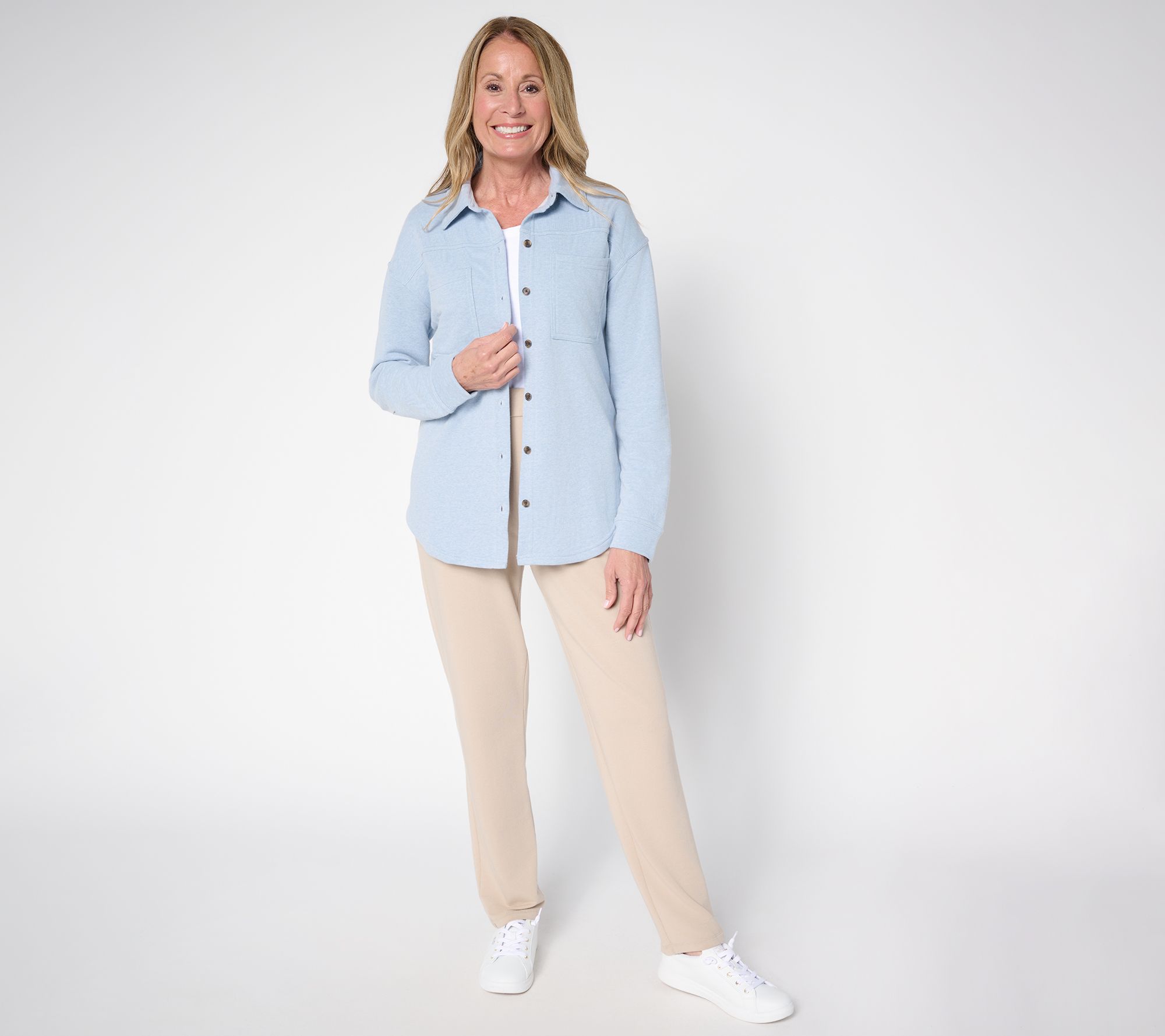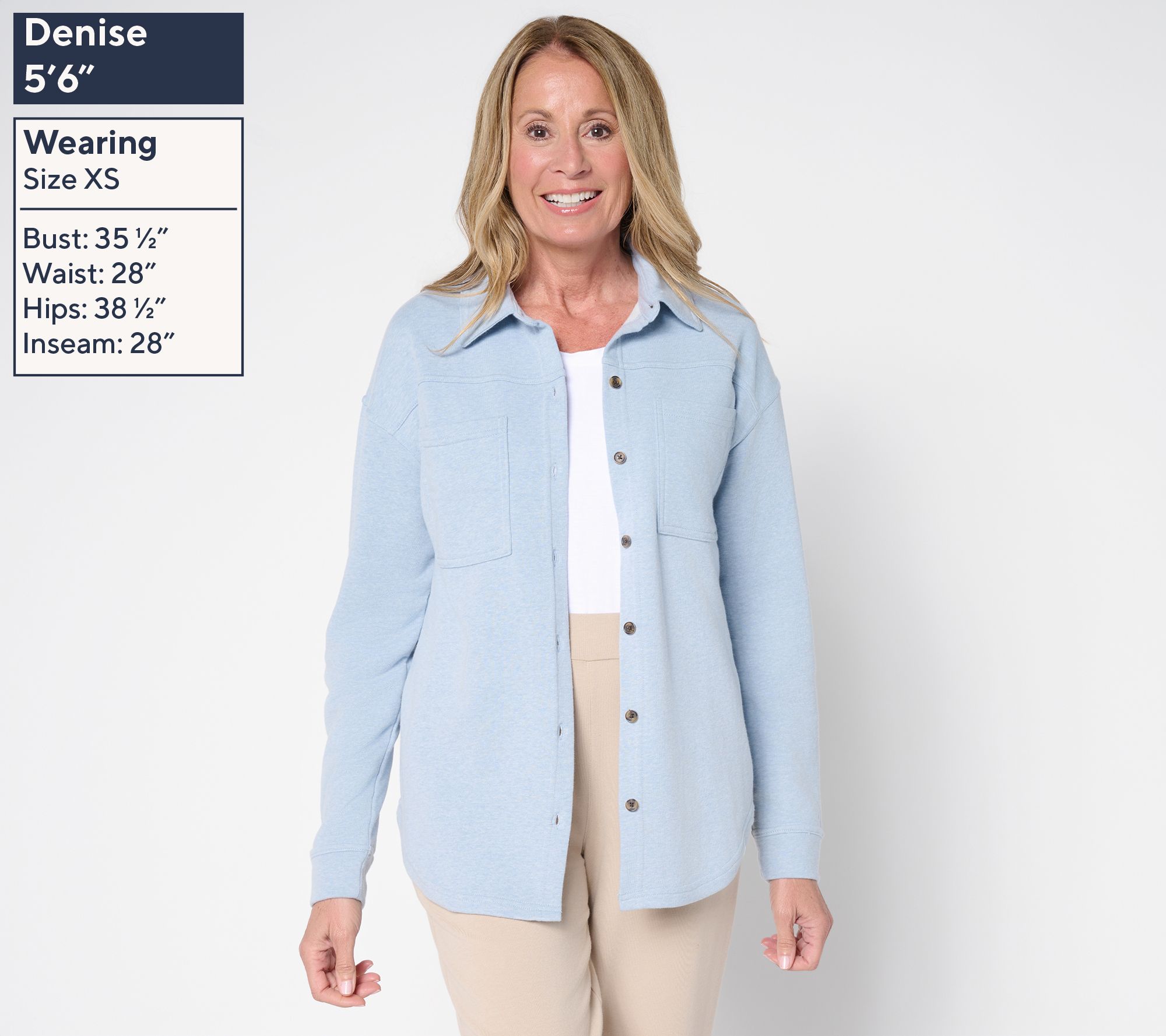 Whether you're building casual outfits for weekends or layering up for a relaxed day out, this knit shacket brings denim-inspired style to your everyday looks. The button-front design features a classic yoke structure, shirt collar, and handy chest pockets, all tailored in a semi-fitted silhouette for easy comfort. From Cuddl Duds.