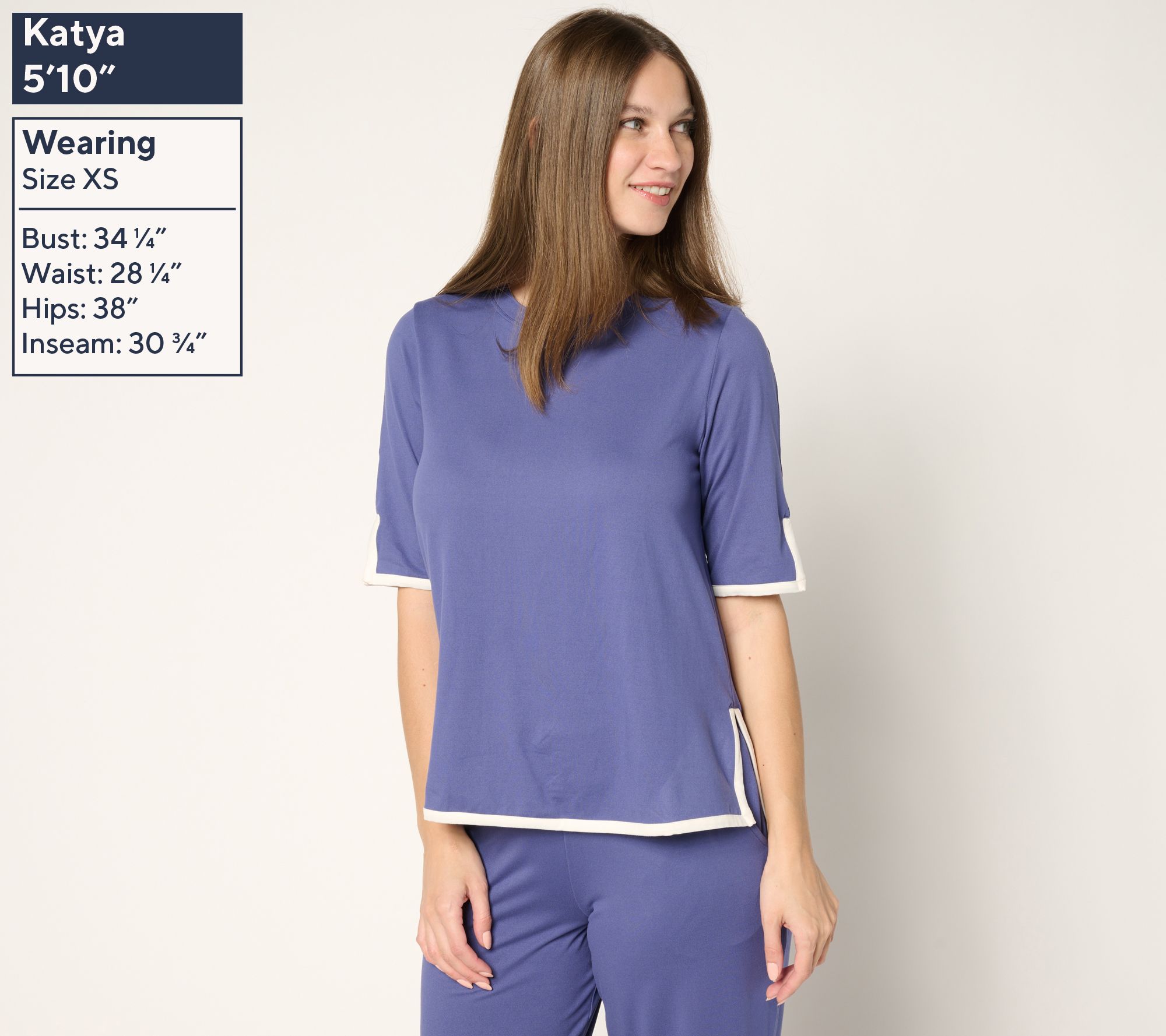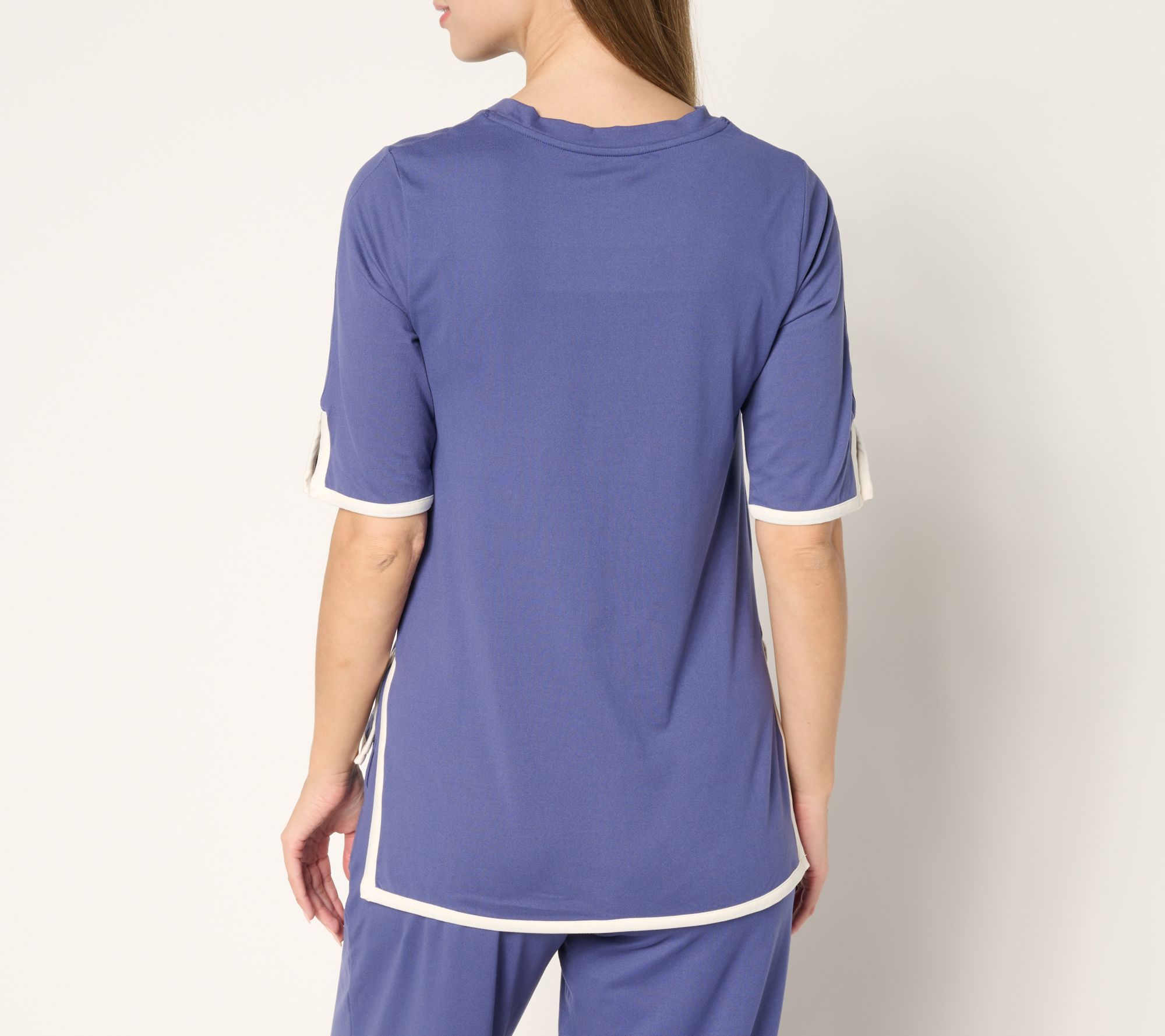 • Features: crewneck, elbow-length sleeves, contrast-color binding, side slits, step hem, moisture-wicking fabric