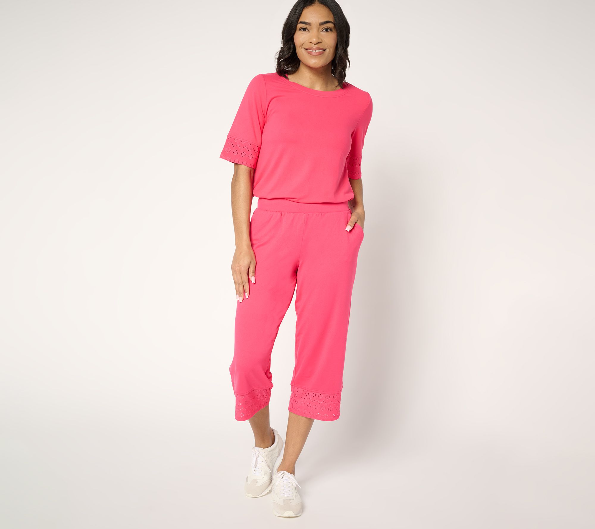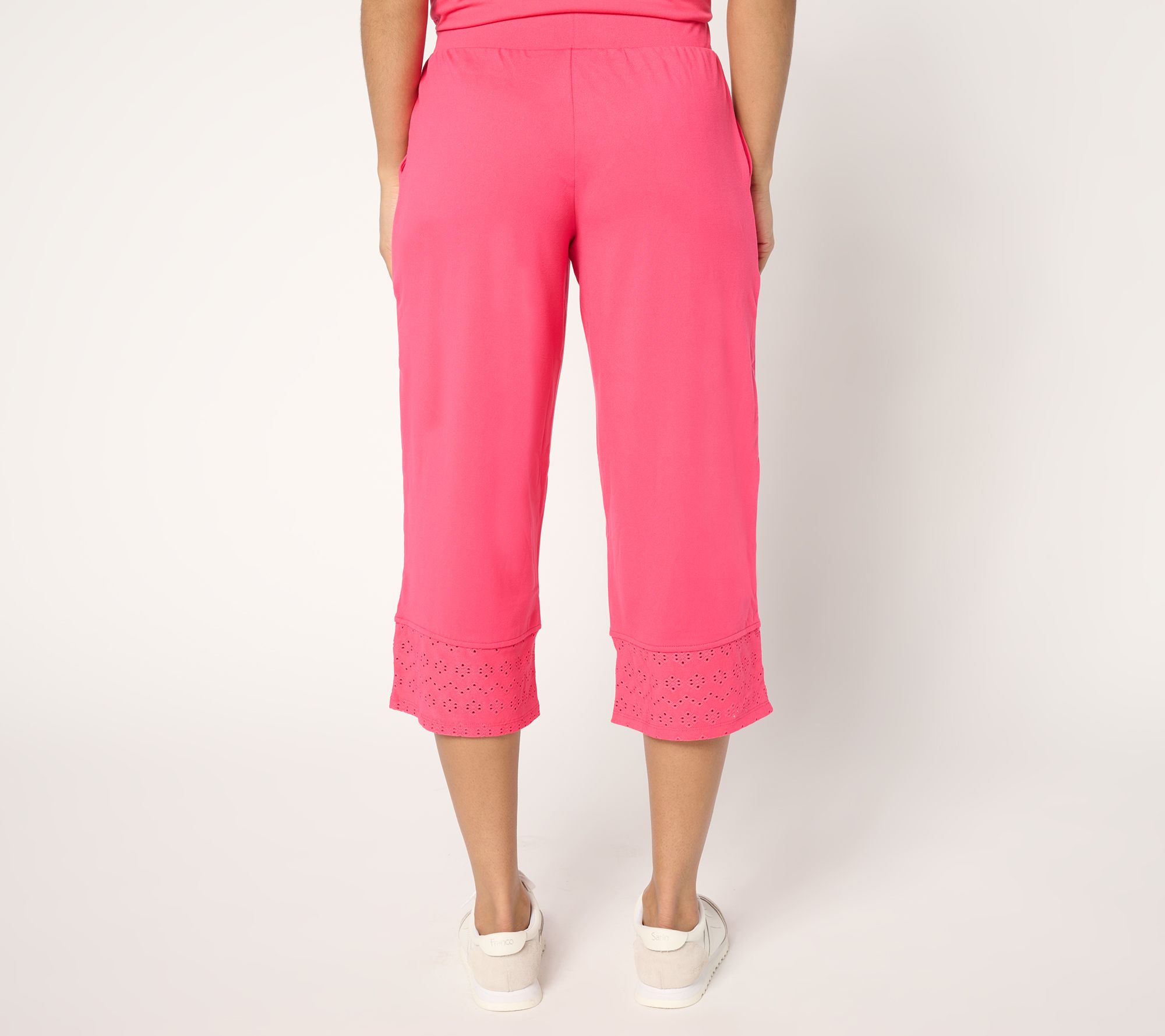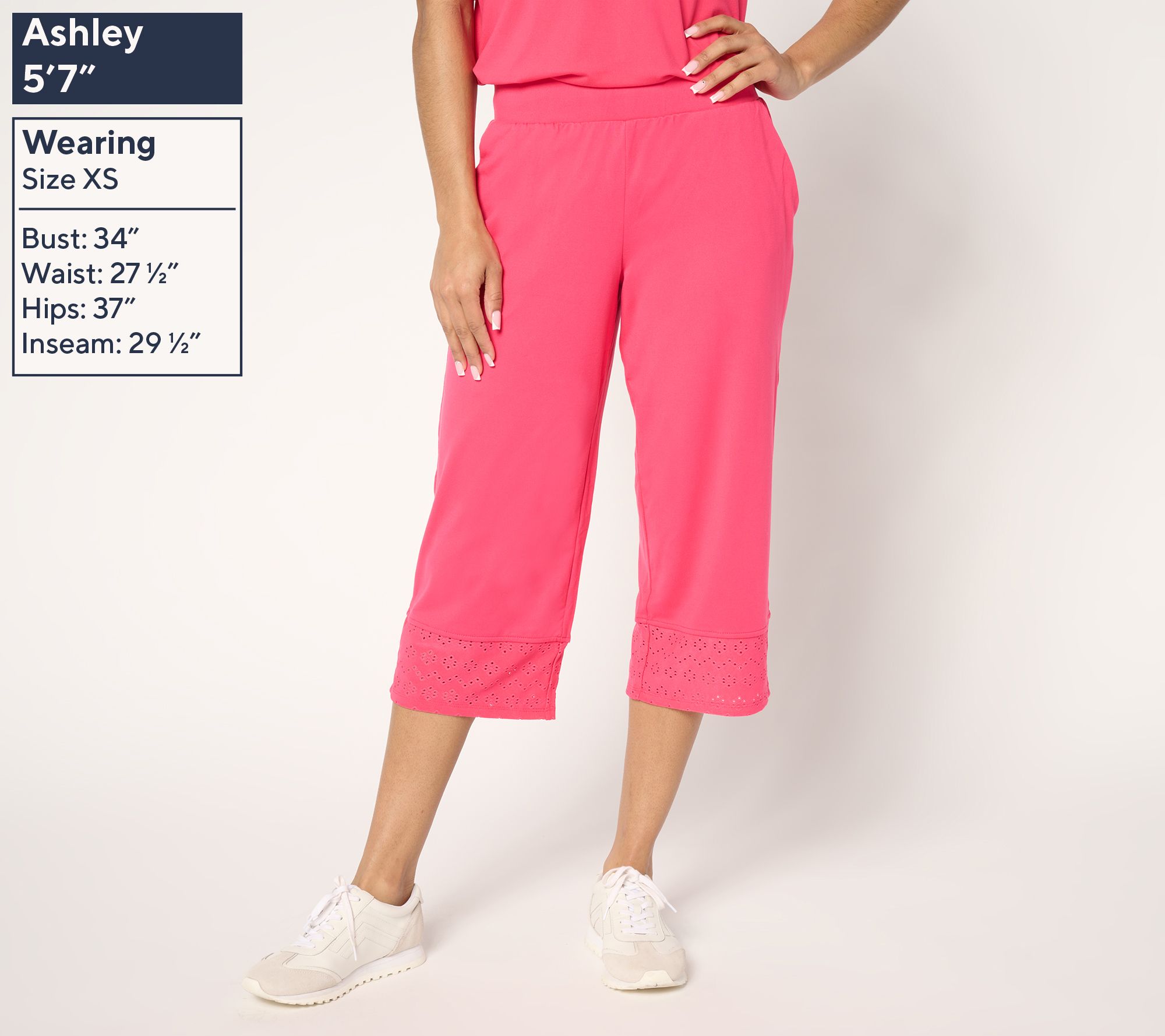 Cool as a cucumber. That's how you'll feel on a balmy day sporting these Cuddl Duds cropped pants. The airy eyelet trim lets the breeze waft right through, keeping you feeling cool and looking playfully chic. From Cuddl Duds.