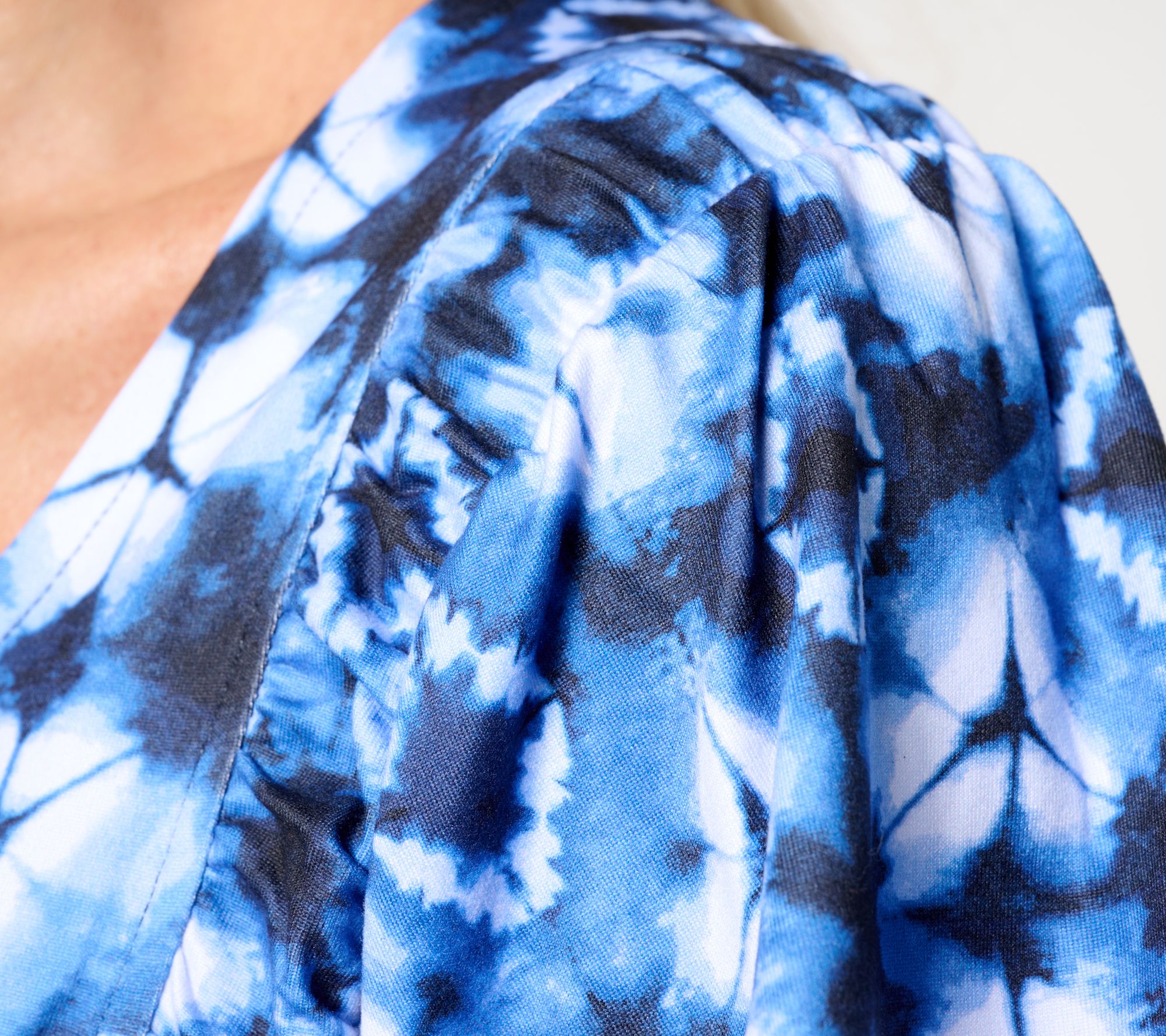 • Features: flutter sleeves, scoop neckline, princess seams, side slits, shirttail hem