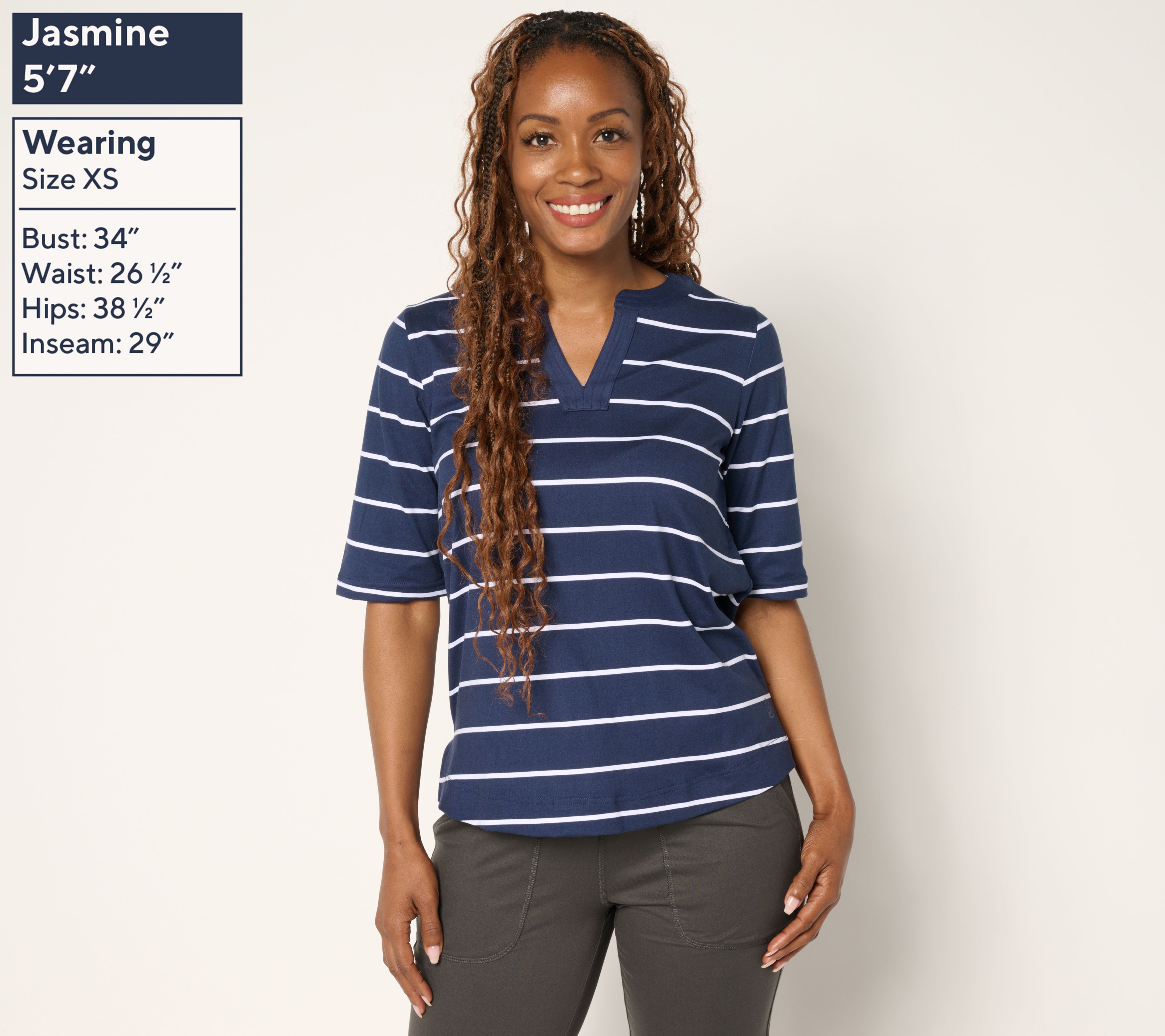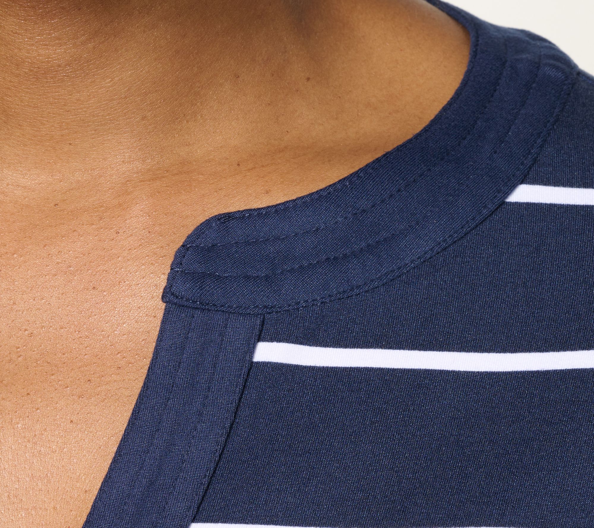 • Features: split V-neck, elbow-length sleeves, side slits, moisture-wicking fabric