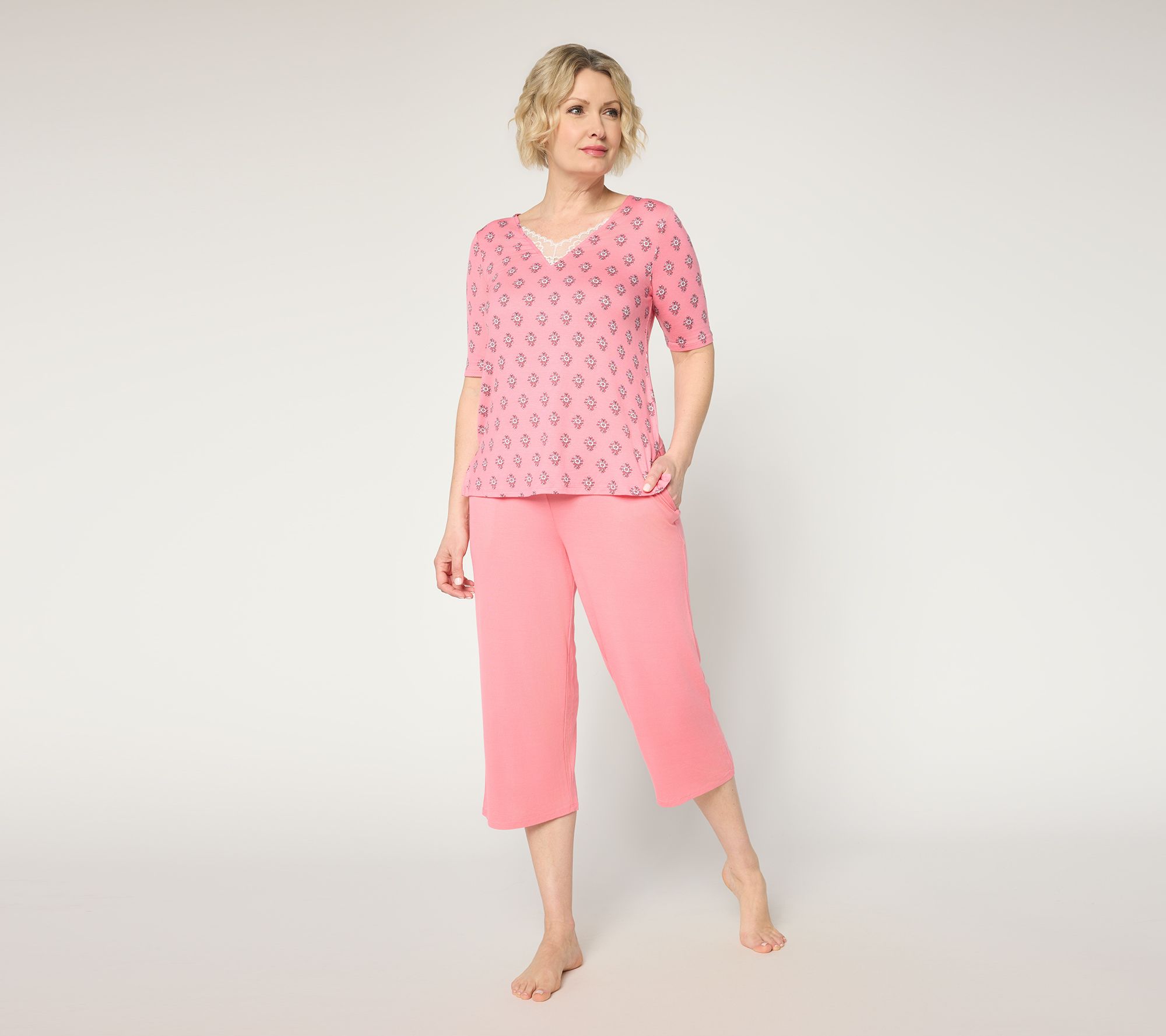 Style meets ease in this soft stretch tee, featuring a delicate lace insert at the V-neckline that adds a gentle touch of detail for workdays, weekend errands, or daily lounging. Elbow-length sleeves make this knit top a versatile choice for layering or wearing solo, easily paired with jeans or comfy leggings. From Cuddl Duds.