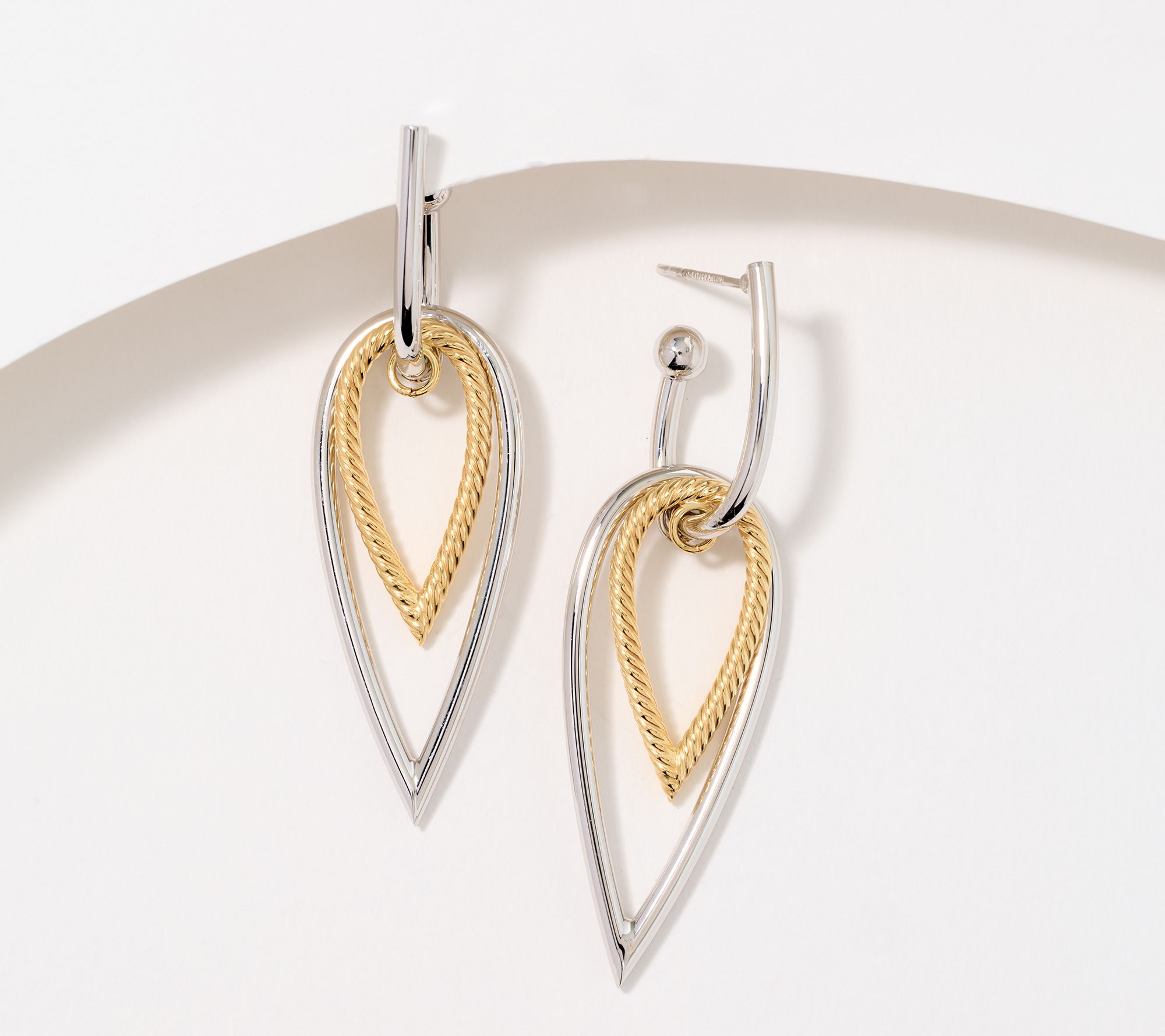• Polished, open, tear drop-shaped hoop with bead at end; small polished and large ribbed, inverted teardrop-shaped hoop dangles below