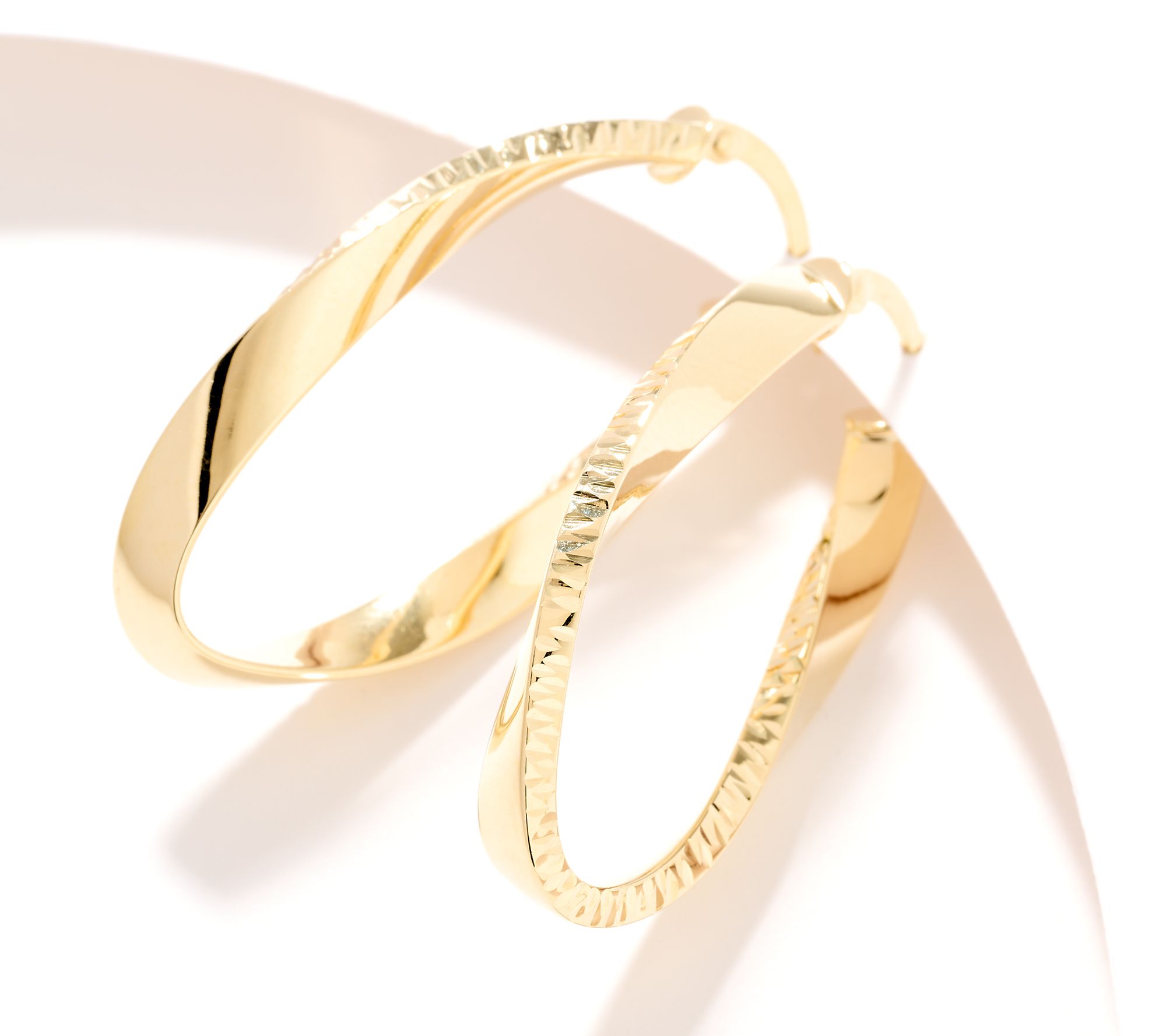 • Oval-shaped hoop with a twist; diamond-cut accents, left-right design; polished finish