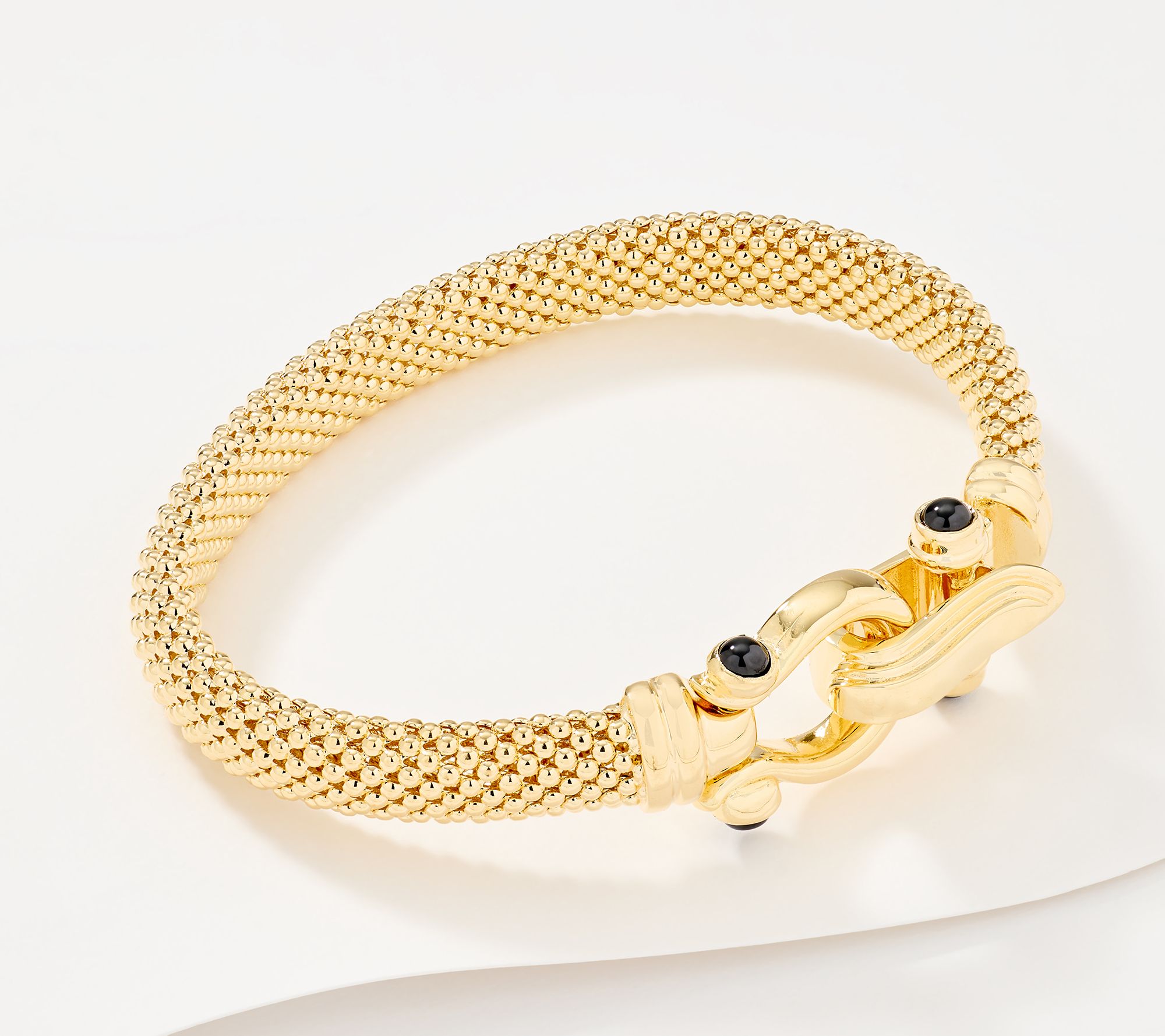 Make your mark. Add notice-me-now style to any look with this mesh status bangle, featuring a sleek buckle clasp accented by black spinel gemstones. Thanks to rich Italian craftsmanship, it's got a moneyed look that won't make a dent in your wallet. From David Markstein.