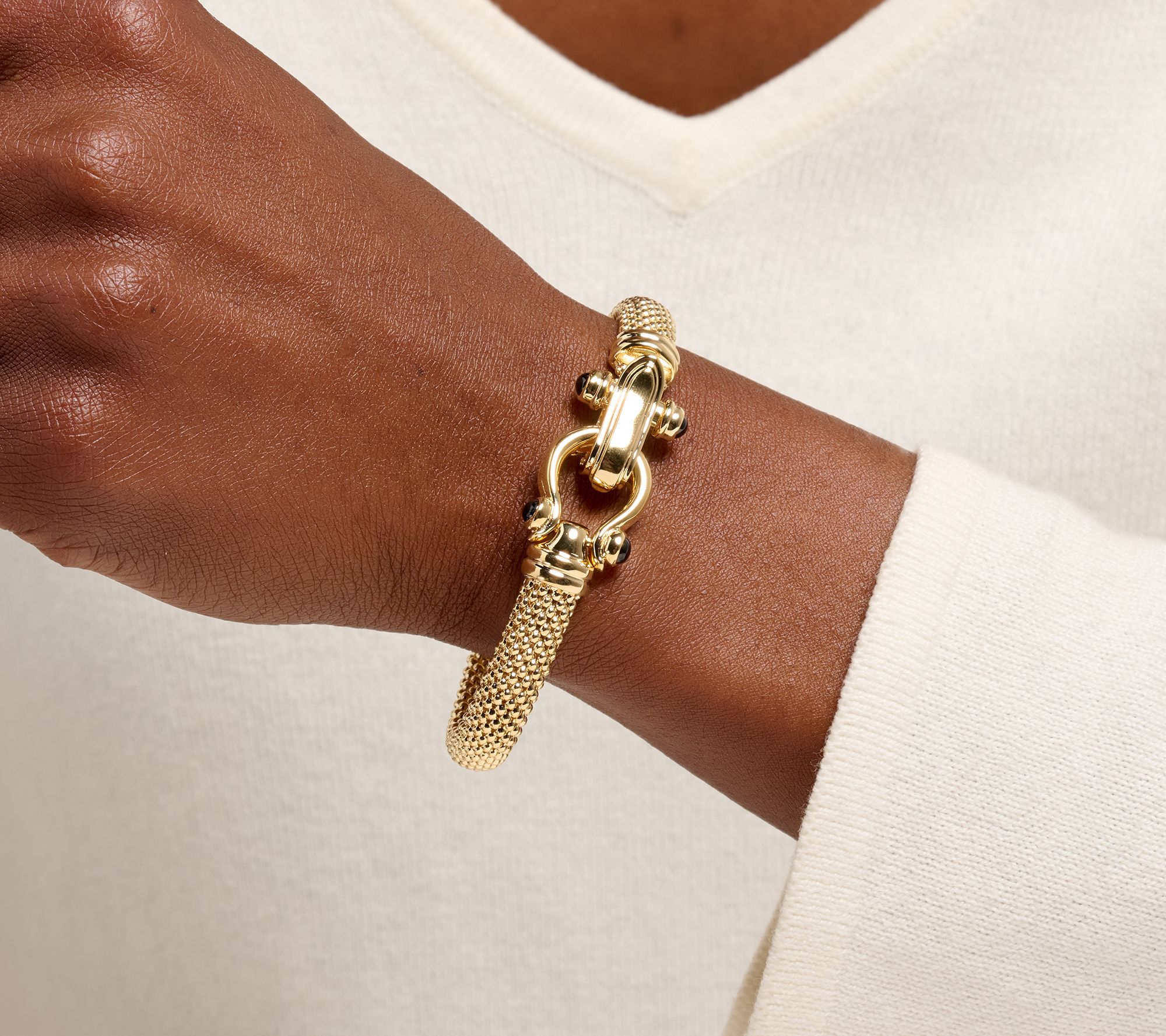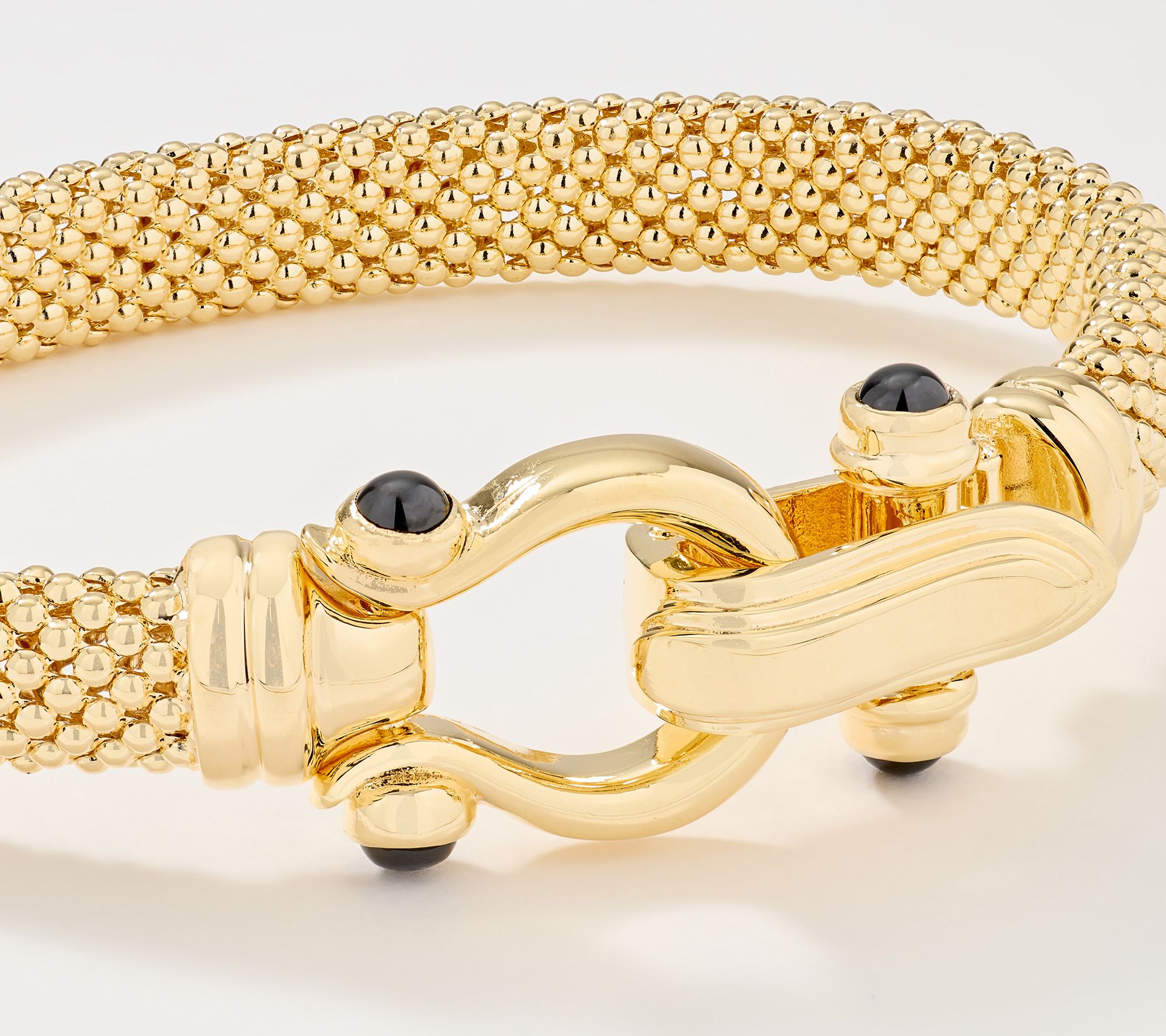 • Oval mesh bangle design; black spinel gemstone accents; polished finish