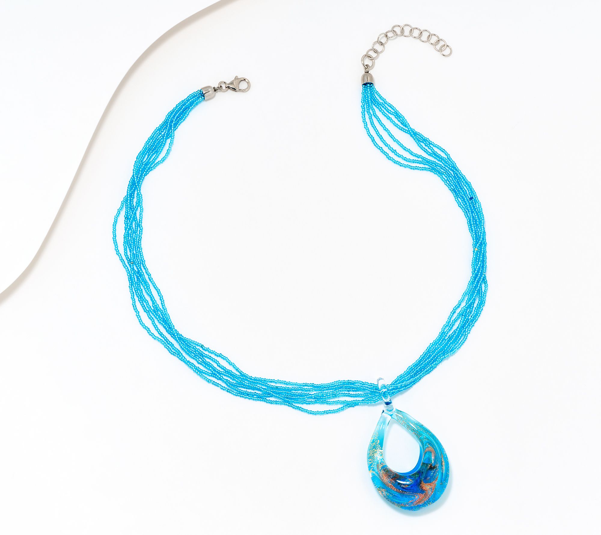 • Multi-strand conteria beaded necklace; open teardrop-shaped Murano glass pendant with golden accents and glittery details; glass bail