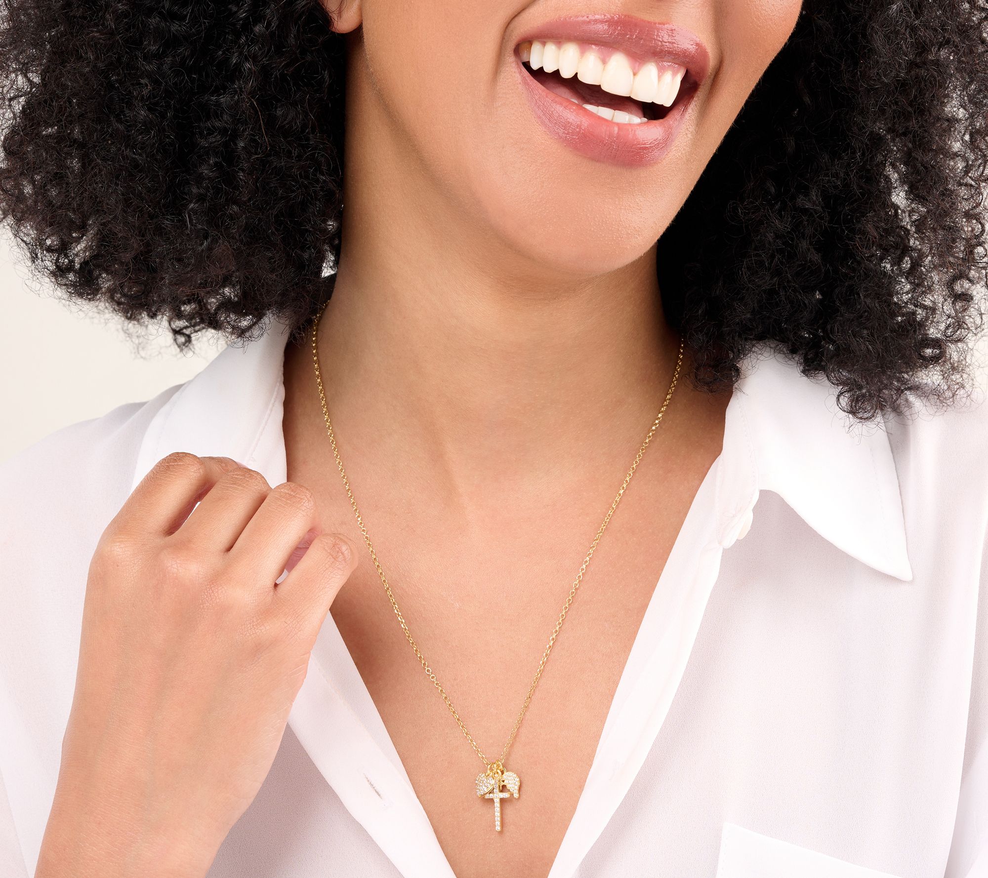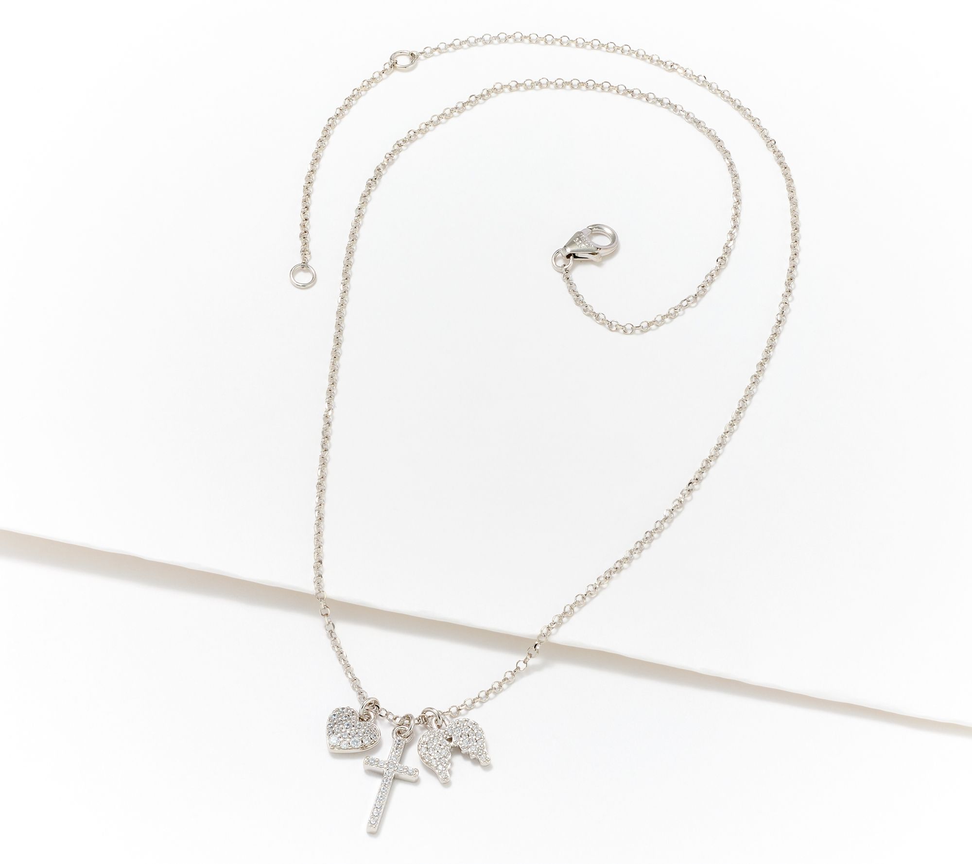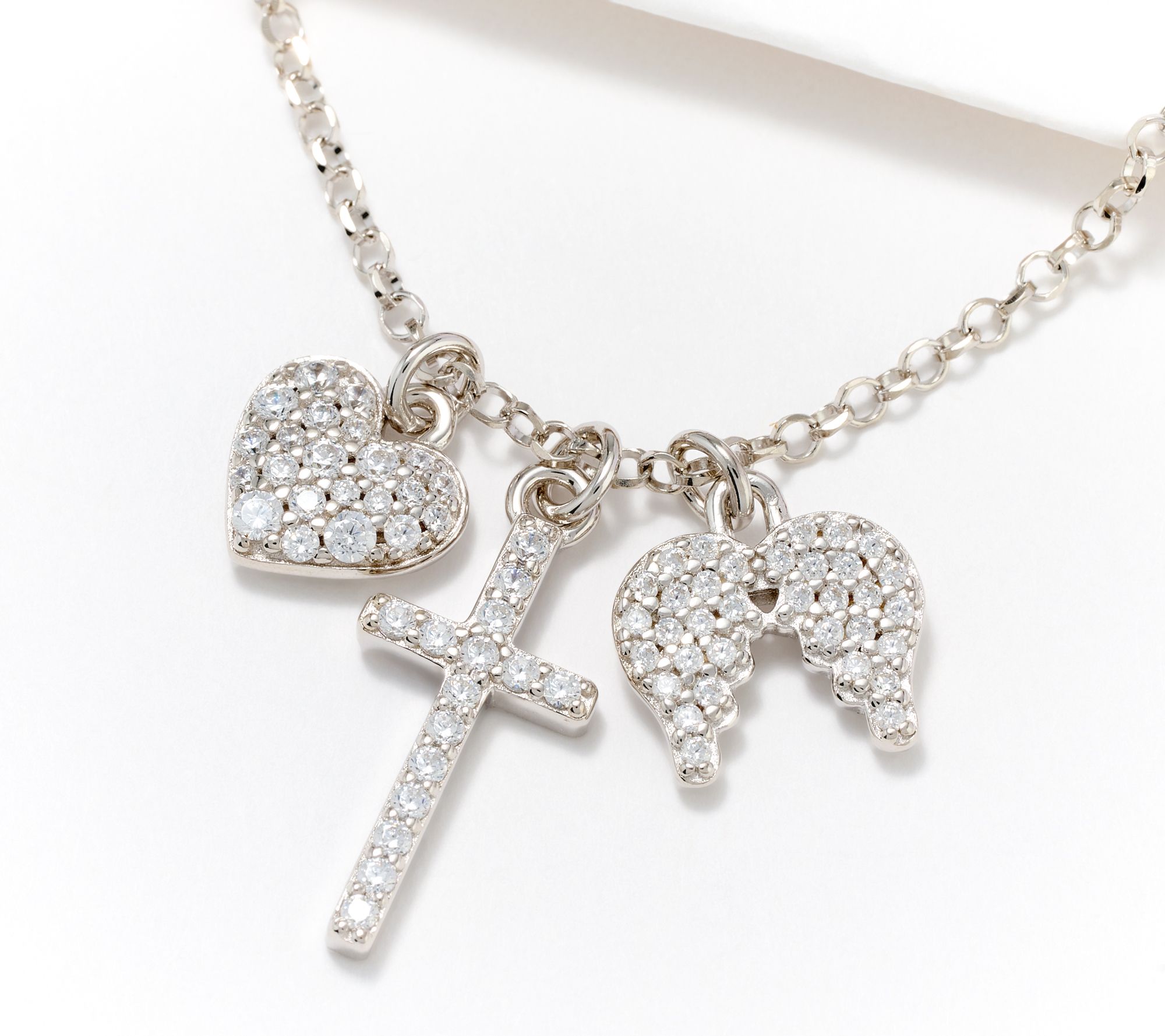 • Diamond-cut rolo-link chain featuring three pendants (heart, wings, and cross) with prong-set, round cubic zirconia; polished bails