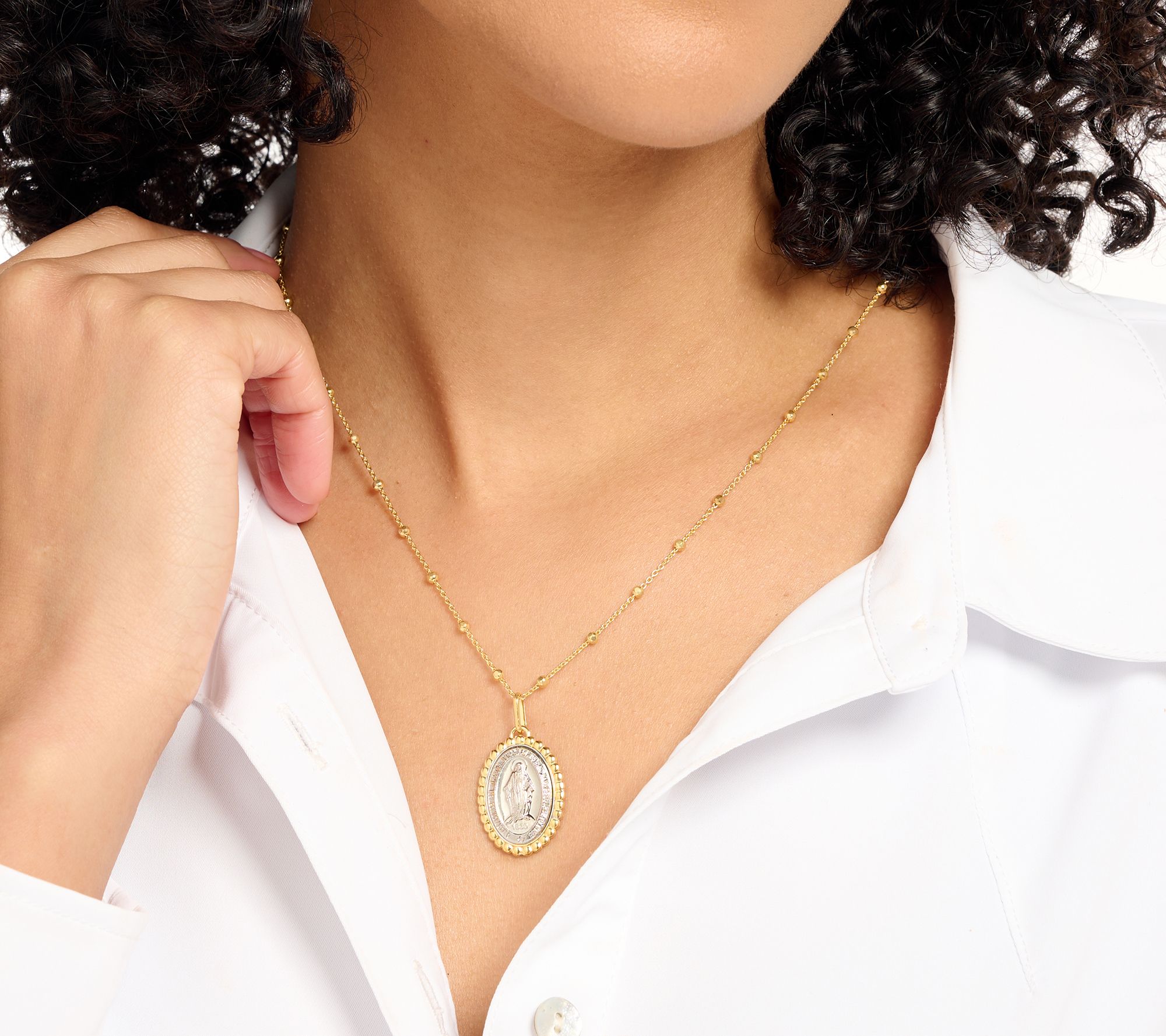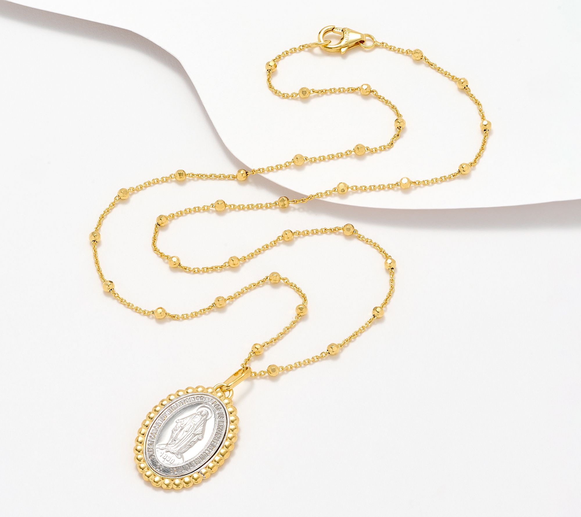• Miraculous Mary medallion with beaded frame; mini rolo chain with 2.5mm diamond-cut bead stations; oval bail