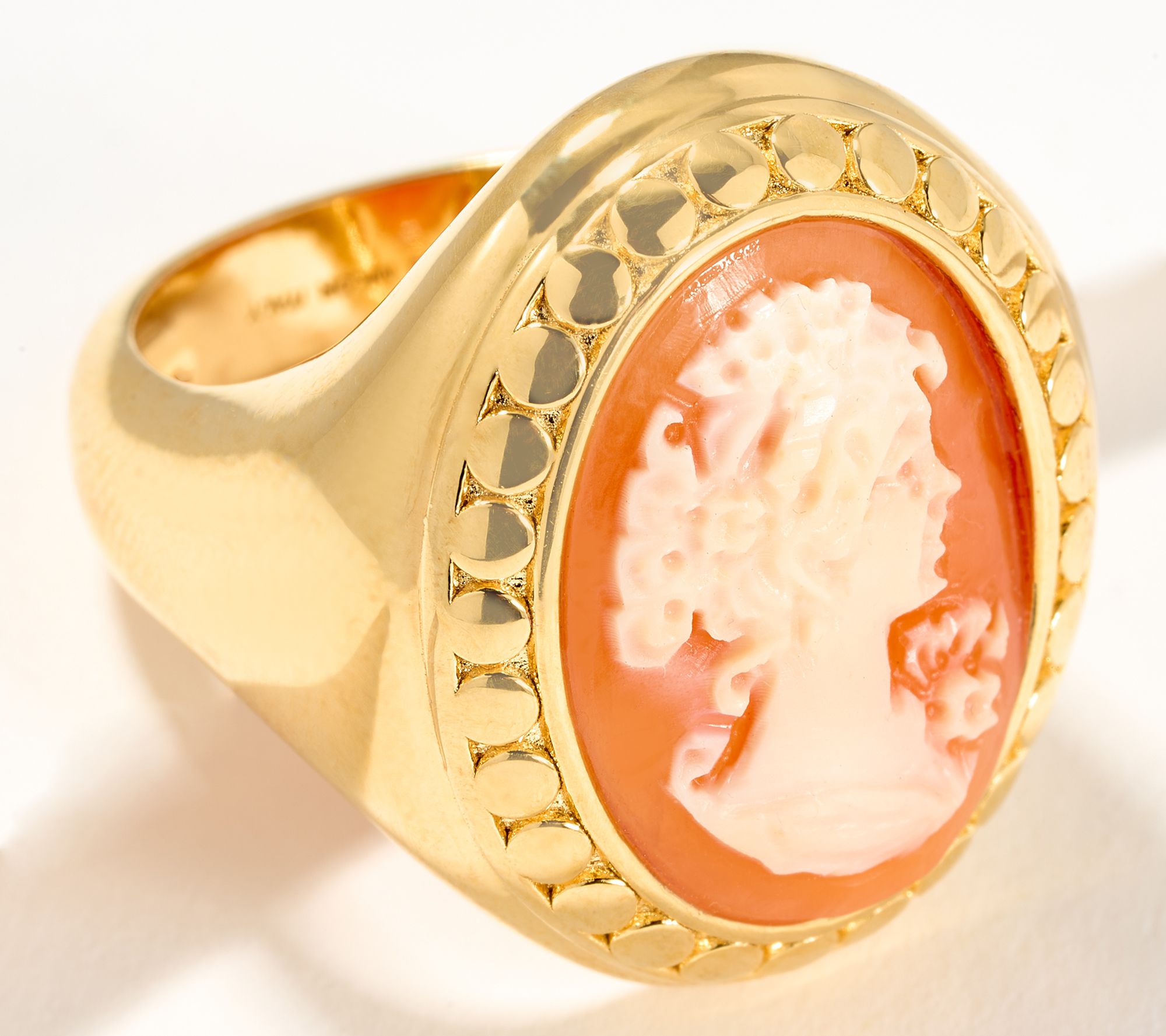 An elegant design with vintage charm, this exquisite oval cameo ring boasts a beaded frame to showcase the gorgeous engraved portrait. From David Markstein.