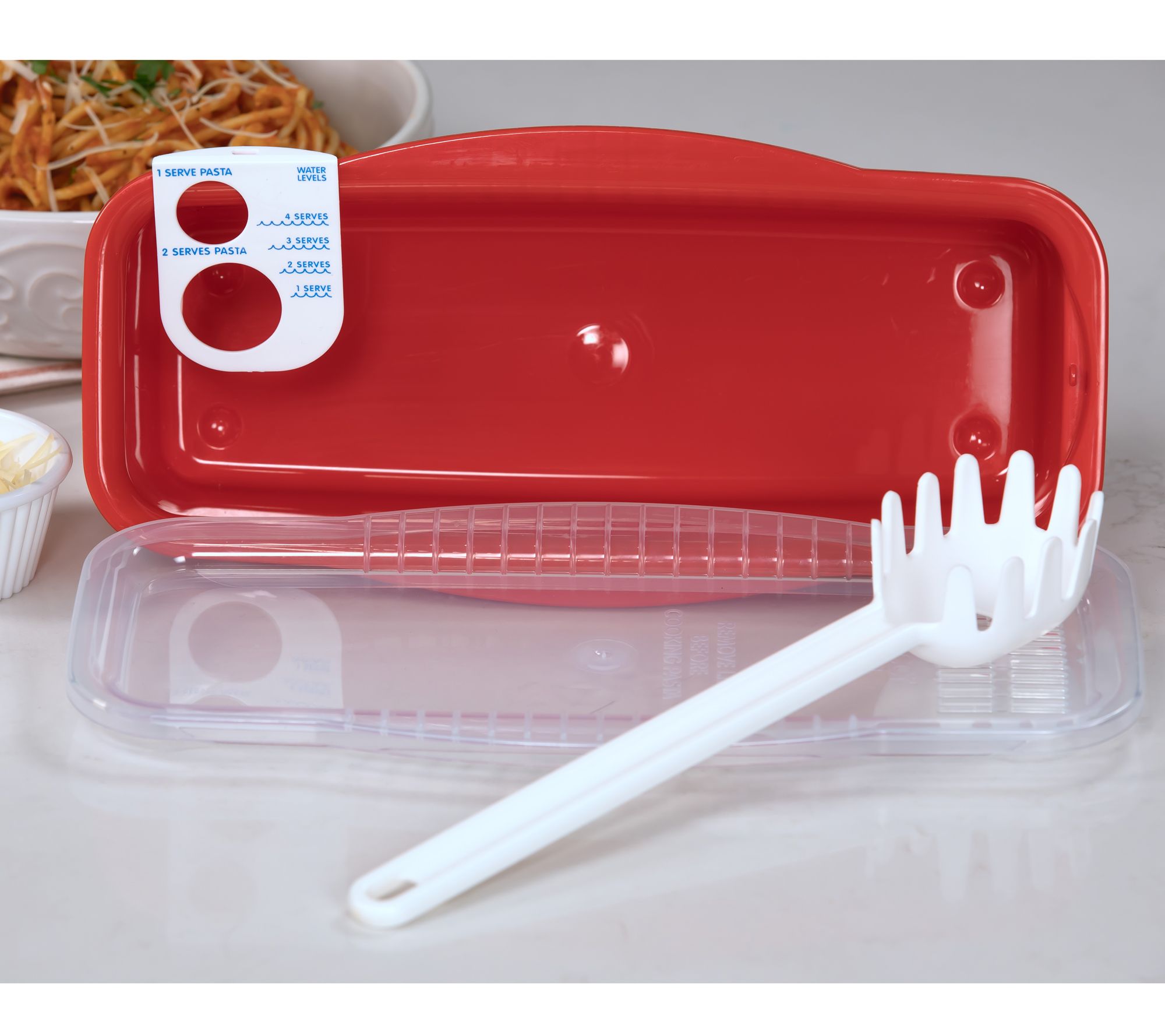 • Includes two microwave pasta cookers with drainage lids, two pasta server utensils, and two measuring utensils