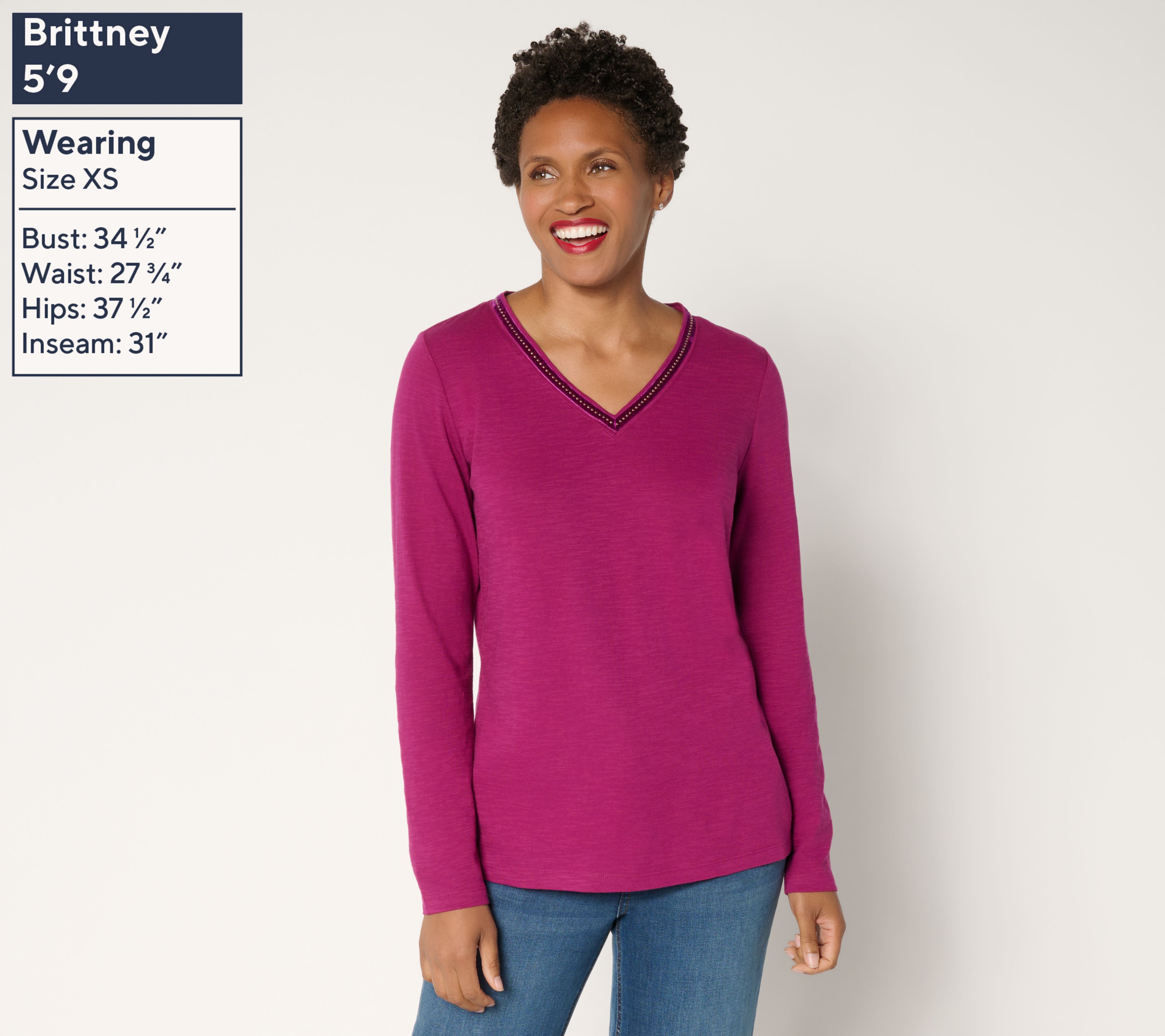 • Features: V-neckline, embellished trim around the neckline, long sleeves, straight bottom hem