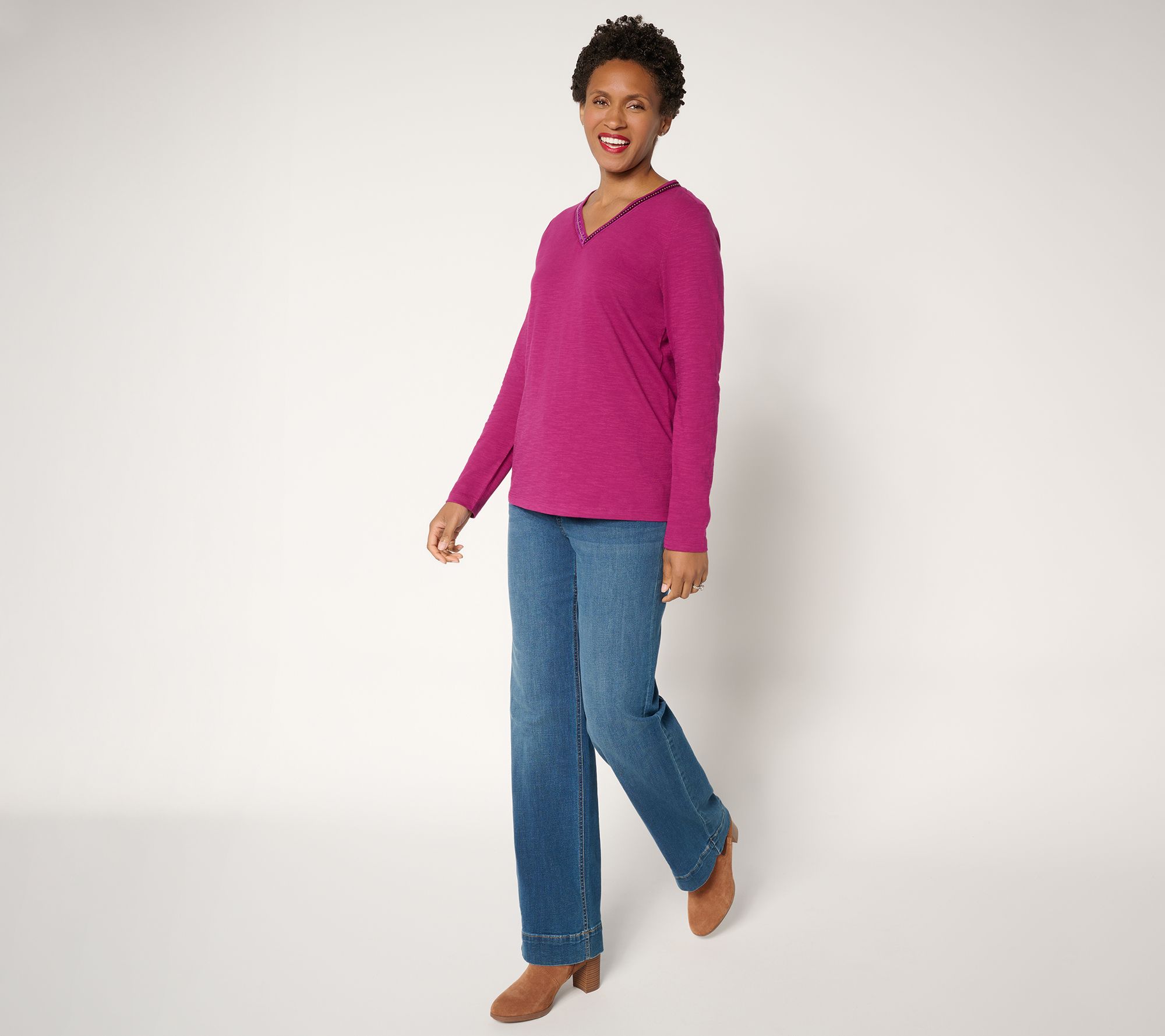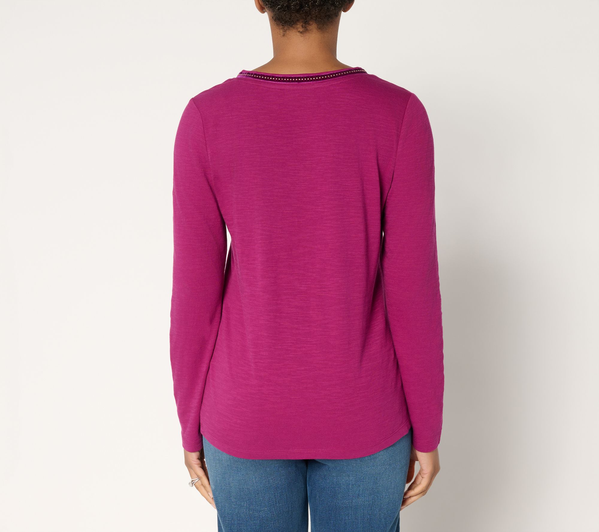 Whether you're updating your casual wardrobe or adding a cheerful touch to your day, this long-sleeve cotton top brings effortless comfort to any occasion. Distinctive embellished trim frames the V-neckline, making it a standout option at social gatherings or relaxed afternoons. From Denim & Co.® Fashions.