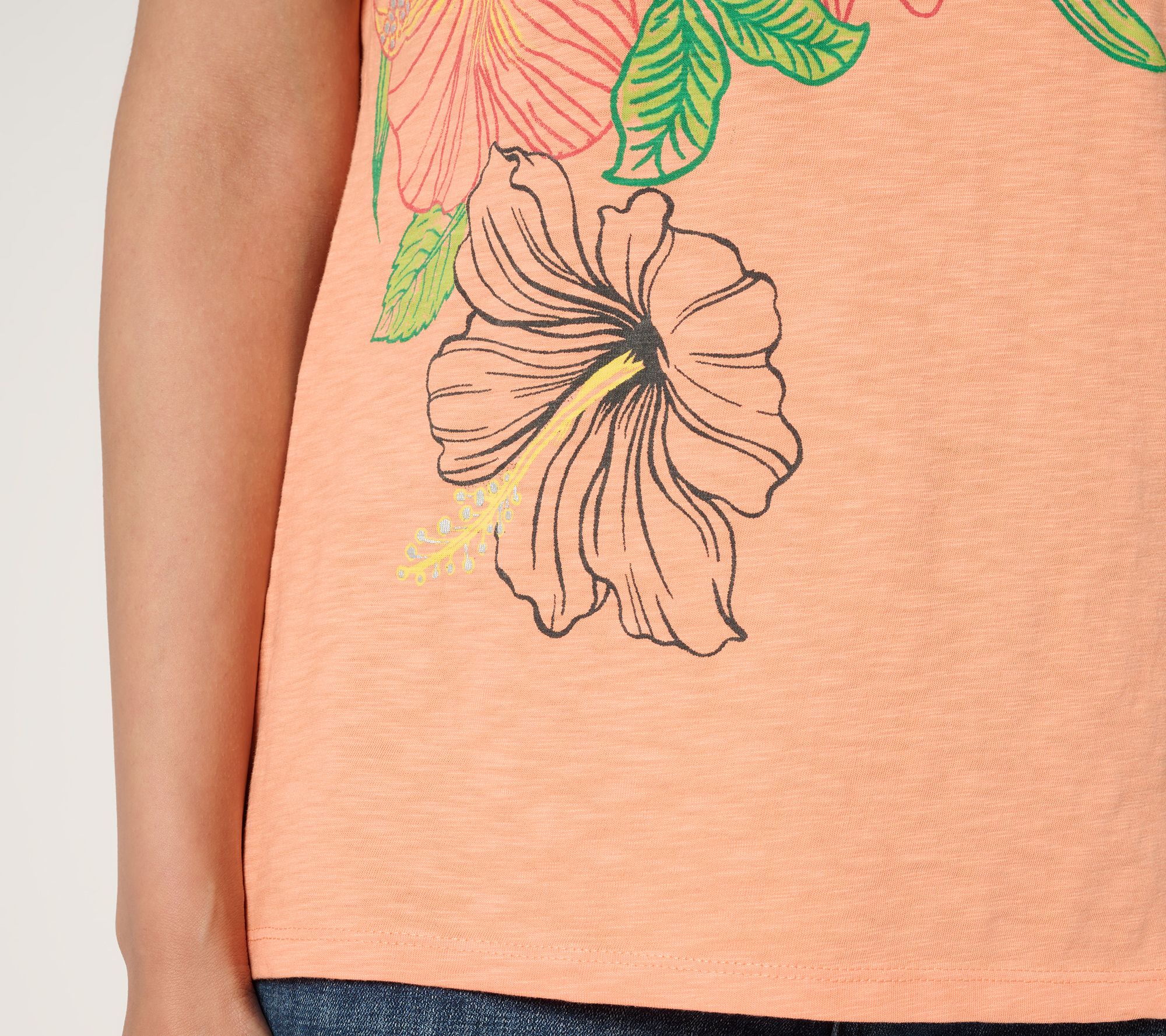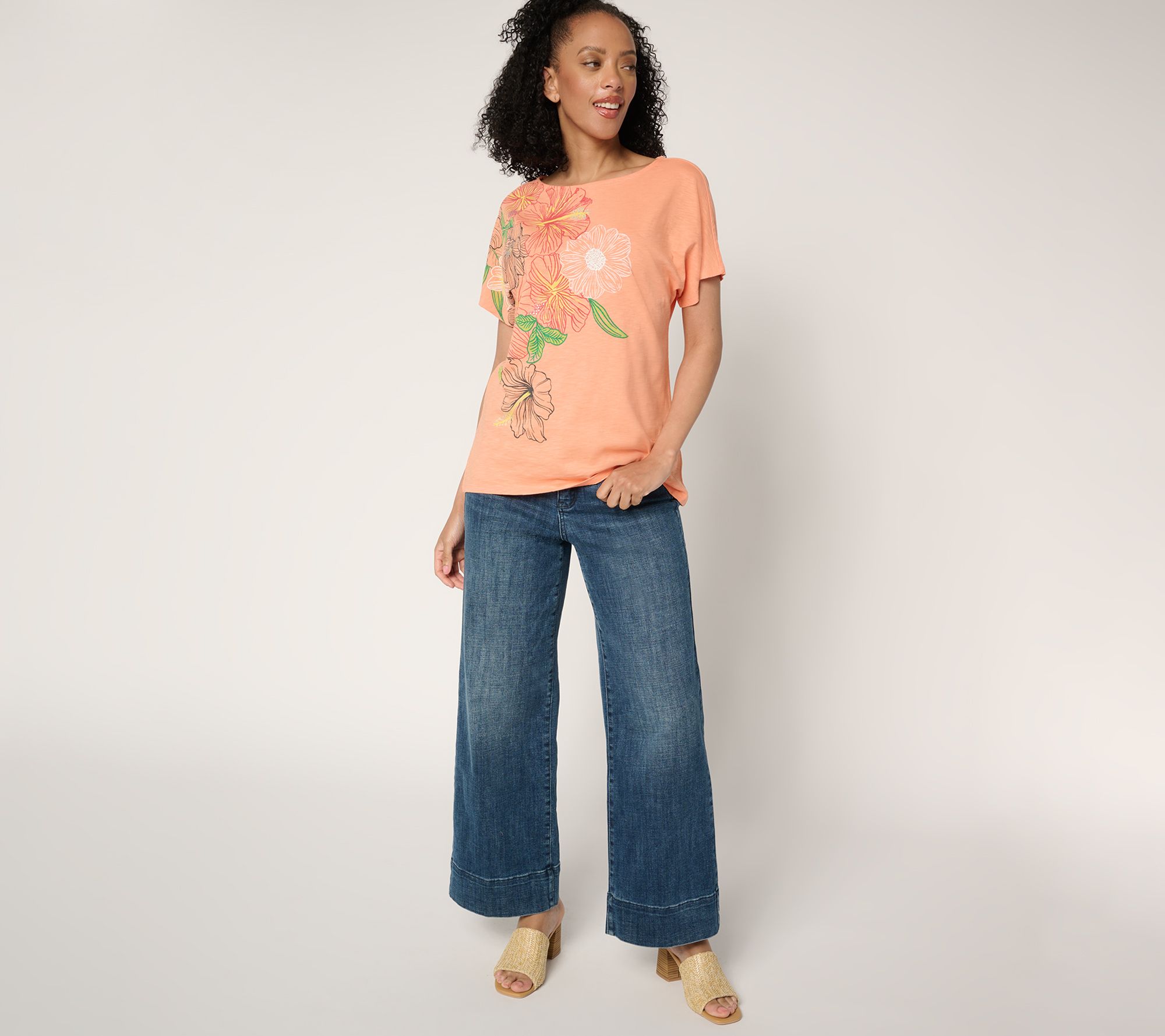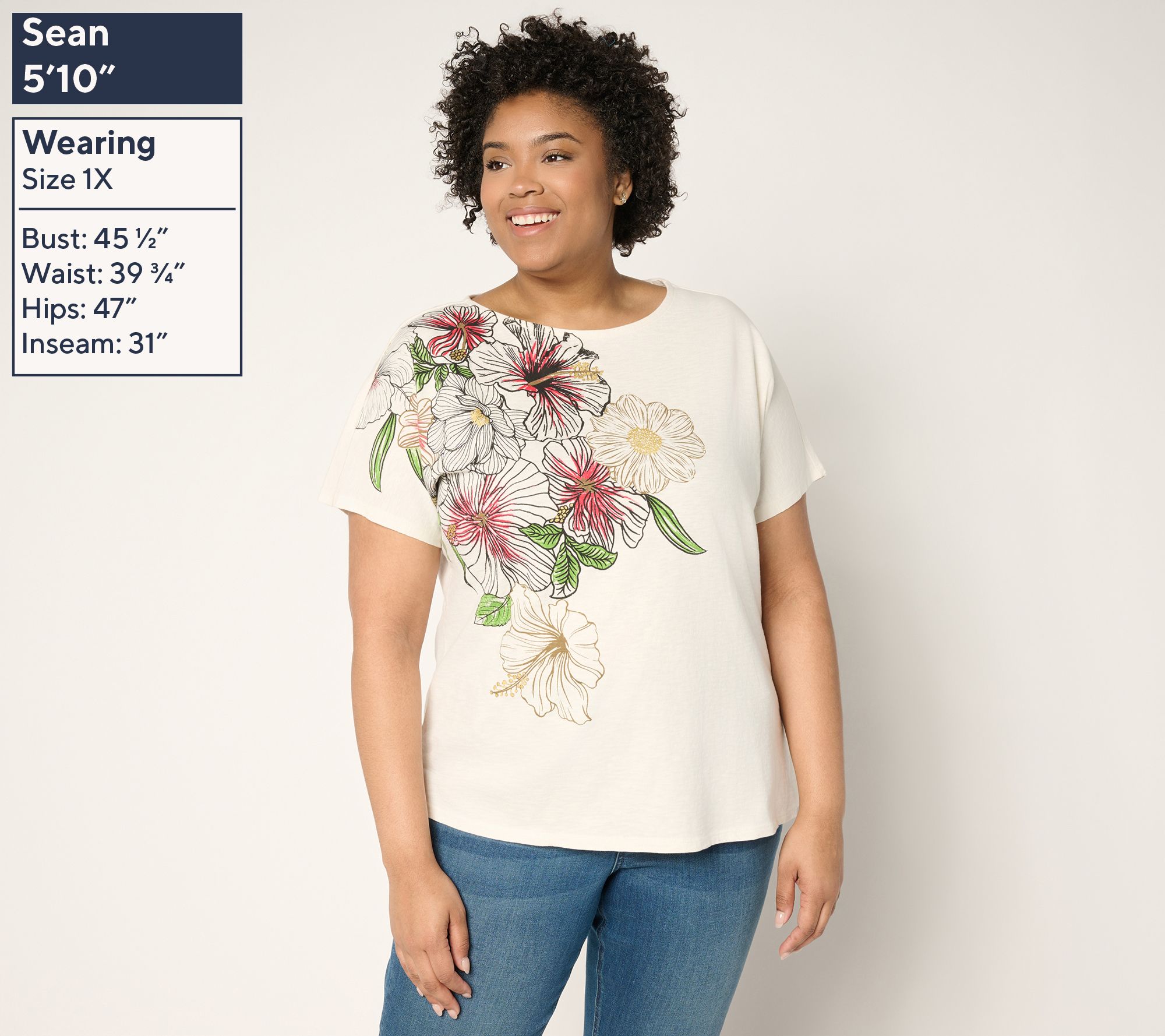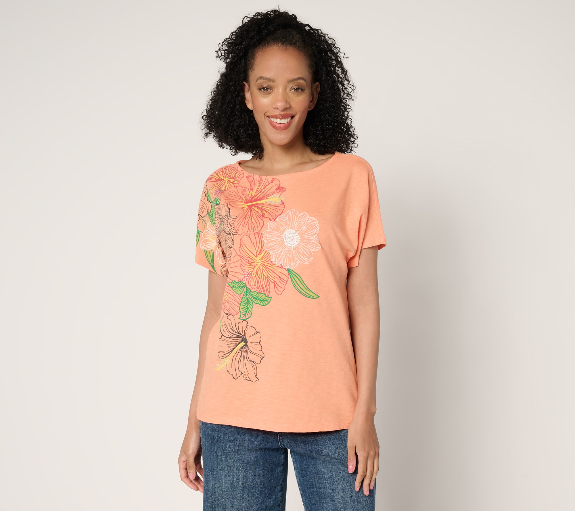 Fresh for casual outings or relaxed weekends, this 100% cotton slub knit top features eye-catching floral lineart that flows diagonally from the hem to the shoulder. Pair with your favorite jeans or shorts for an effortlessly stylish ensemble. From Denim & Co.® Fashions.